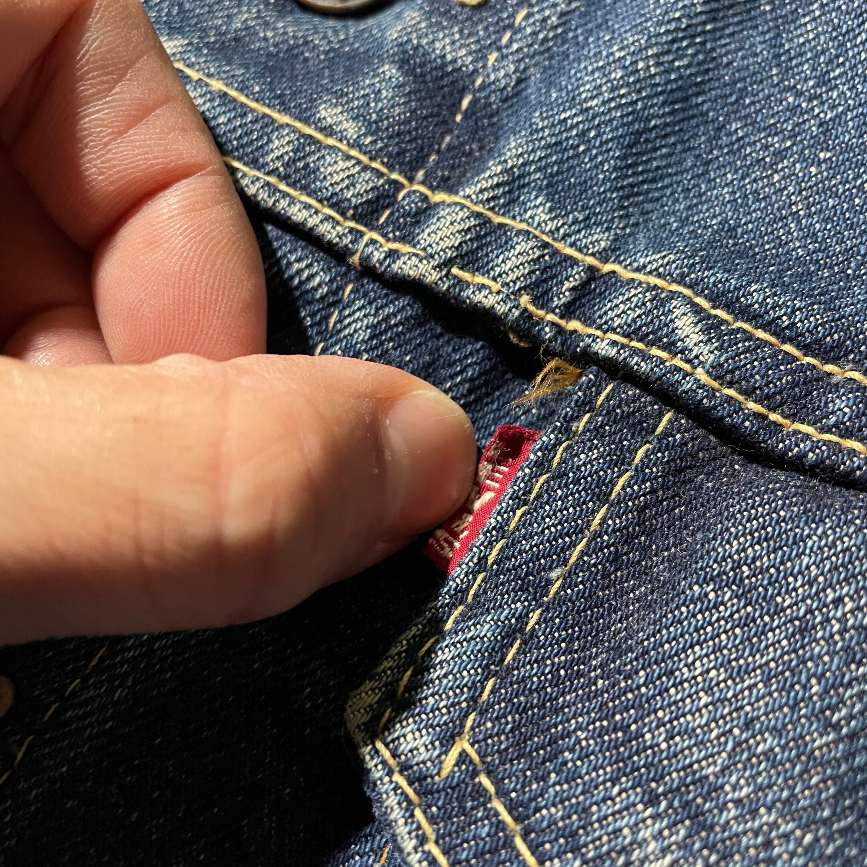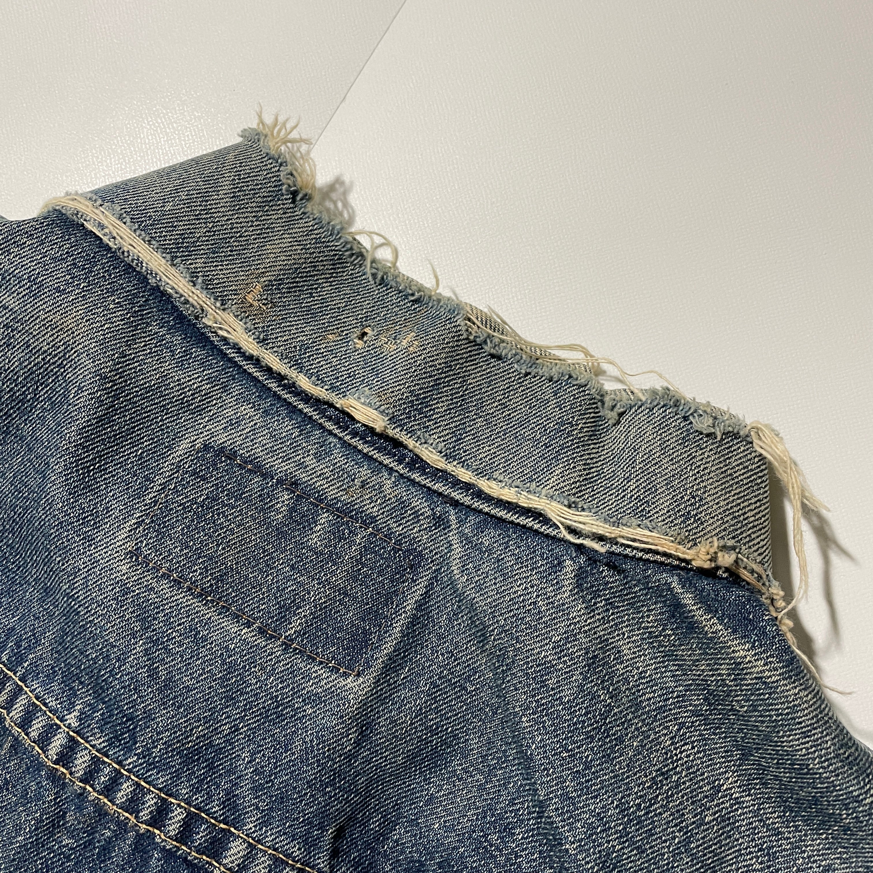 70505-0217とありますが身幅の広いシルエット、ボタン裏D、イエローステッチとオレンジステッチ混在、均等V等から557 3rdからの過渡期モデルと推測します。