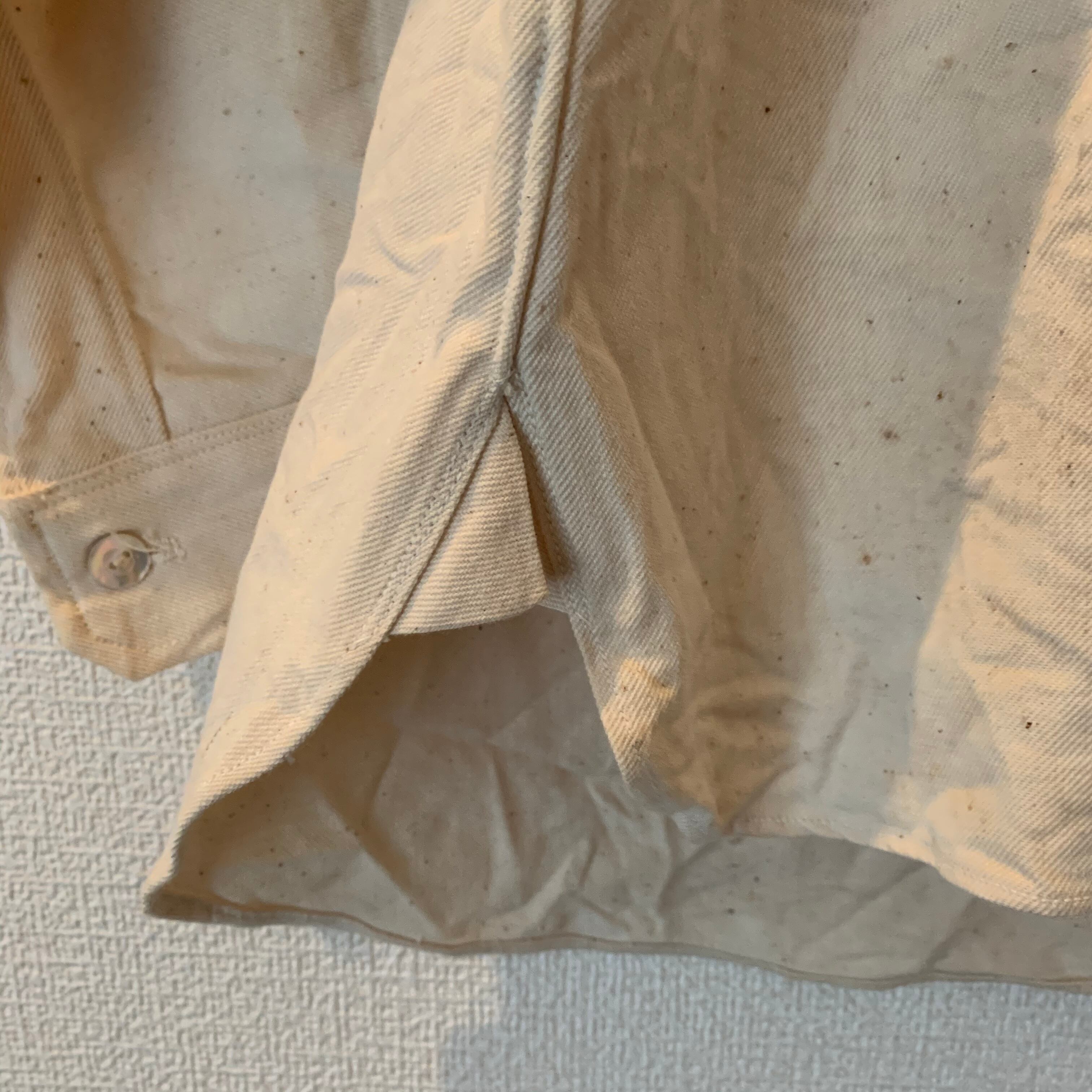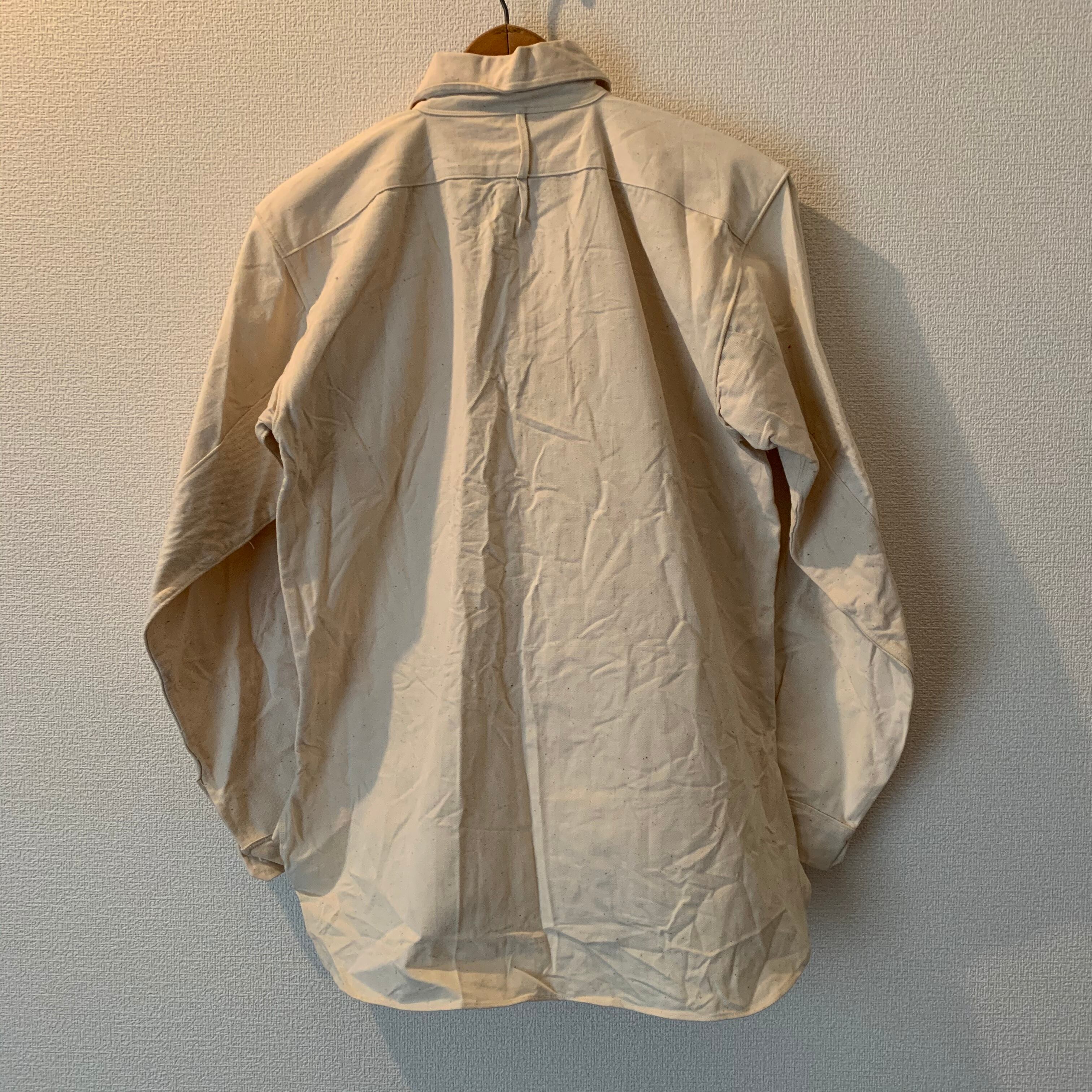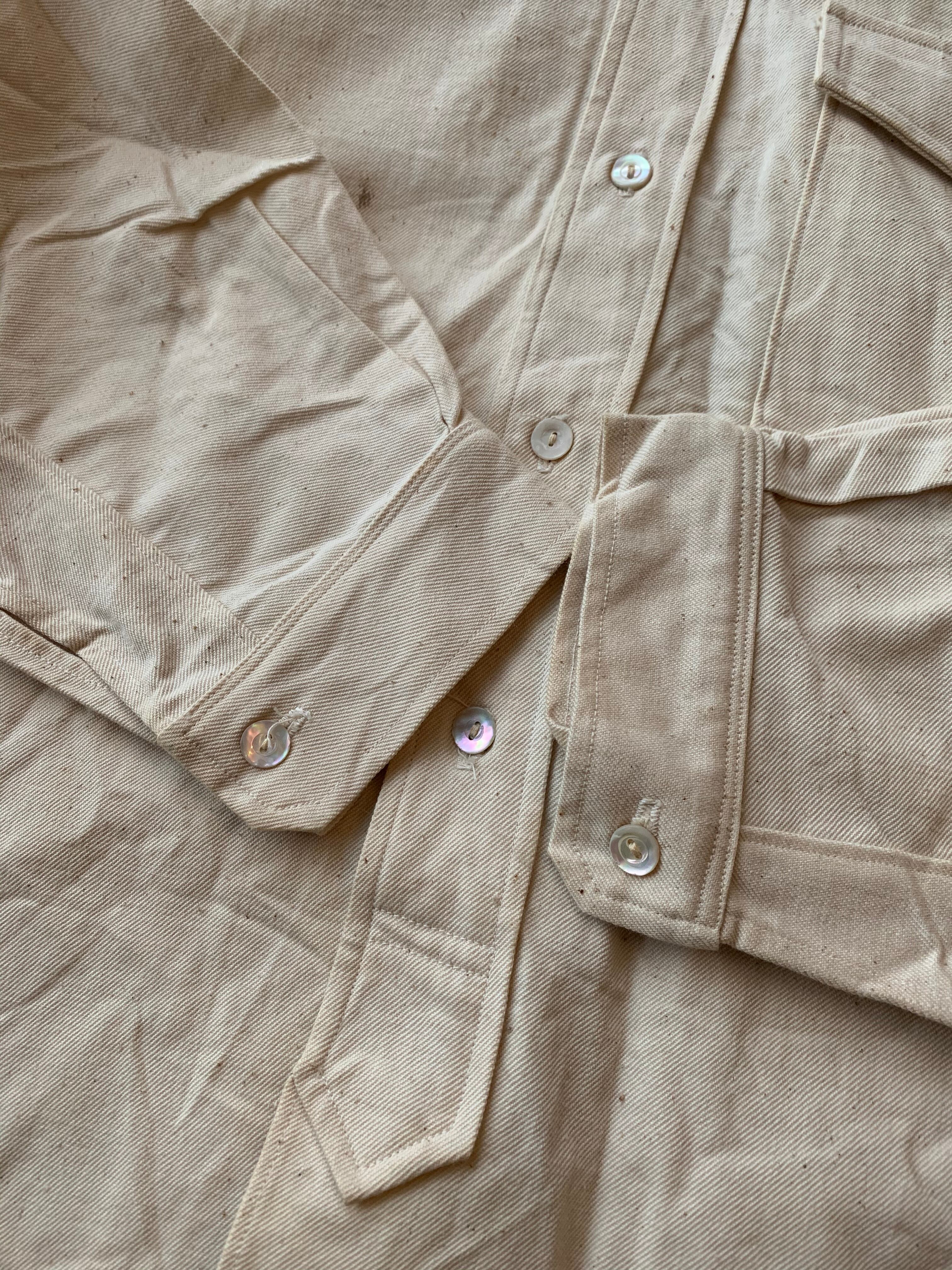 恐らく戦前-戦後に作られたと思われる生成りシャツ。白蝶貝ボタンを使用しマチ付きという高級シャツ仕様ながら簡素な作りは作業用シャツの様な印象を受けます。生地はゴツめのコットン、一度も洗われた形跡が無いのでデッドストックと思われます。