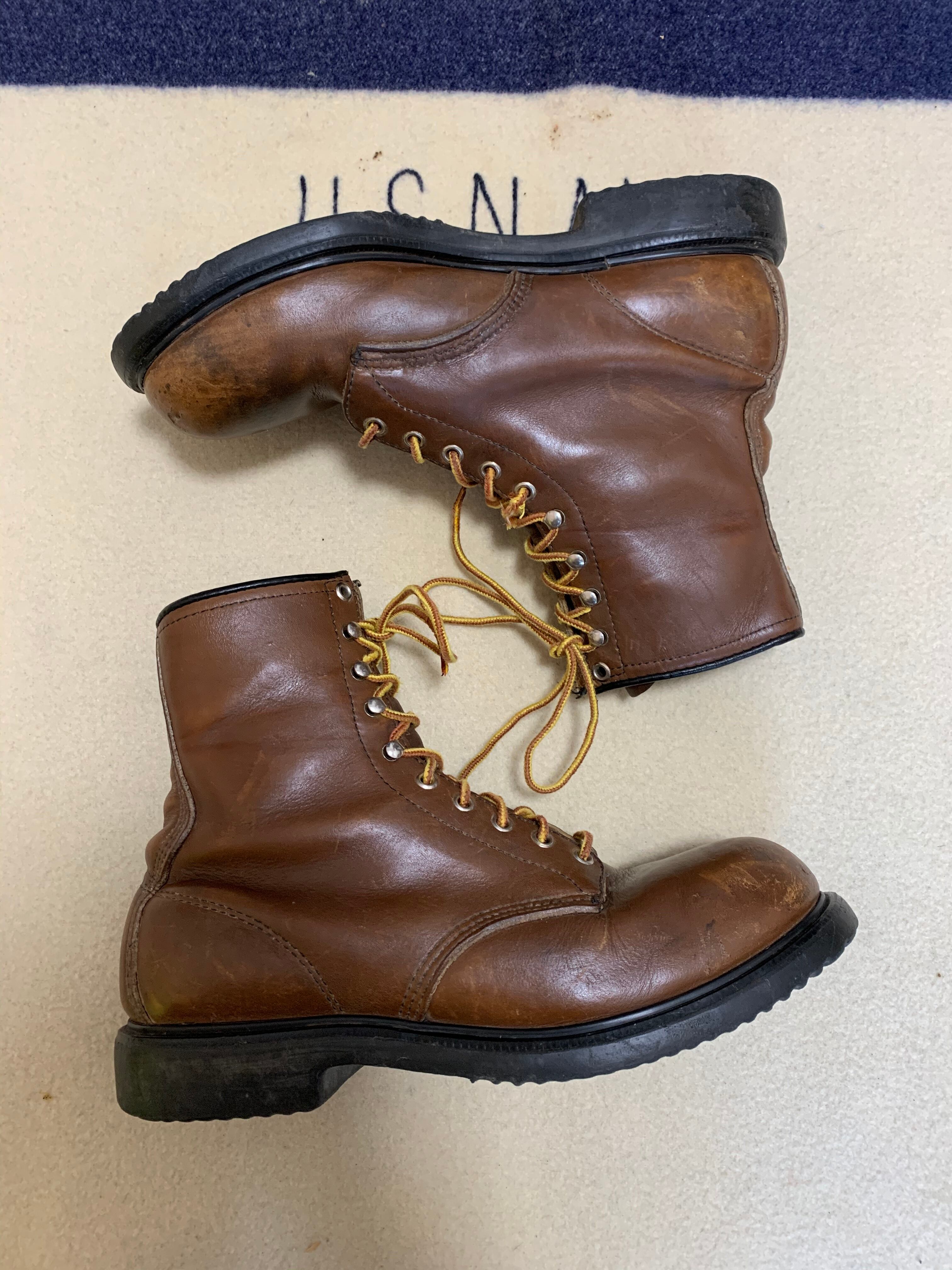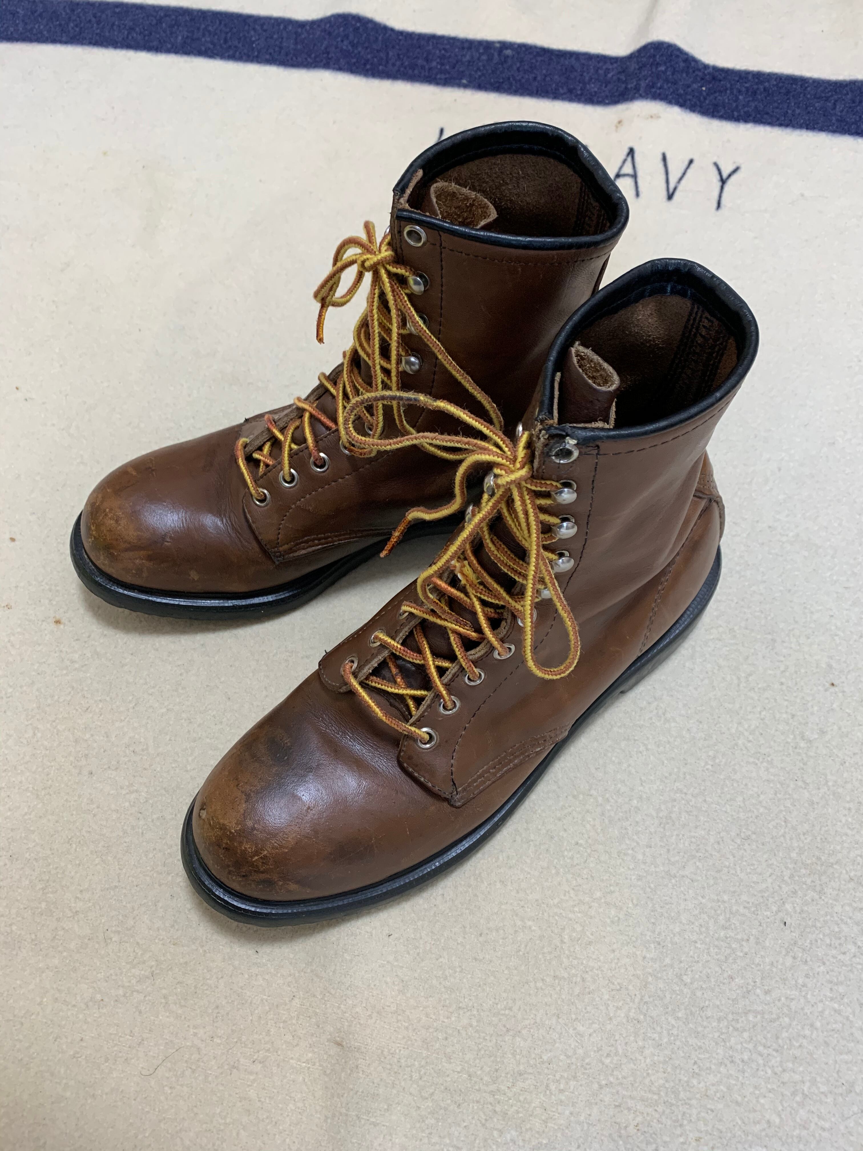刻印が消えており読み取りが難しいですがタン裏のタグから80s後期-90sあたりと思います。RED WING 2233。スティールトゥですがスーパーソール搭載で軽く履きやすい一足です。クリーニング済みでオイル入れてます。
