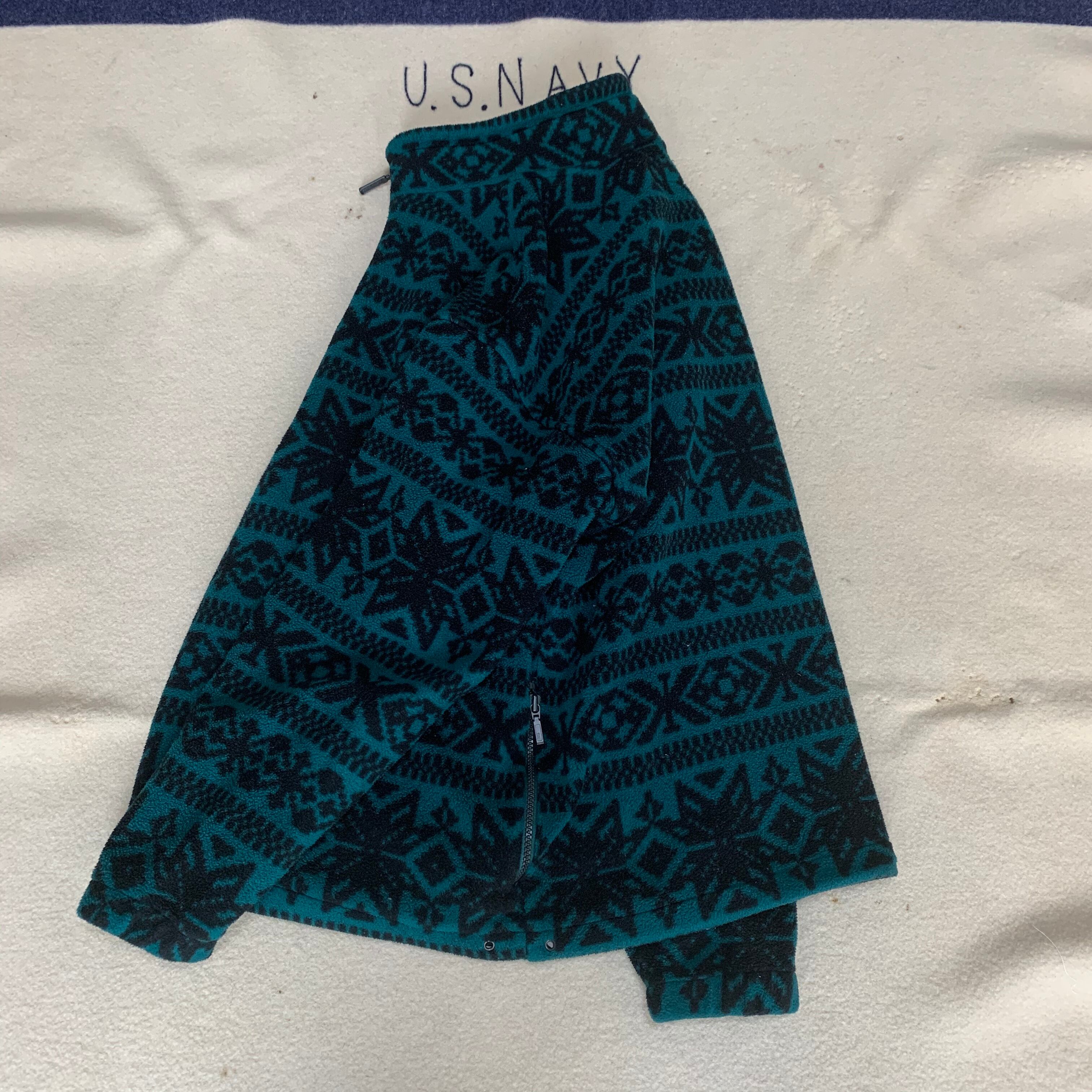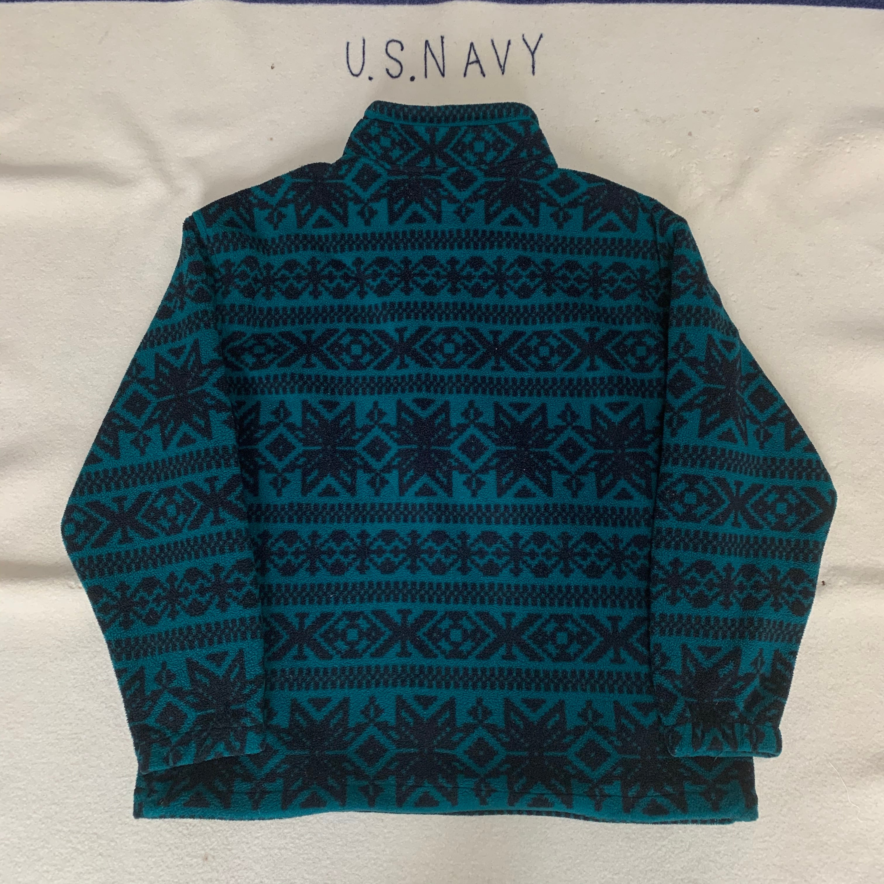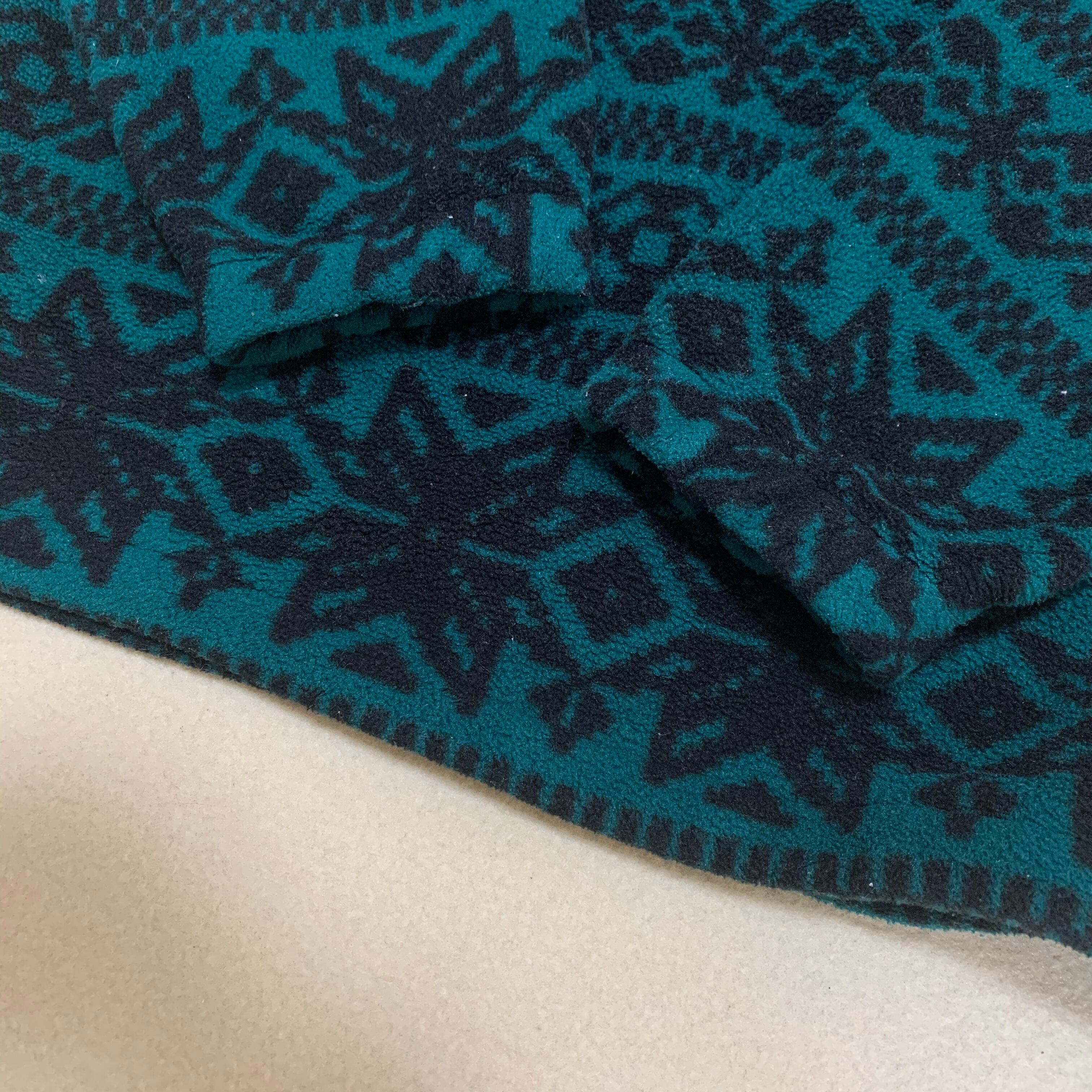 80s後期-90s頃のエディバウアーのフリースジャケット。一枚でも重ねても使える使い勝手の良い一着。グリーンにブラックのスノーパターンがgood。