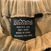 マナスタッシュのショーツ。素材はヘンプ、カラーはカーキ。ヘンプは涼しくて風通り良い素材です。