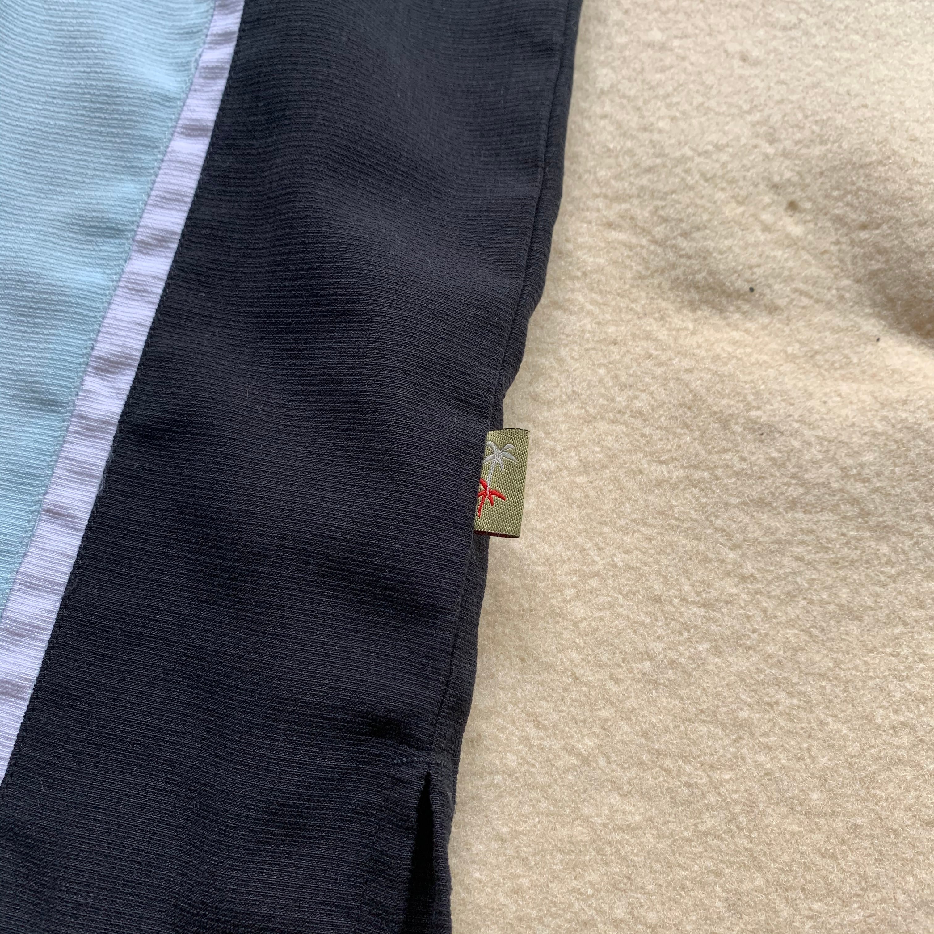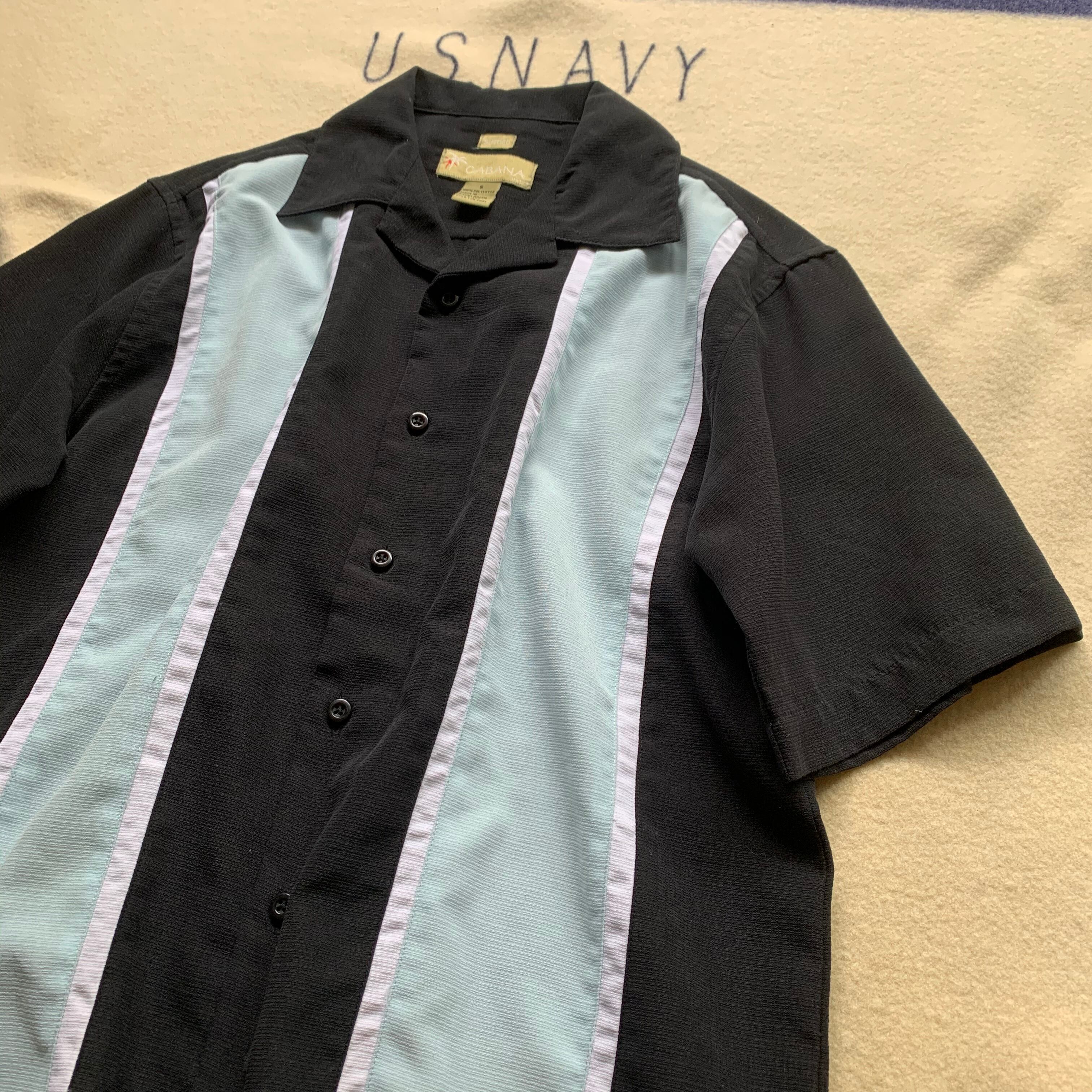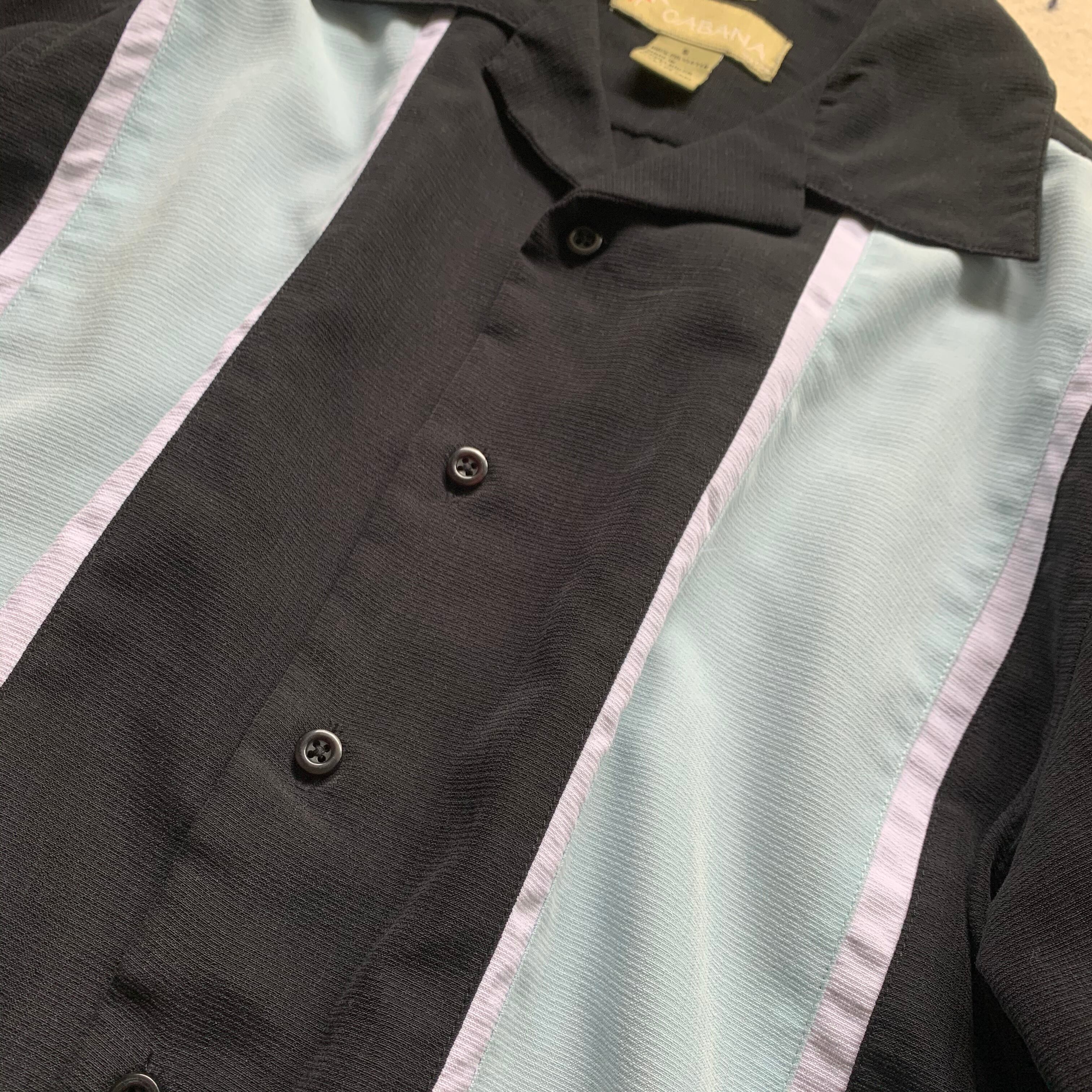 CABANA by CDFというブランドのアロハシャツ。ボーリングシャツの様な見た目の珍しいアロハ。ブラックのボディにターコイズの太いラインが入り、ポリエステル素材で柔らかい着心地。