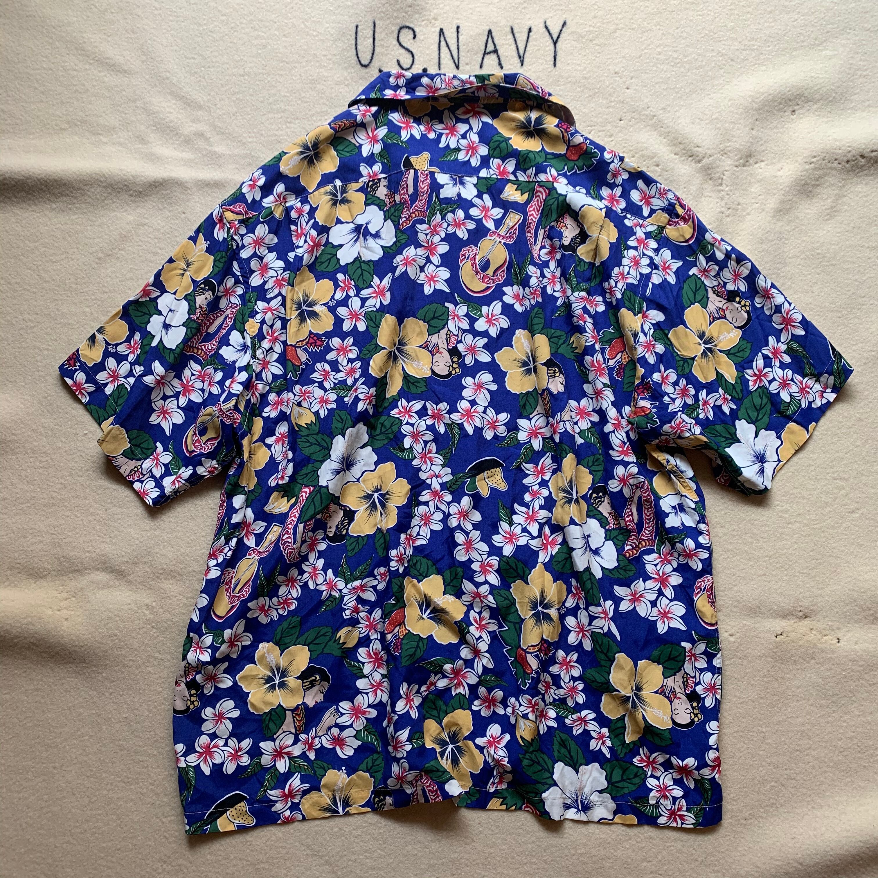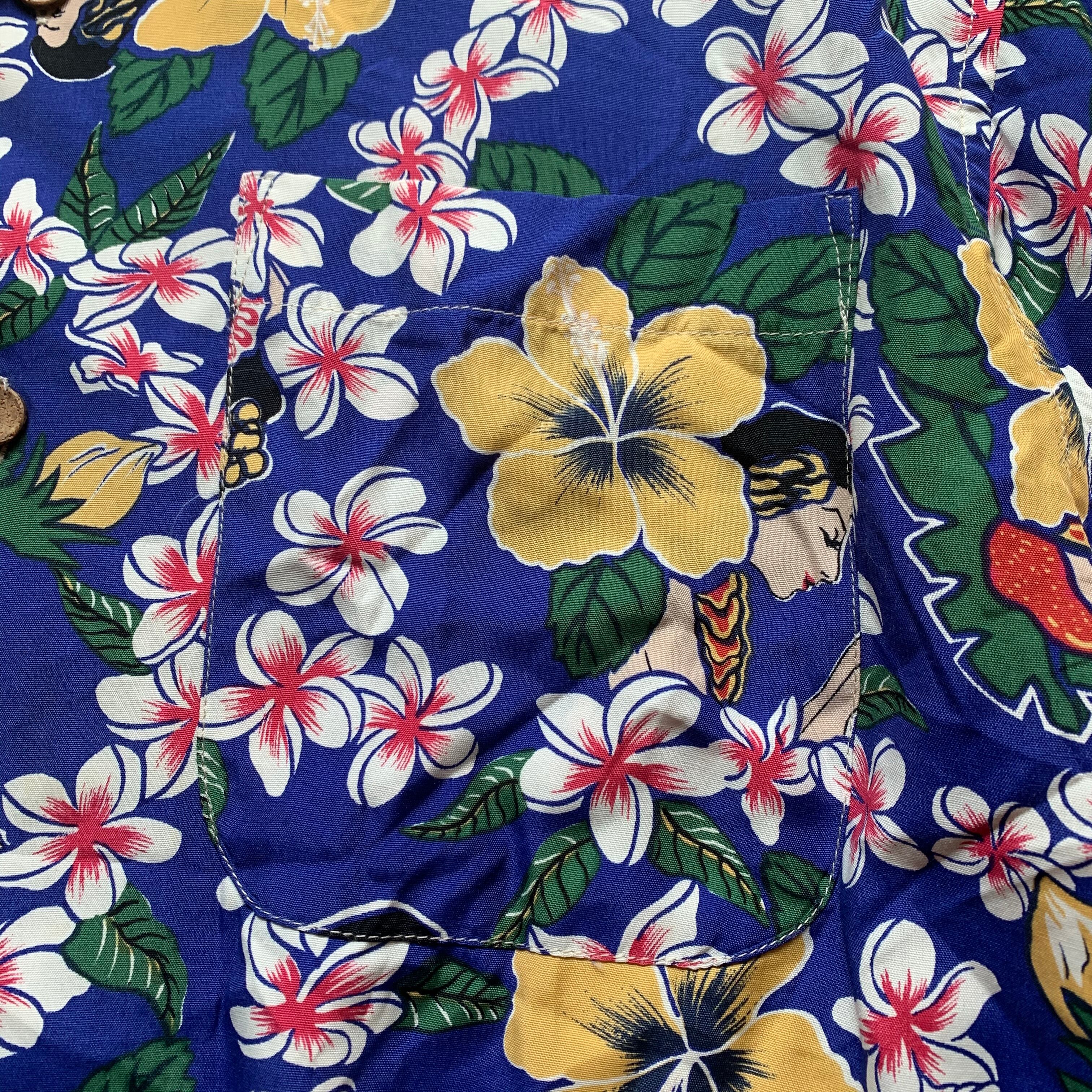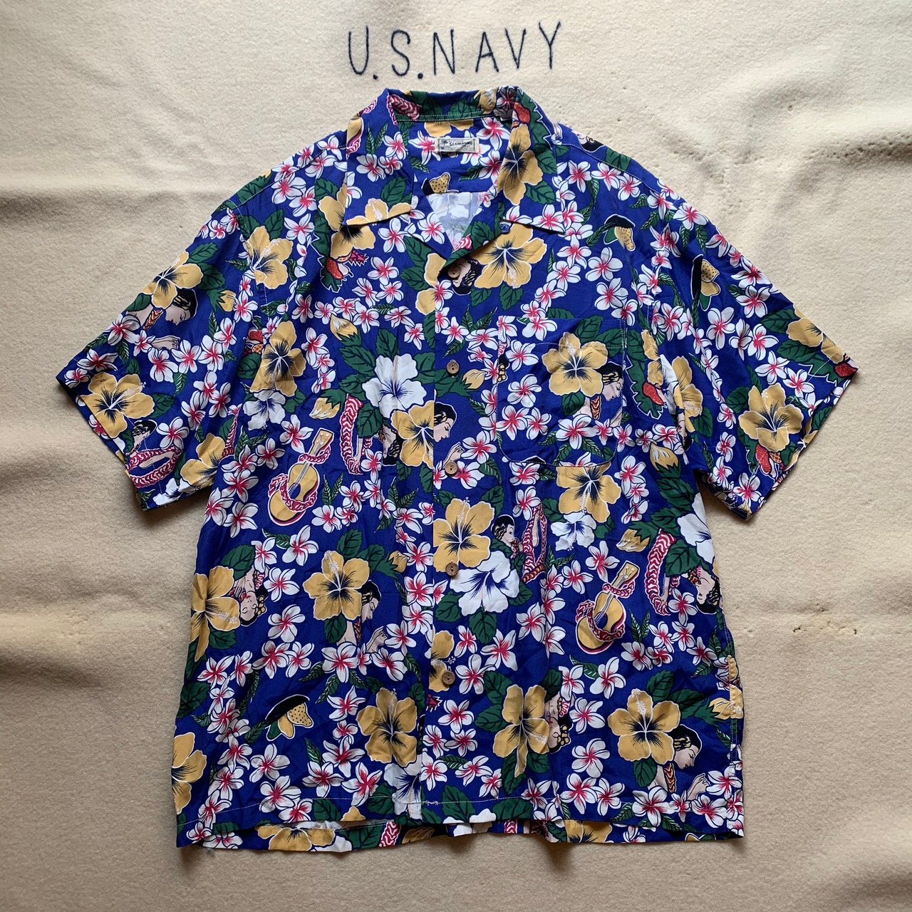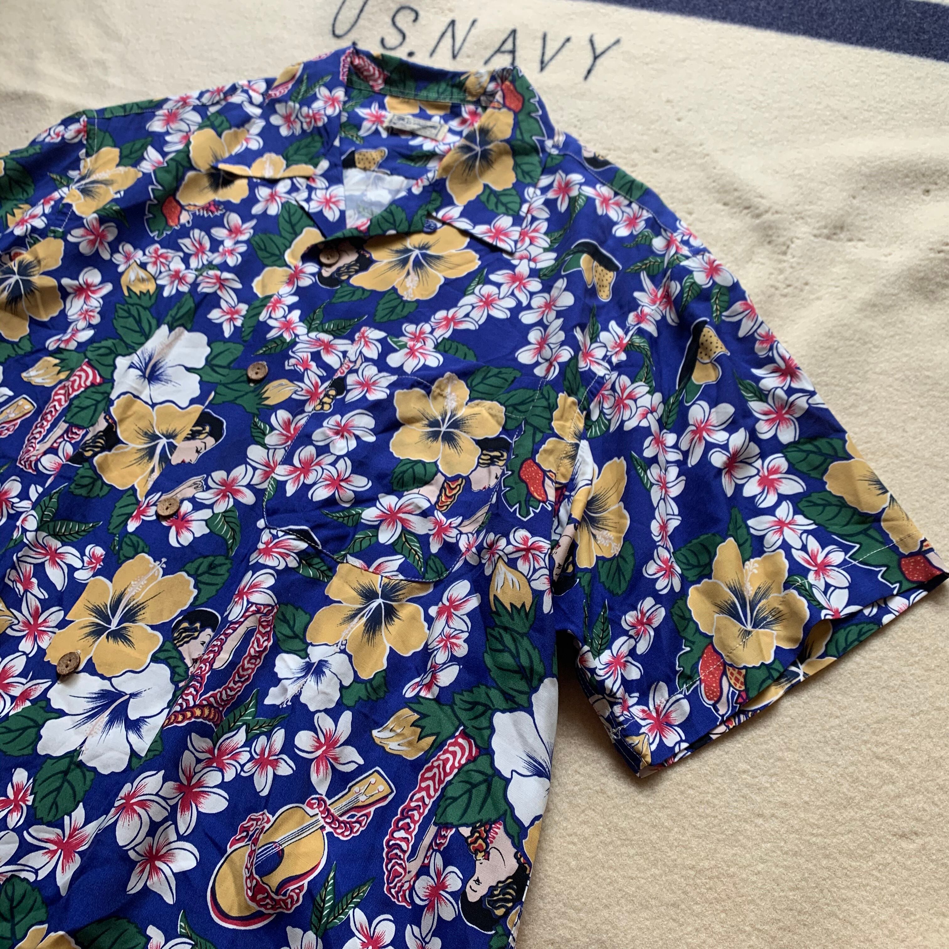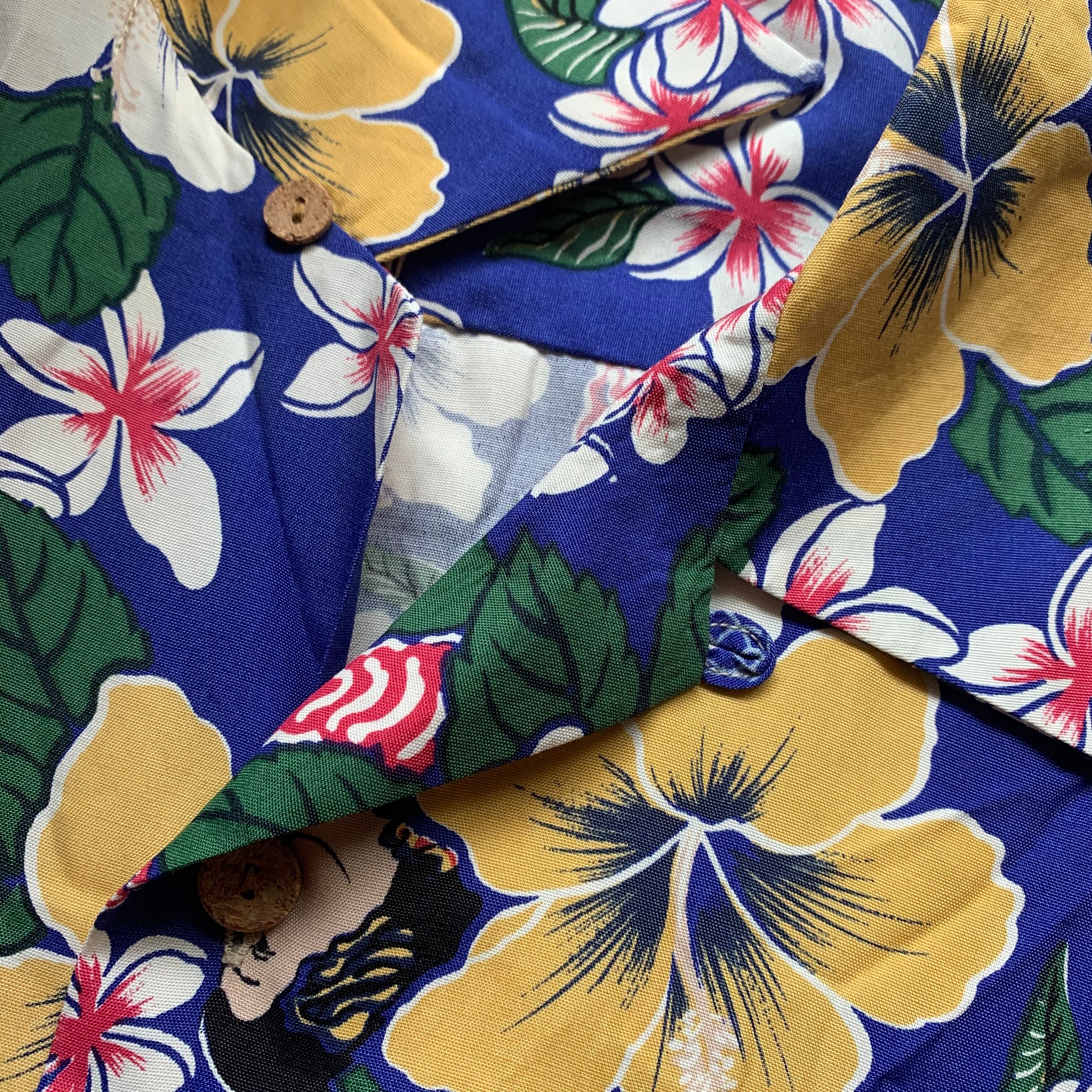balanceweardesignの姉妹ブランドであるSLUMMINGのアロハシャツ。表記はないですがレーヨン100%だと思います。ステッチングやボタン、ハイビスカスにフラガールのパターンでヴィンテージアロハの要素を存分に感じます。