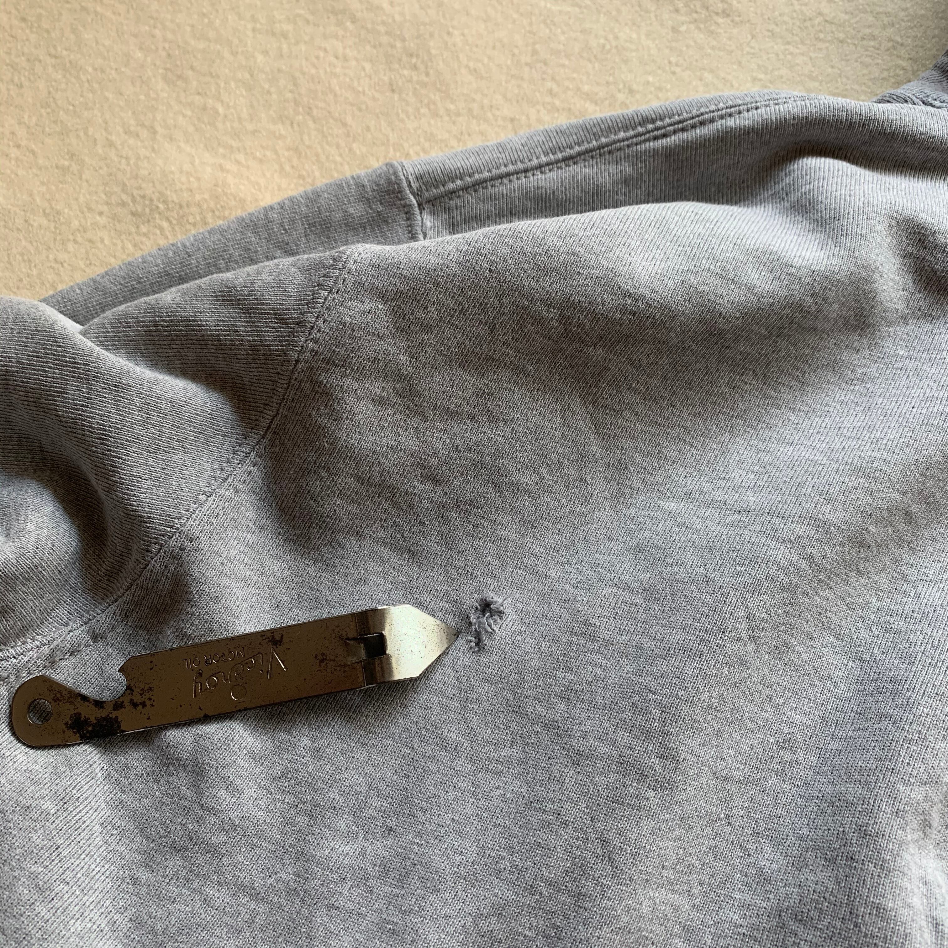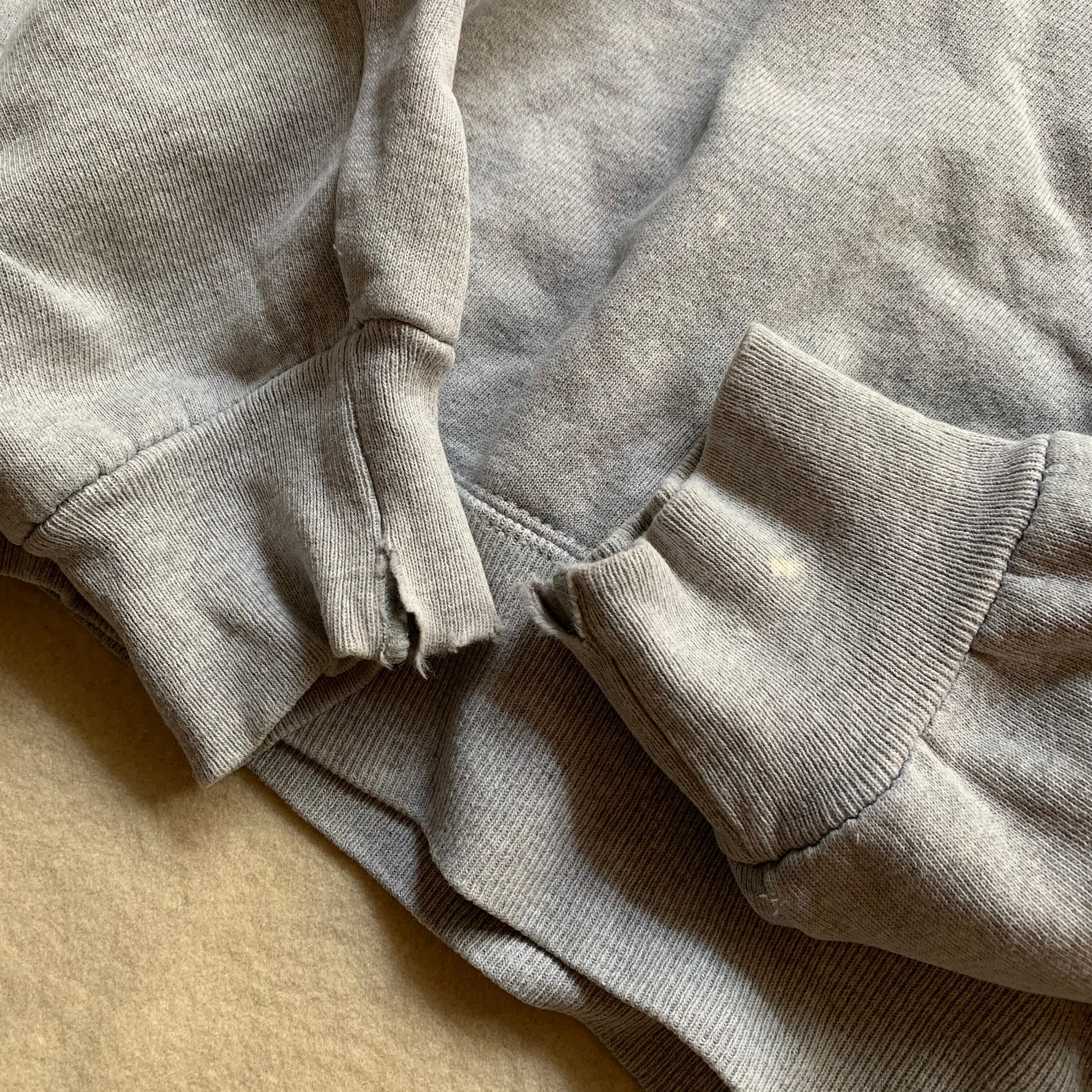 90s champion フーディ。最後のUSA製です。所々にブリーチの飛んだ後、若干の破れ等ありますがいいヤレ感と思います。リバースウィーブの分厚いガシッとした生地感でビッグサイズながらアームも太くないのですっきりとしたシルエット。