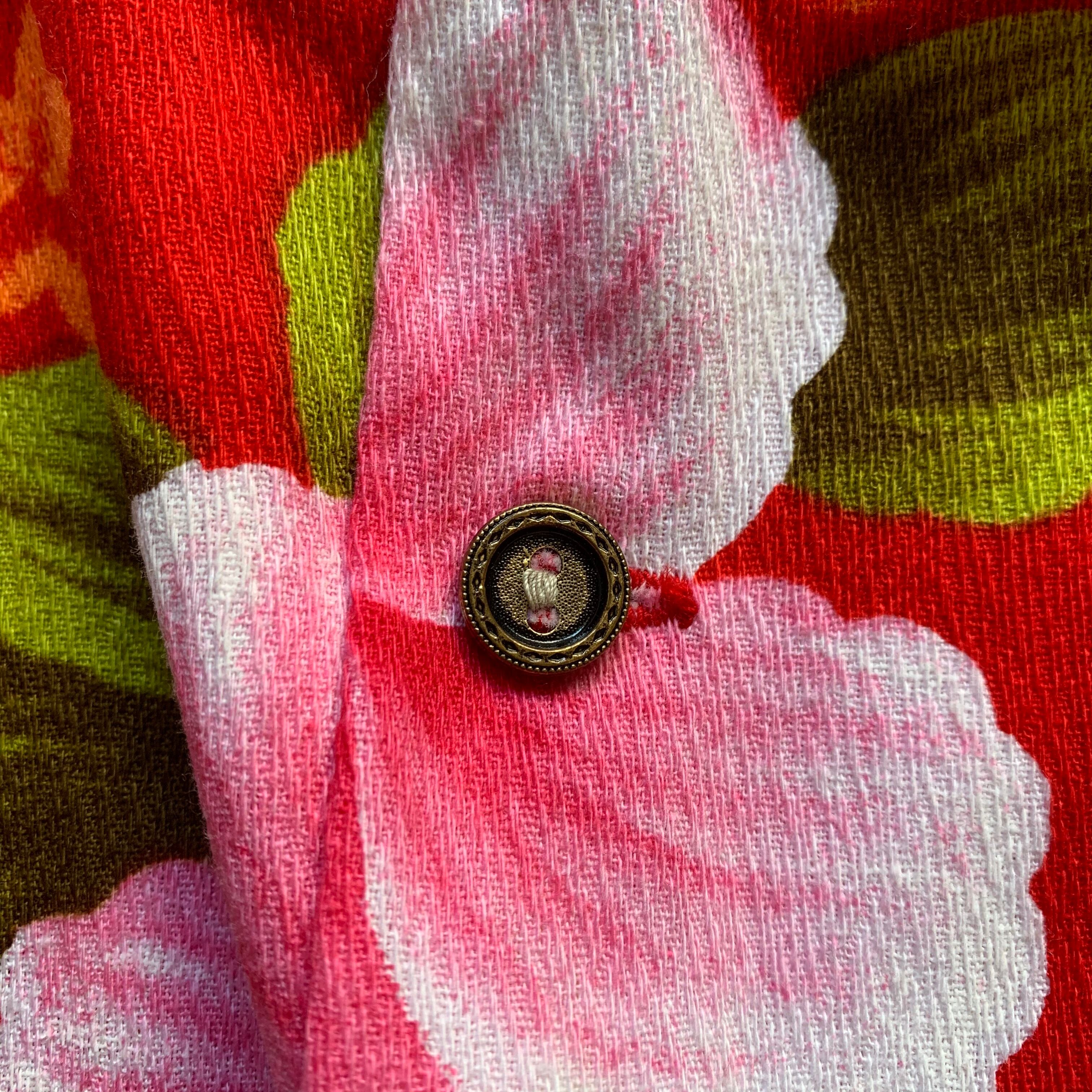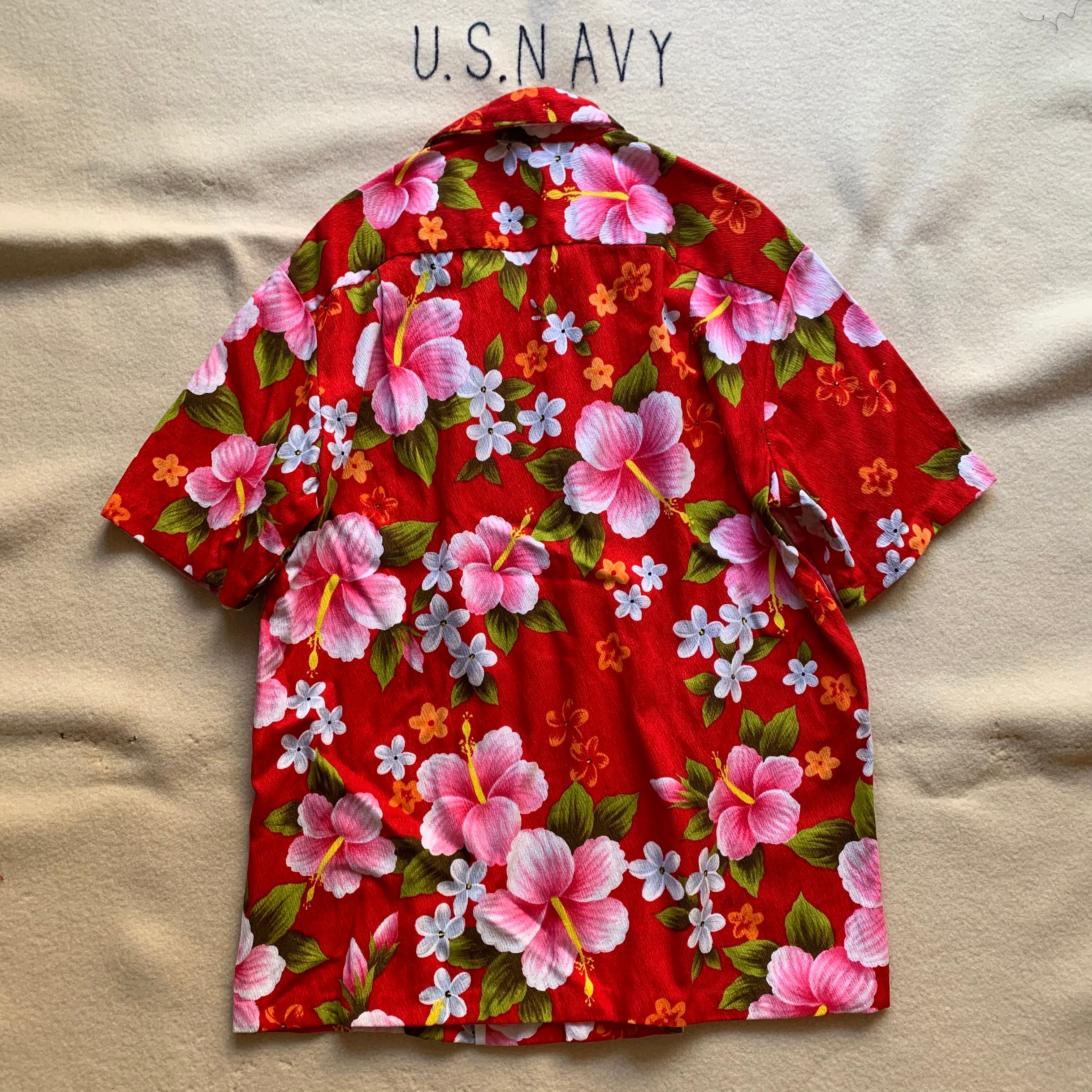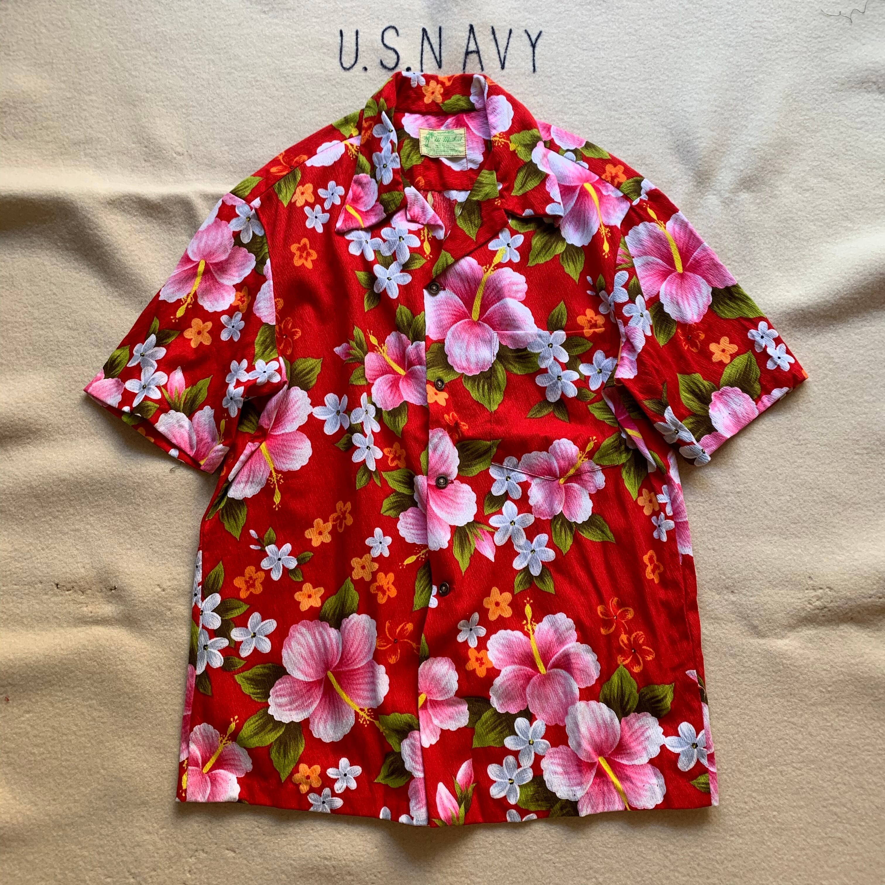 60sの後期か恐らく70s頭あたりのUi-Maikai。レッドのボディにでかでかとハイビスカスがピンクで入るTHE アロハな一枚。