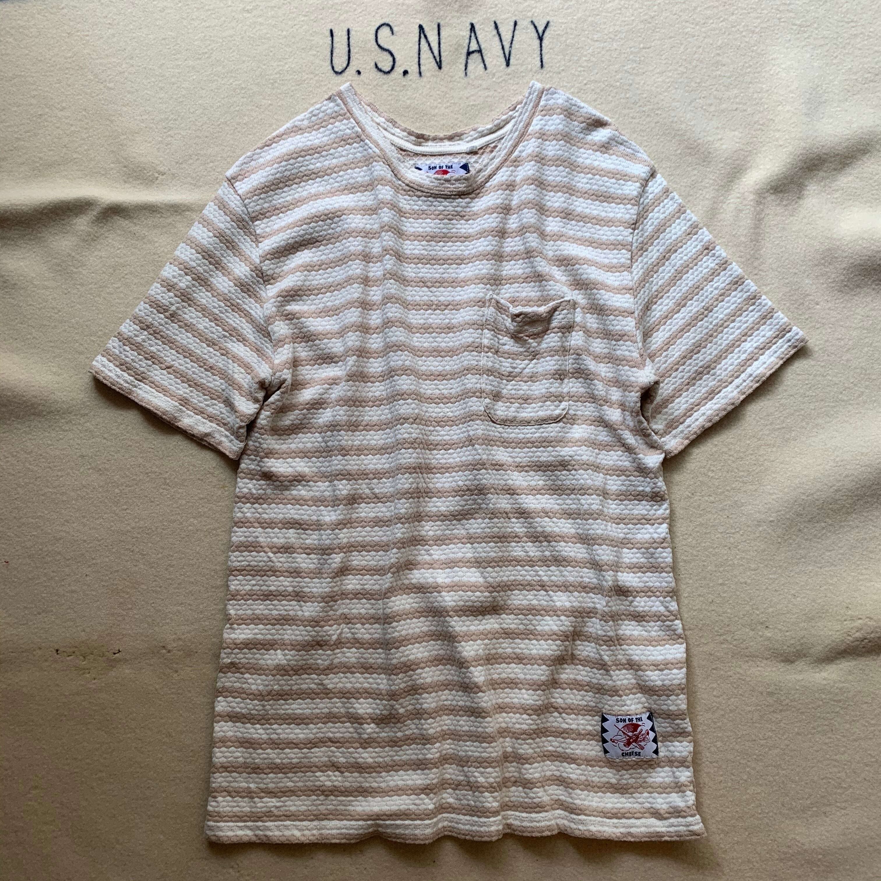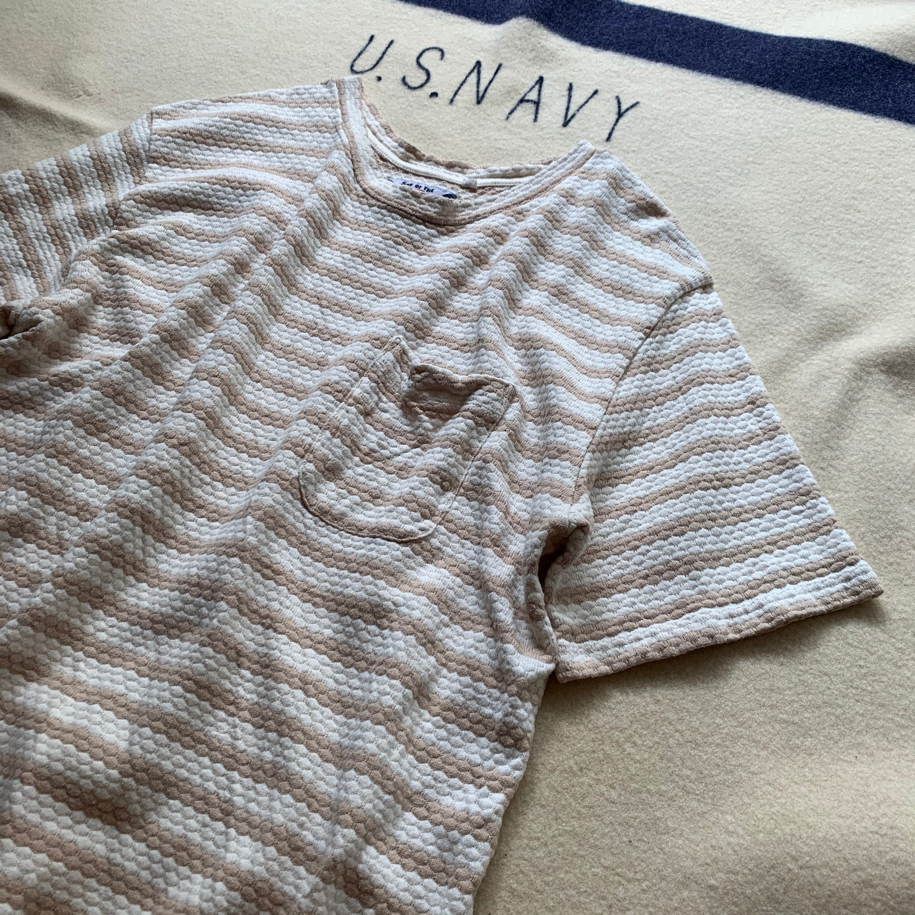 目黒発サノバチーズのポケットT。ゆったりとしたシルエットにジャガード織りの様なハニカム構造ボディで着心地は柔らかく、どこか西海岸の風を感じる一着。