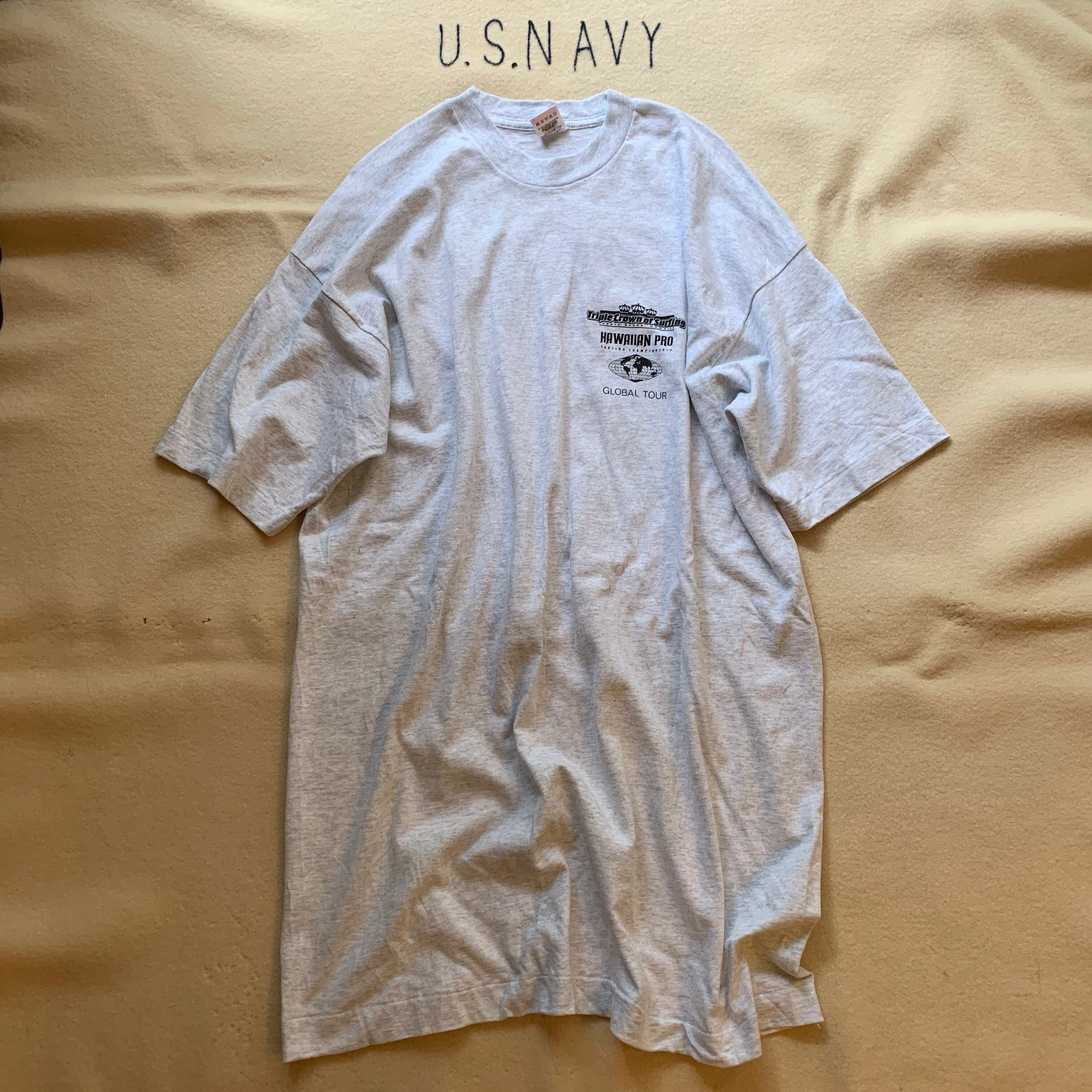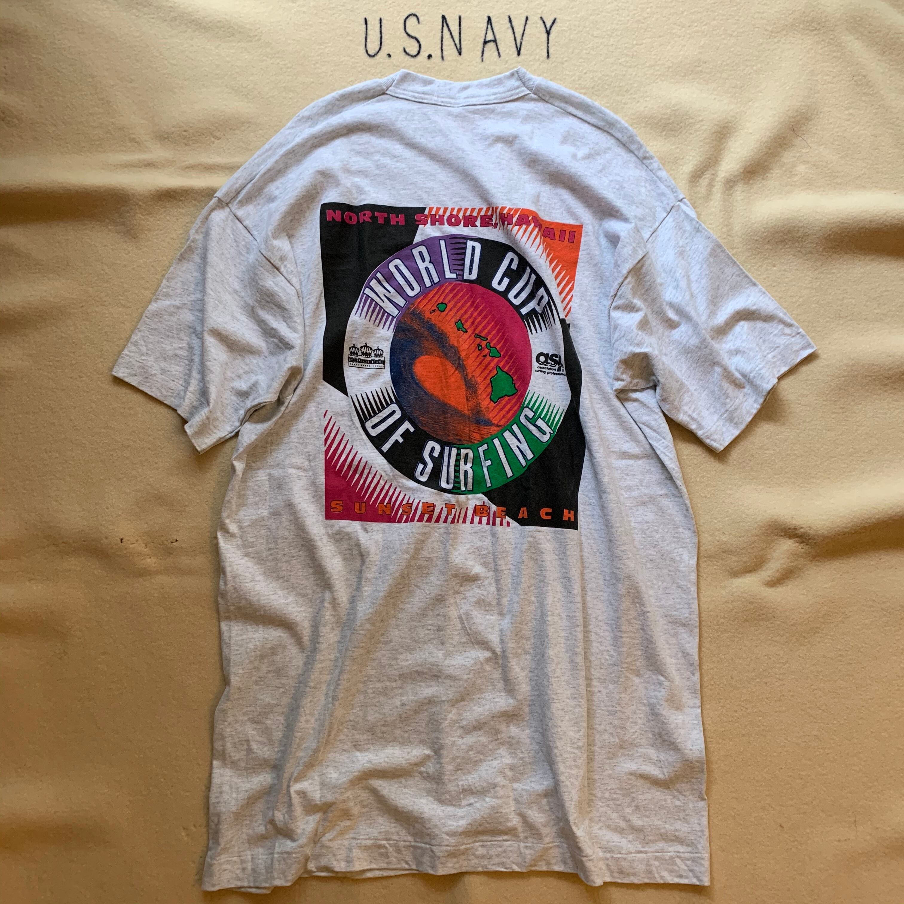 90s初期頃のFRUITS OF THE LOOM Tシャツ。サーフィンのワールドカップのノベルティ。XXLのビッグシルエットに背面に大きく入るプリントが今っぽいと思います。
