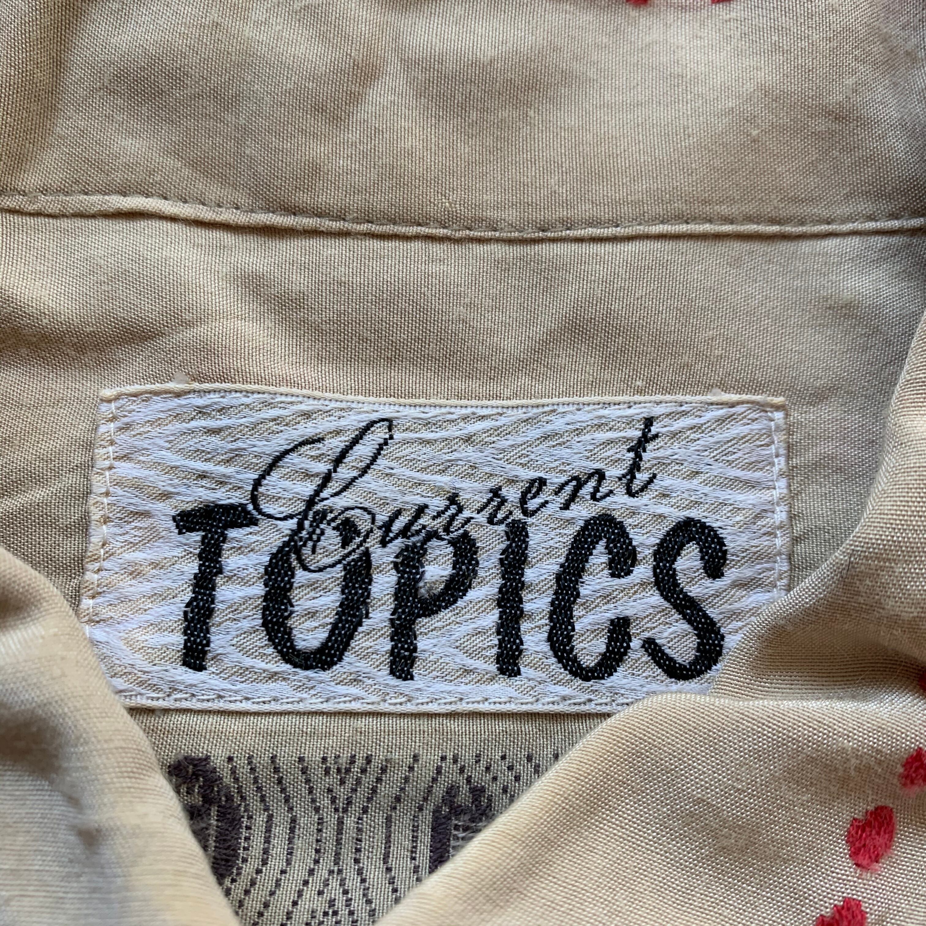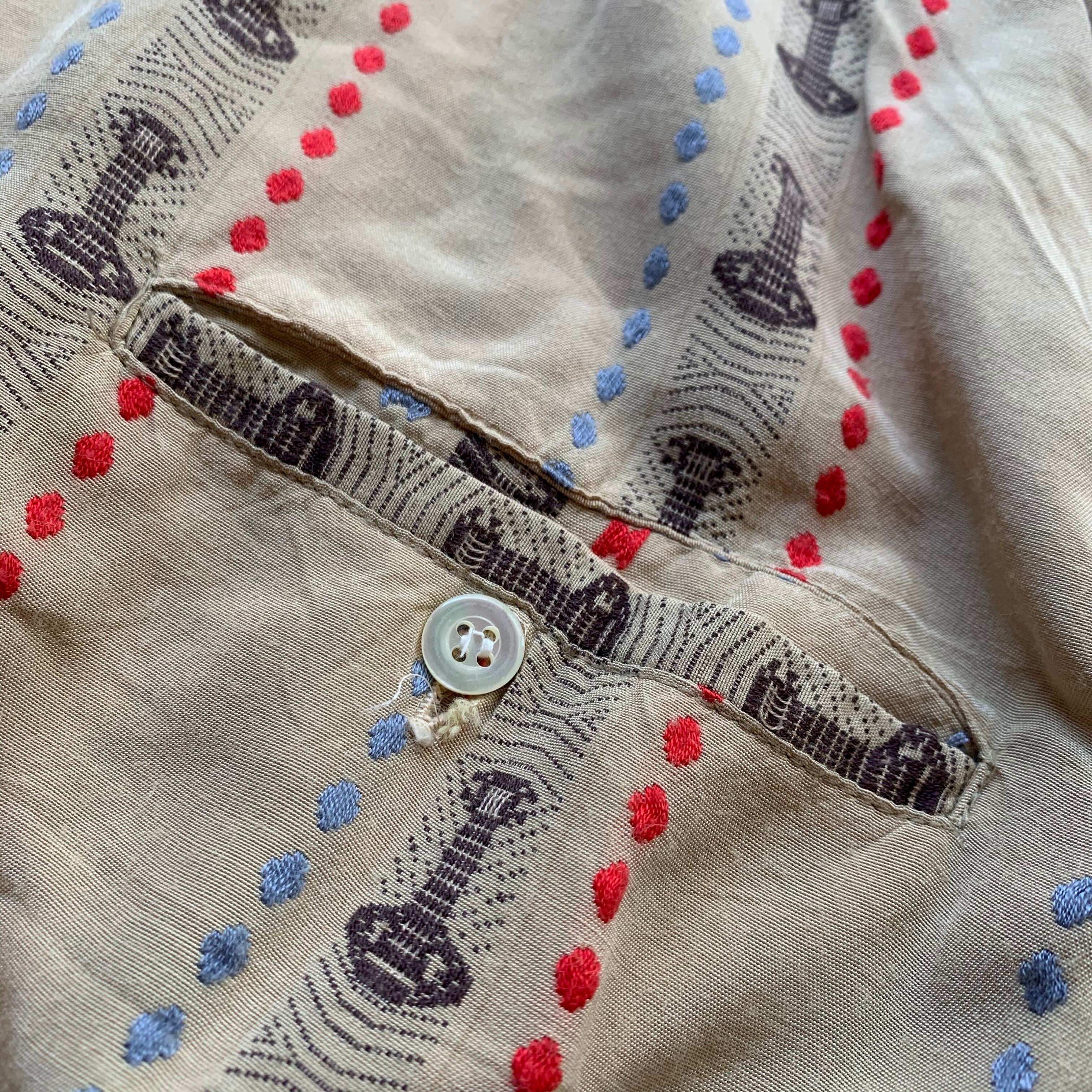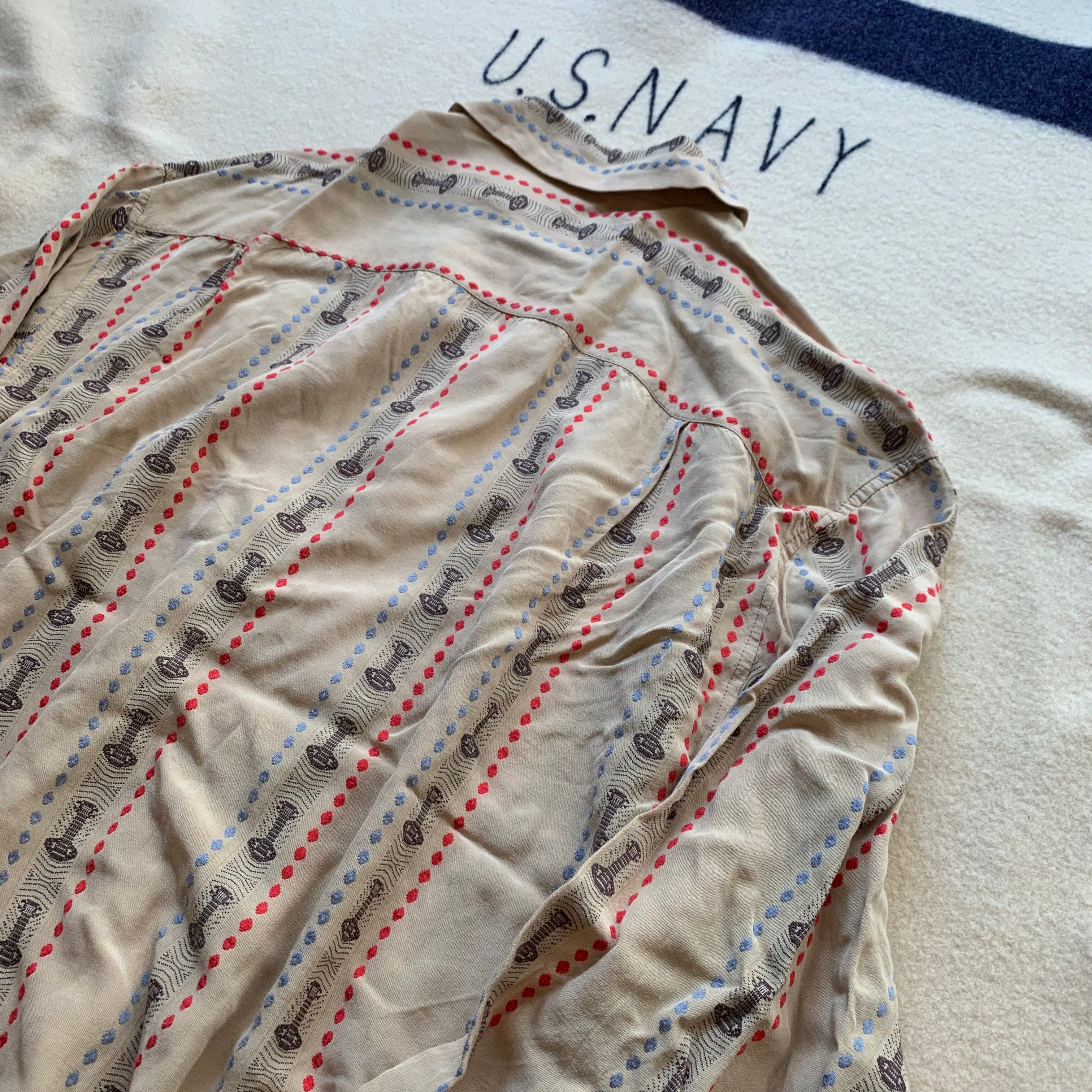 60s頃のレーヨンシャツ。バンジョー?が前面に施された非常に珍しい一着。ボタンはシェルボタン。割れているものが多いですが全て綺麗に残っています。50s ロカビリー、ヴィンテージ好きにたまらない一着だと思います。
