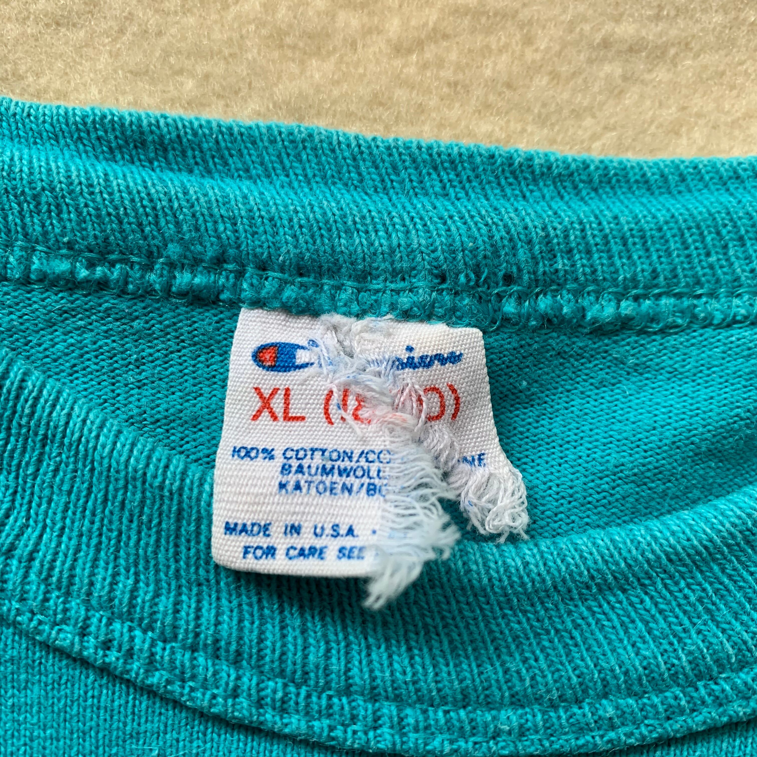80s championのヴィンテージT。ボーイズXL表記でメンズSくらいのサイズ感です。恐らくボディにステンシルを入れてリメイクしています。サックスブルーのいい色です。