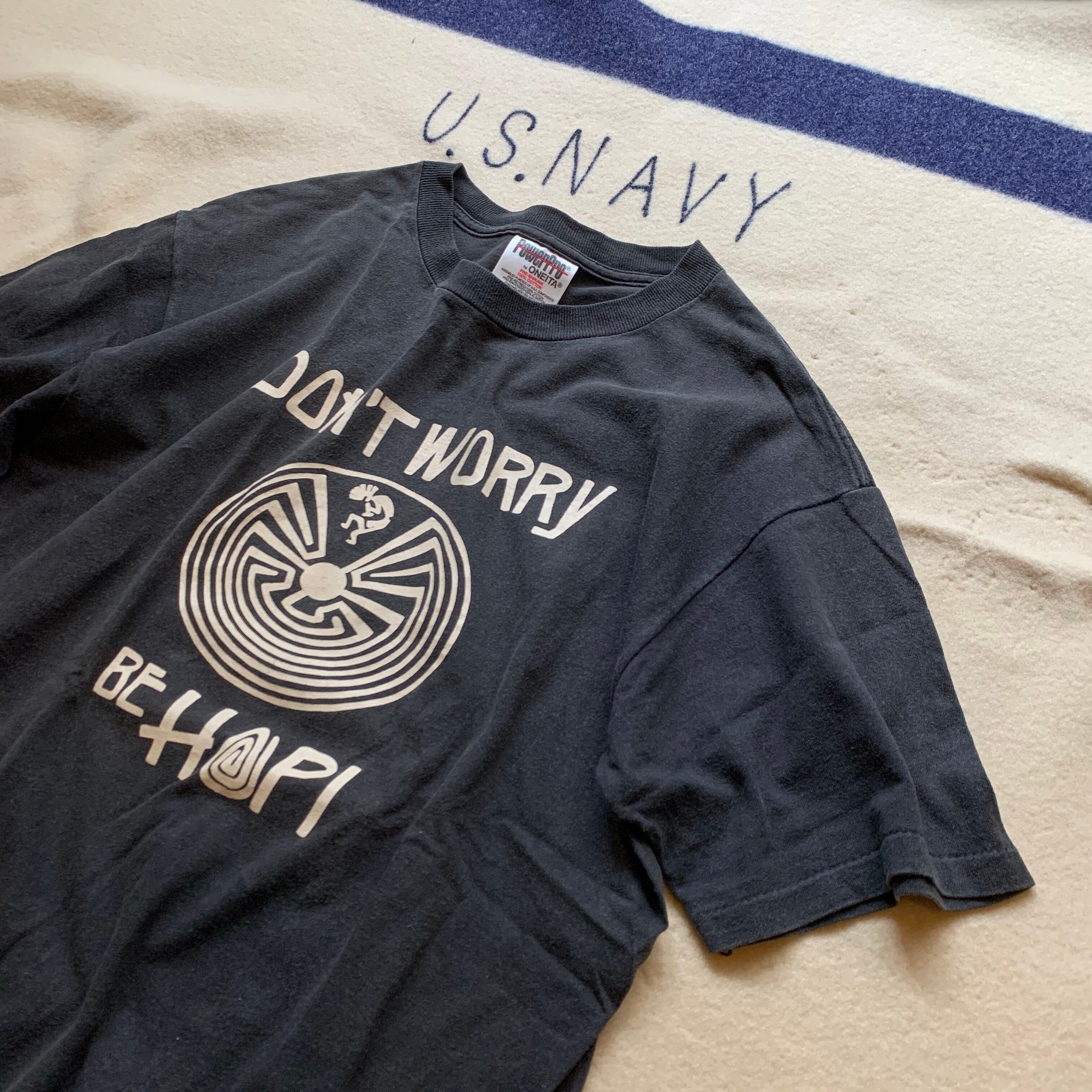 80s後期頃のヴィンテージT。Don’t worry be HOPIの文字とホピ族のインディアンジュエリーでもよく見られるココペリのプリントがかわいい一着。ナバホ、ホピ、ズニ、インディアンジュエリー好きな方にも。