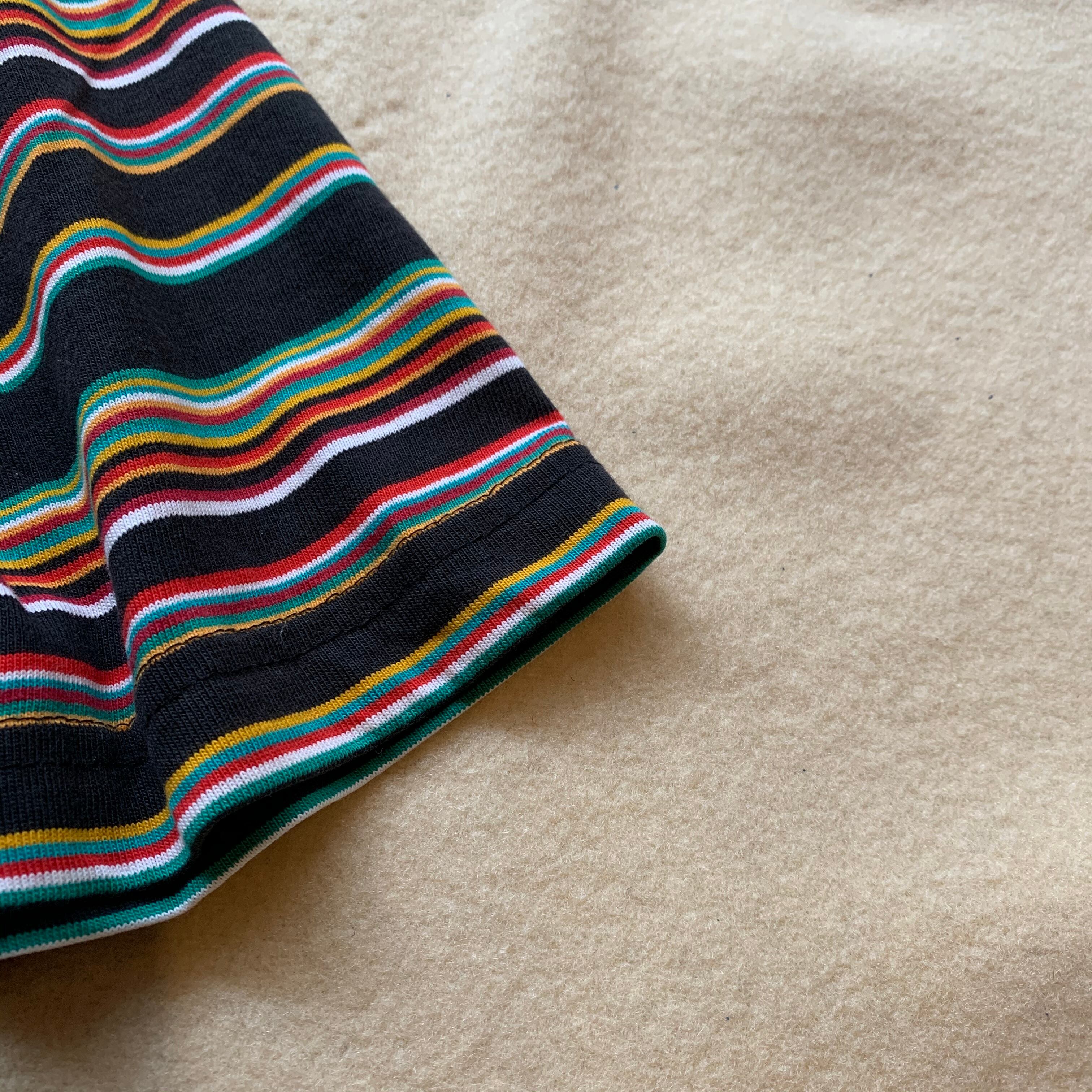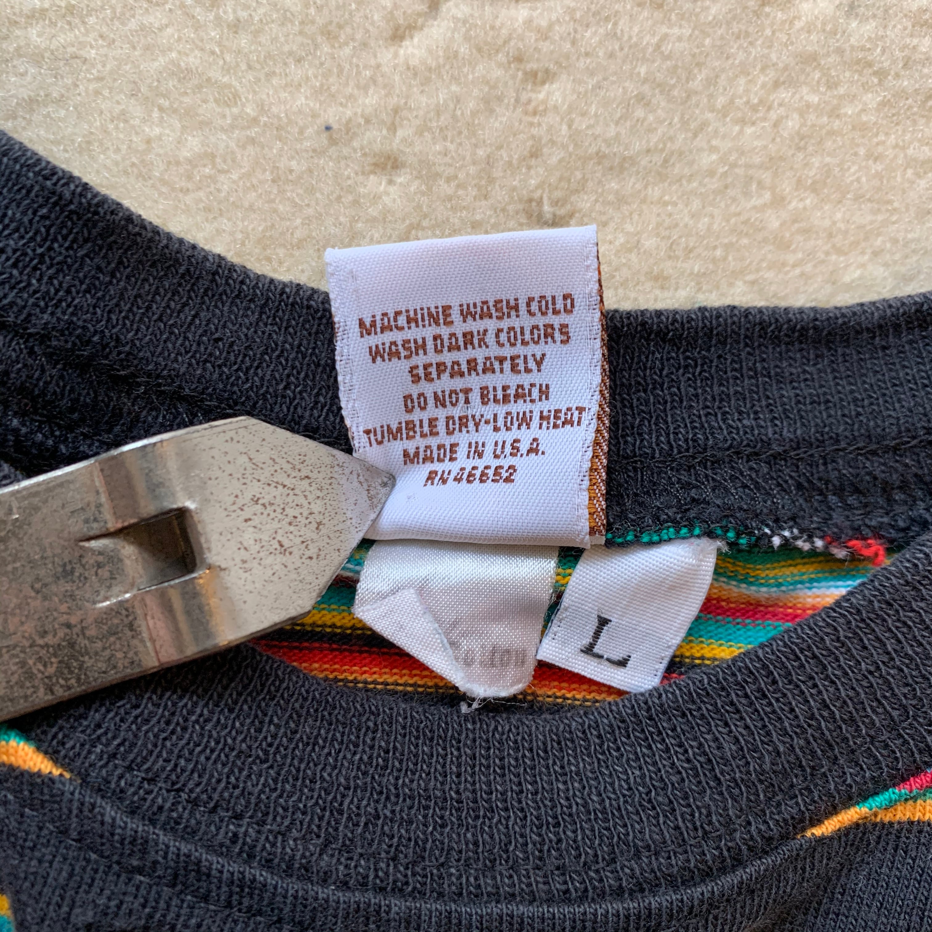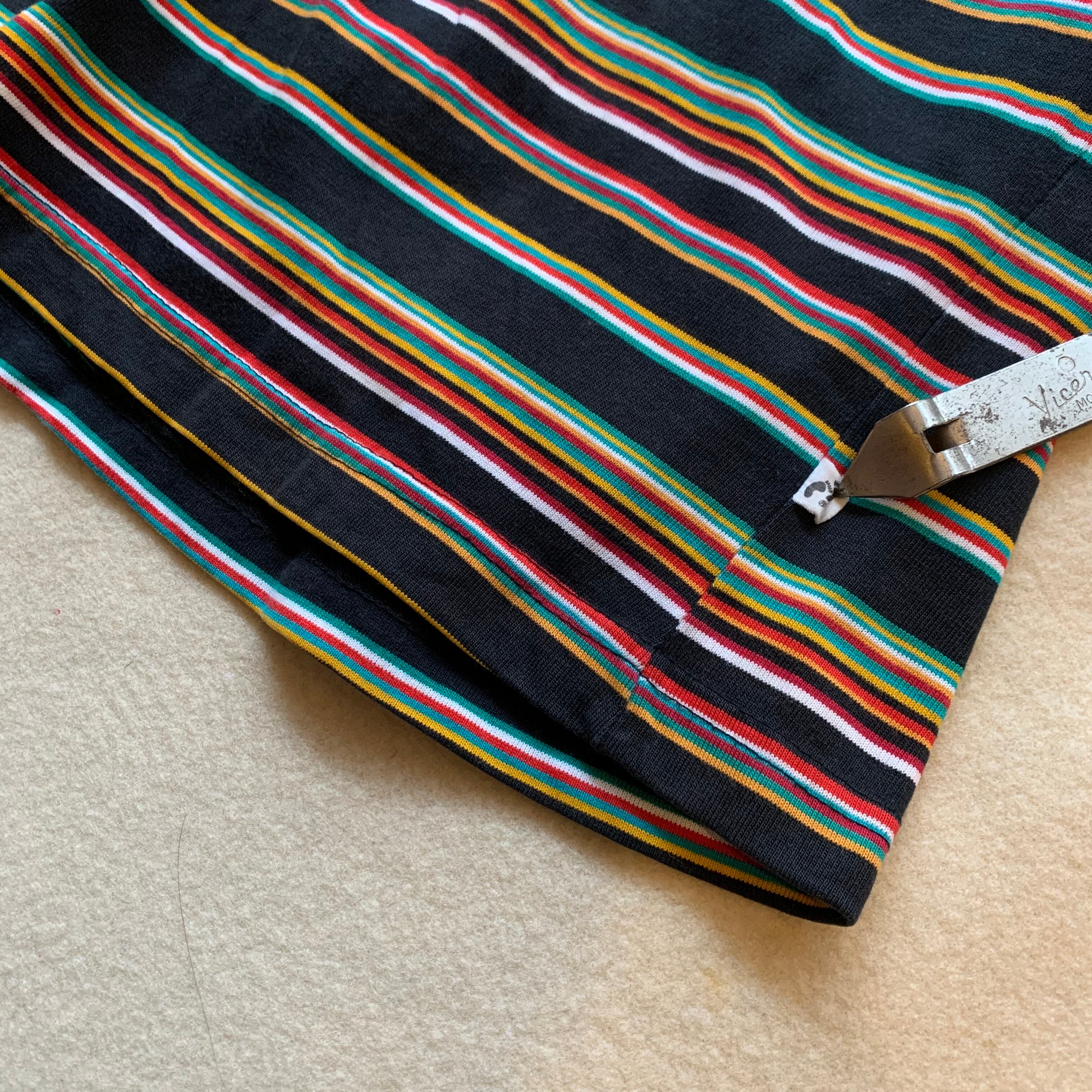 配色goodのHang TenボーダーT。黒ベースのボーダーパターンは中々見ないと思います。アメリカ製。全体的に状態良好ですが胸元あたりに穴を縫った後あり。