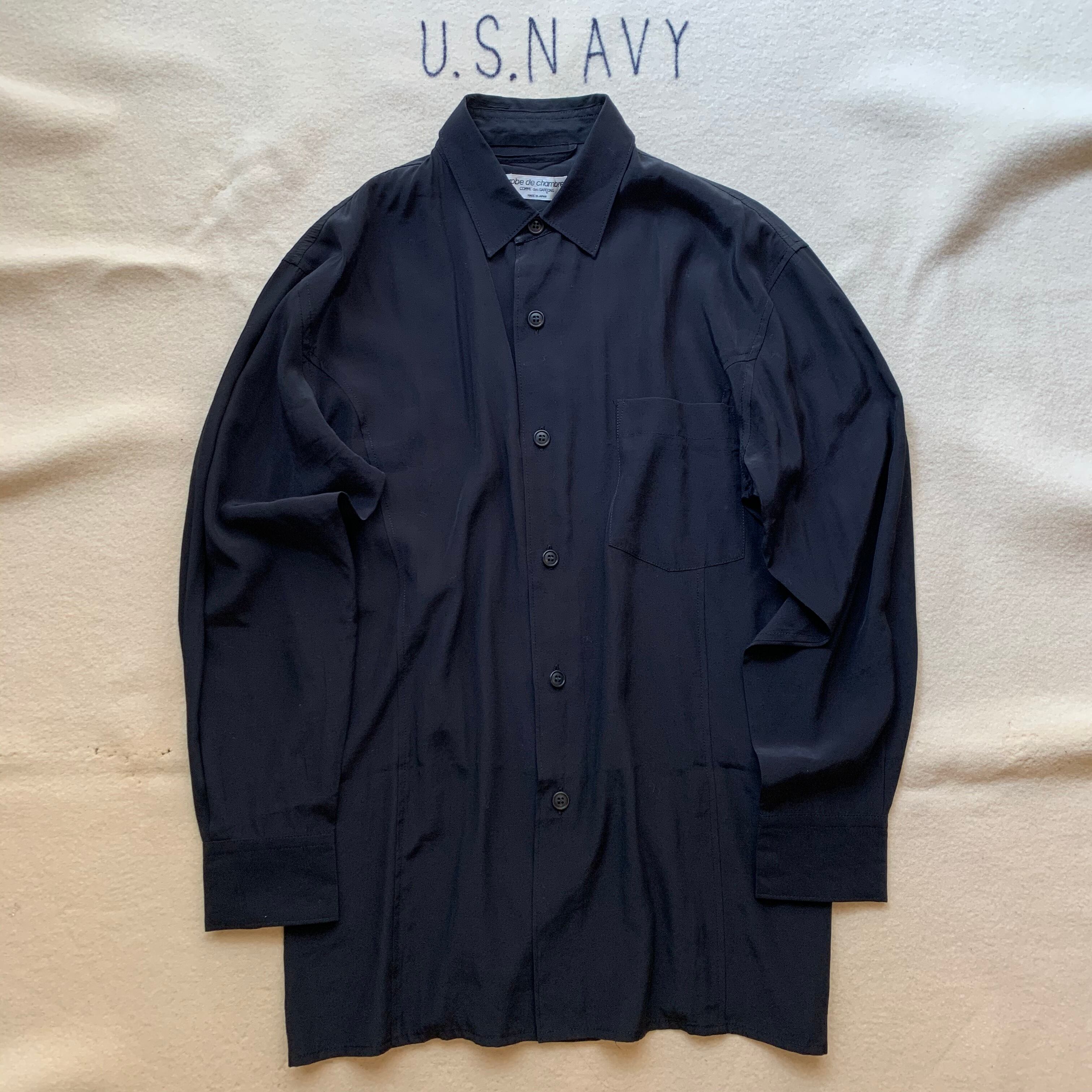 90s頃のCOMME des GARÇONS robe de chambreラインのレーヨン×アセテートシャツ。いわゆるトロミシャツ。良い仕立てです。シンプルなワンポケットでレーヨンにアセテートでなんとも言えない独特の光沢感、表情があります。