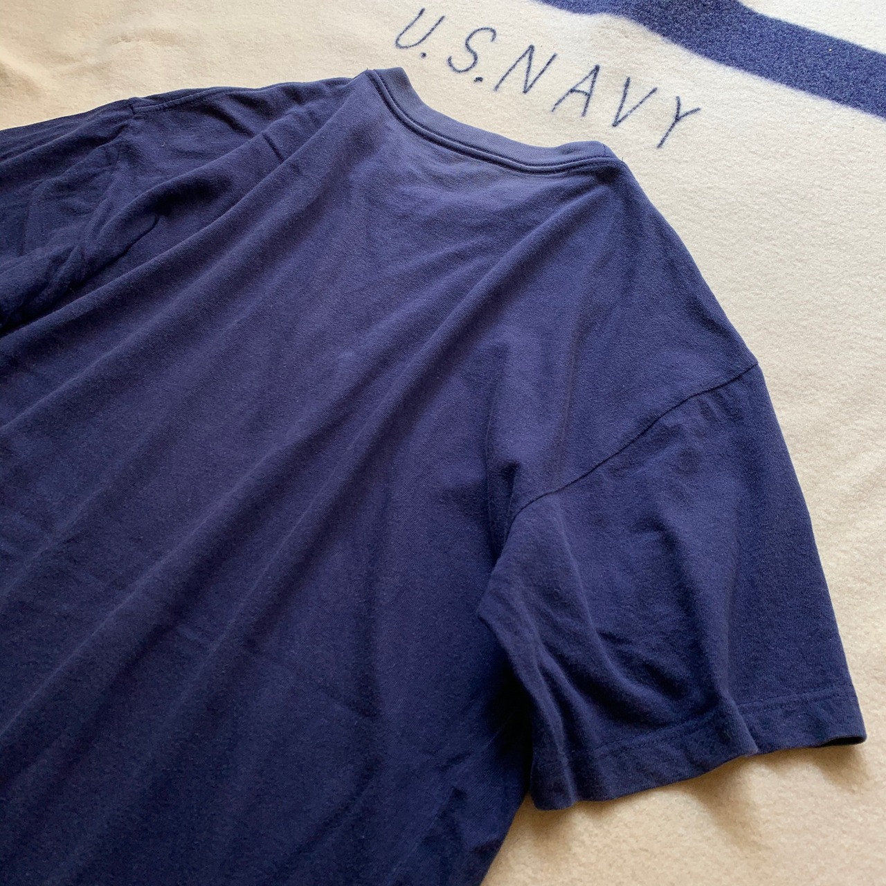 サイズM相当。首元から背中あたりに焼けありますが破れはなく古着慣れしている方であれば問題無く着用できると思います。