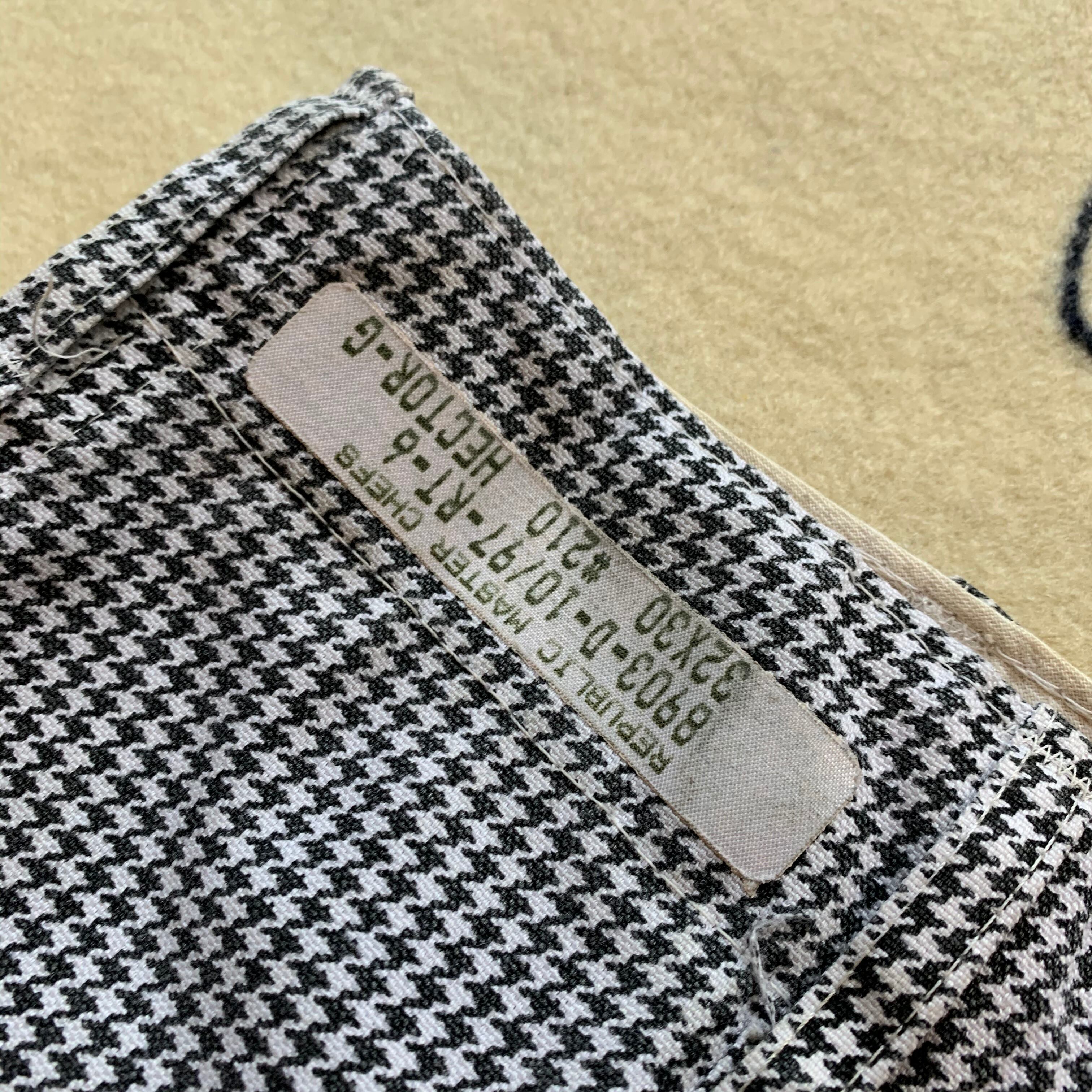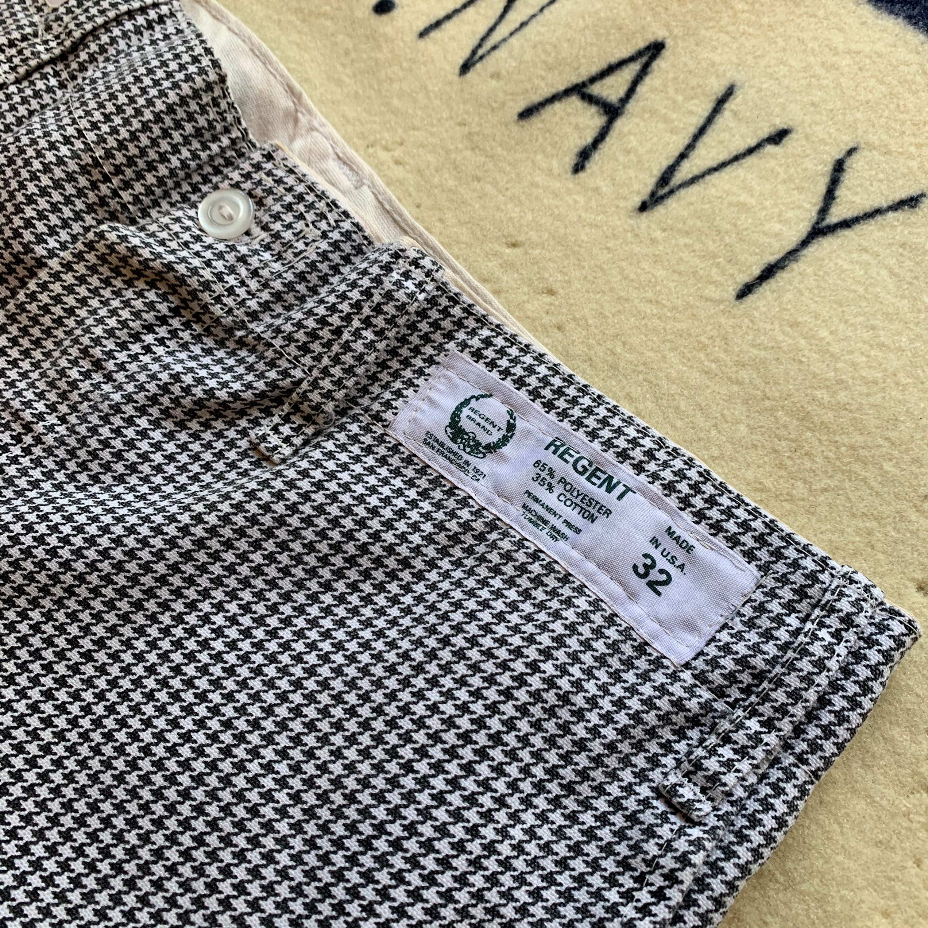 80s頃のIDEALジップのつくREGENTというブランドのコックパンツ。千鳥格子柄のスラックスタイプ。太めのシルエットでざっくり着れてトップスを選ばない使い勝手のよいパンツと思います。