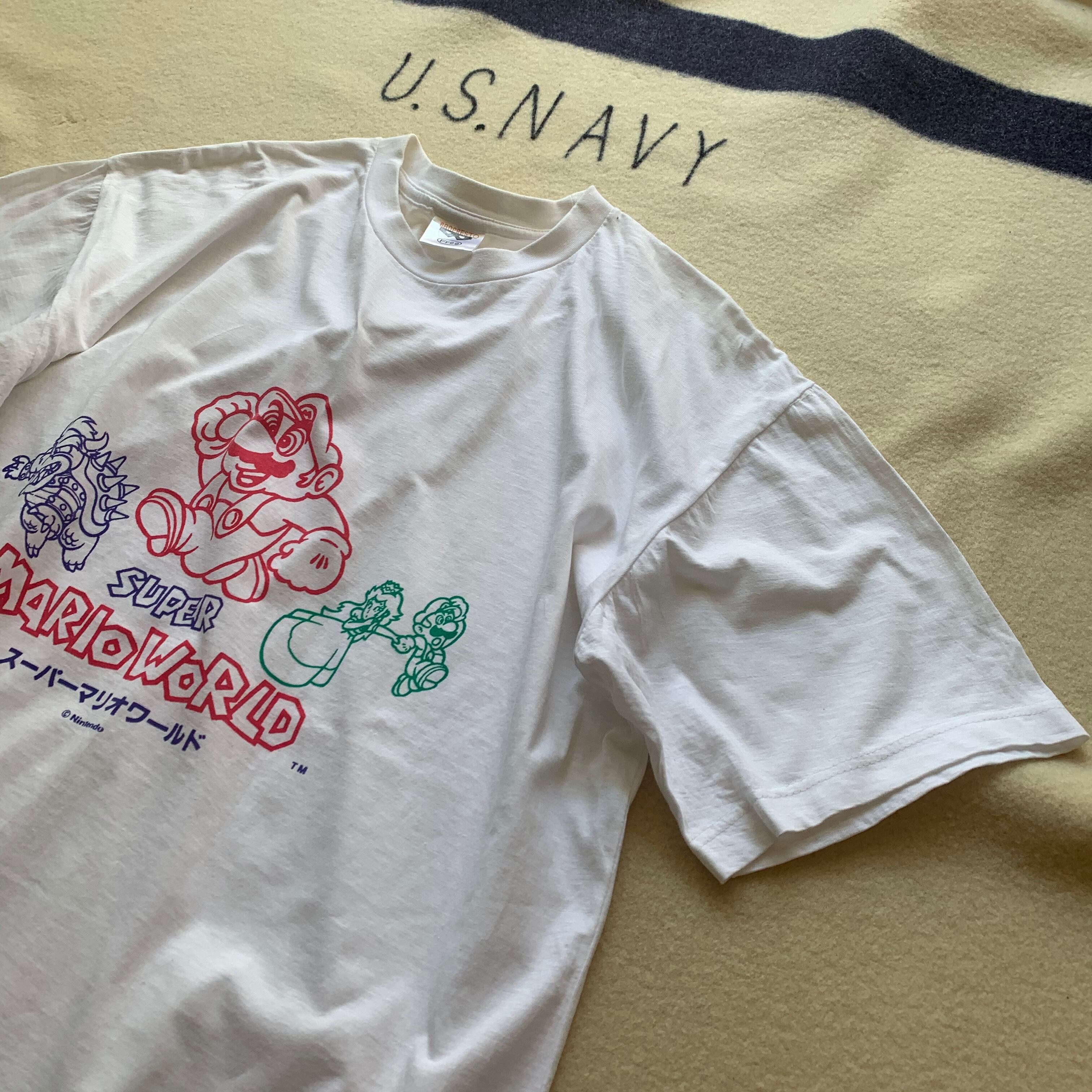 90sのスーパーマリオワールドのノベルティTシャツ。バンプレスト製。バック、フロント側に若干のシミありそれ以外は破れ等なく状態良好とおもいます。