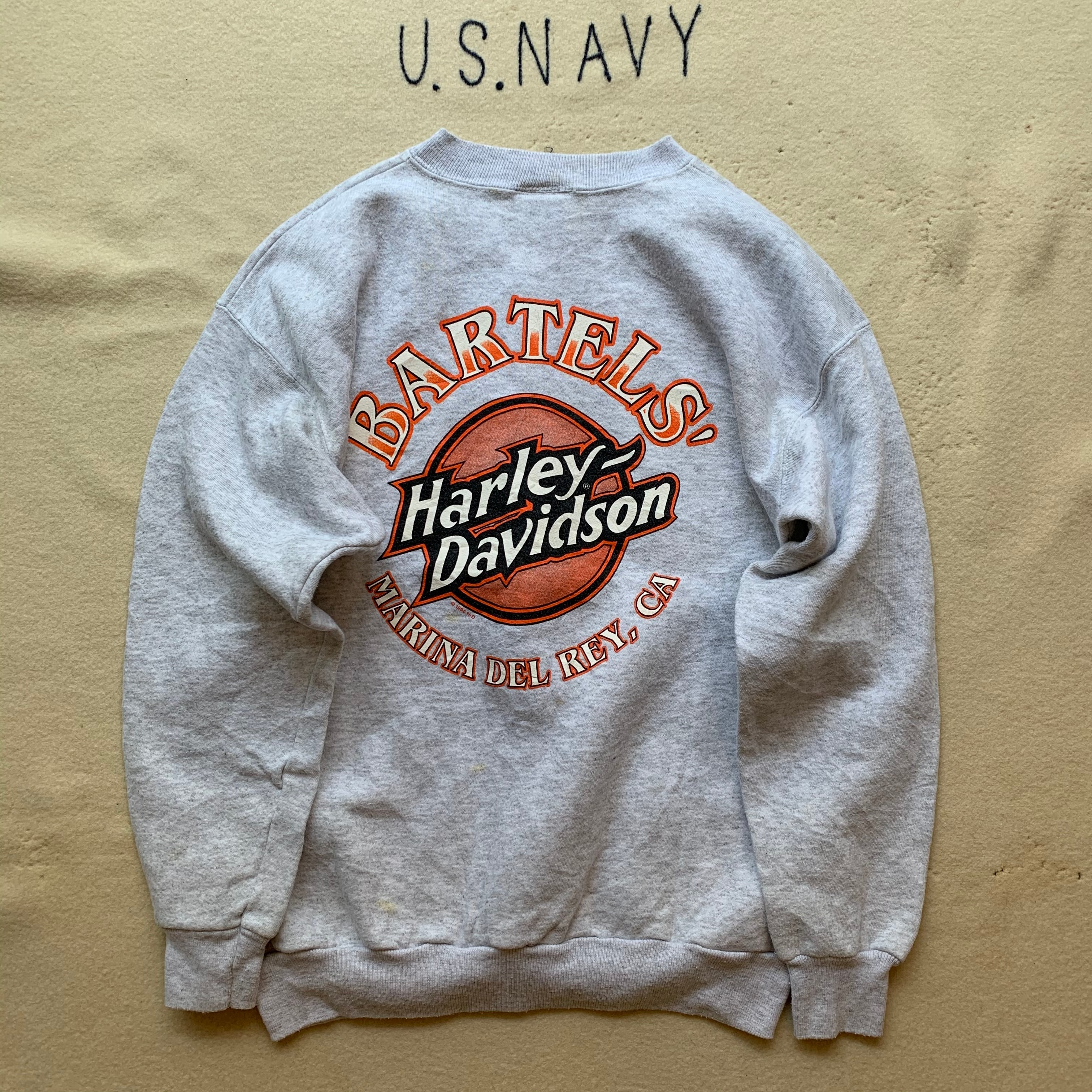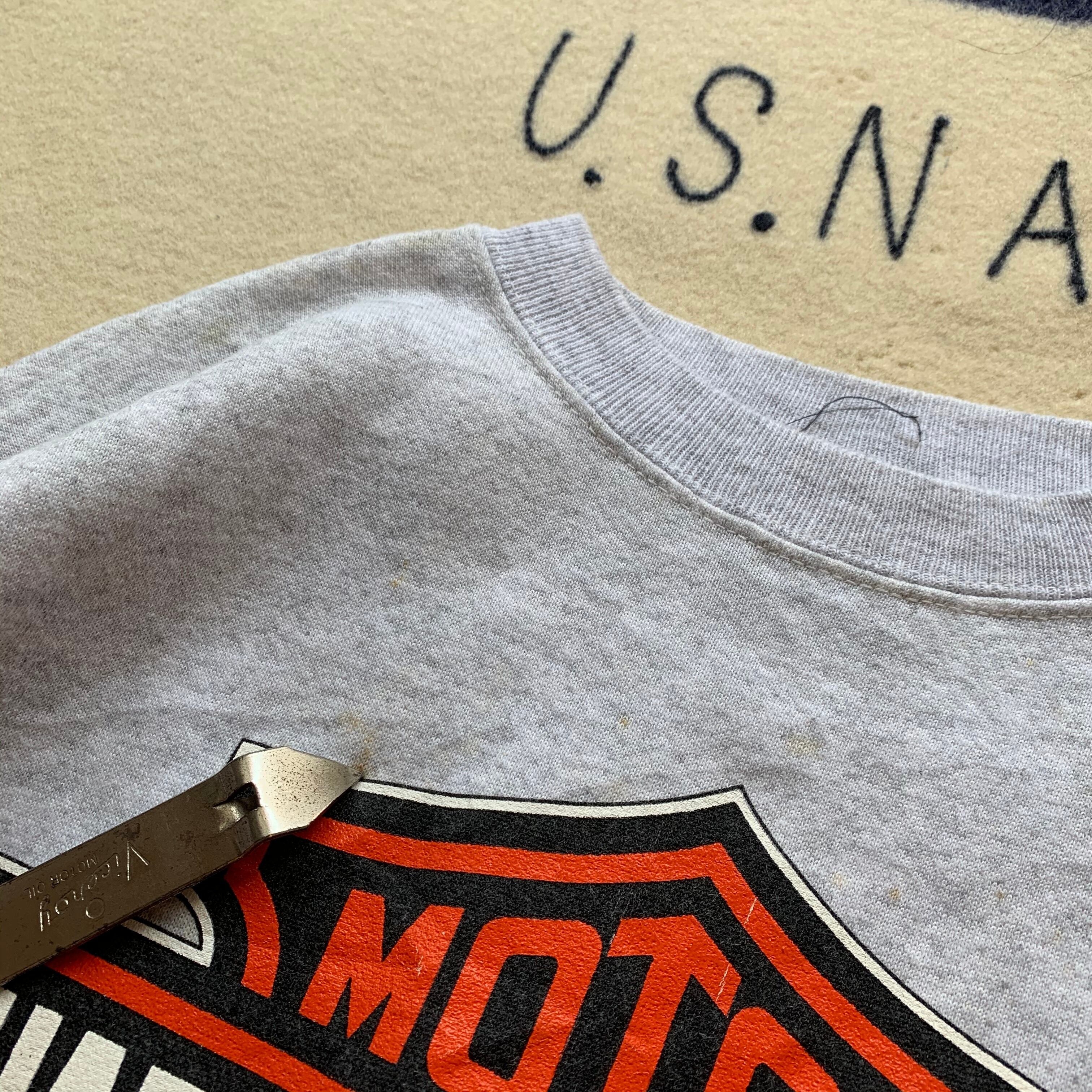 96s コピーライト入りのHarley Davidsonスウェットシャツ。フロントバックにシミあり。それ以外は破れなく古着慣れしていれば問題無く着用可能と思います。