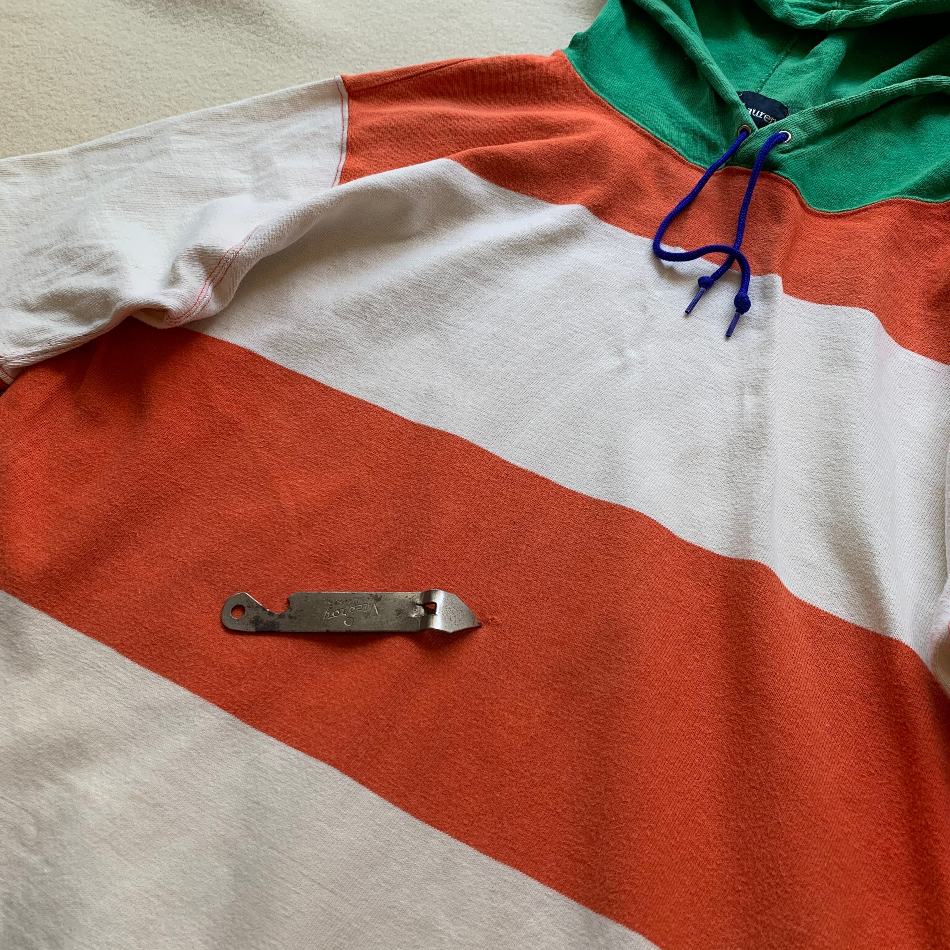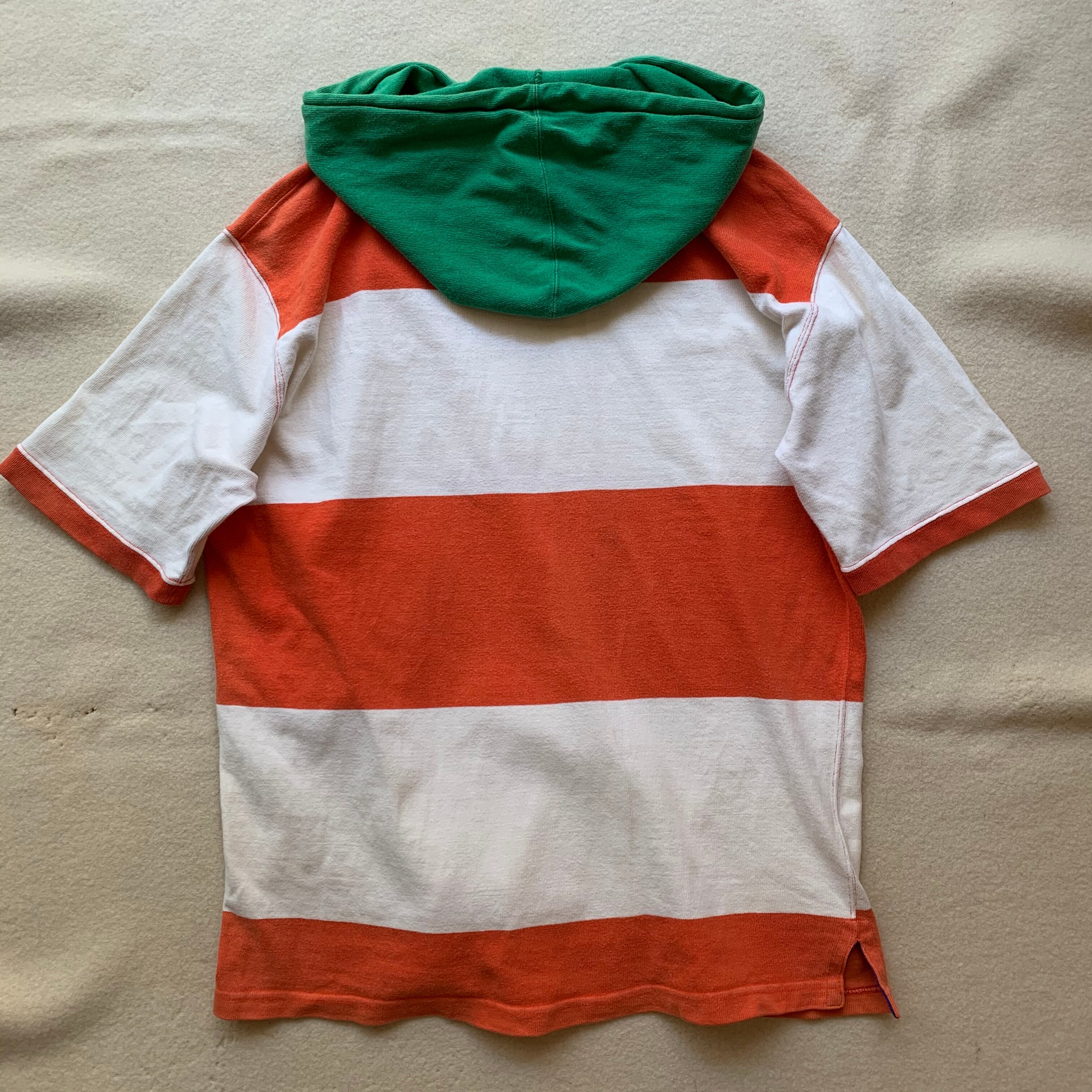 90s P-93 POLO RALPH LAURENのラガーシャツベースのフード付きTシャツ。ラガーベース、カラーはセーリング、フード付きと色々と珍しい組み合わせ。フードがつく事でぐっとカジュアルダウンされてると思います。