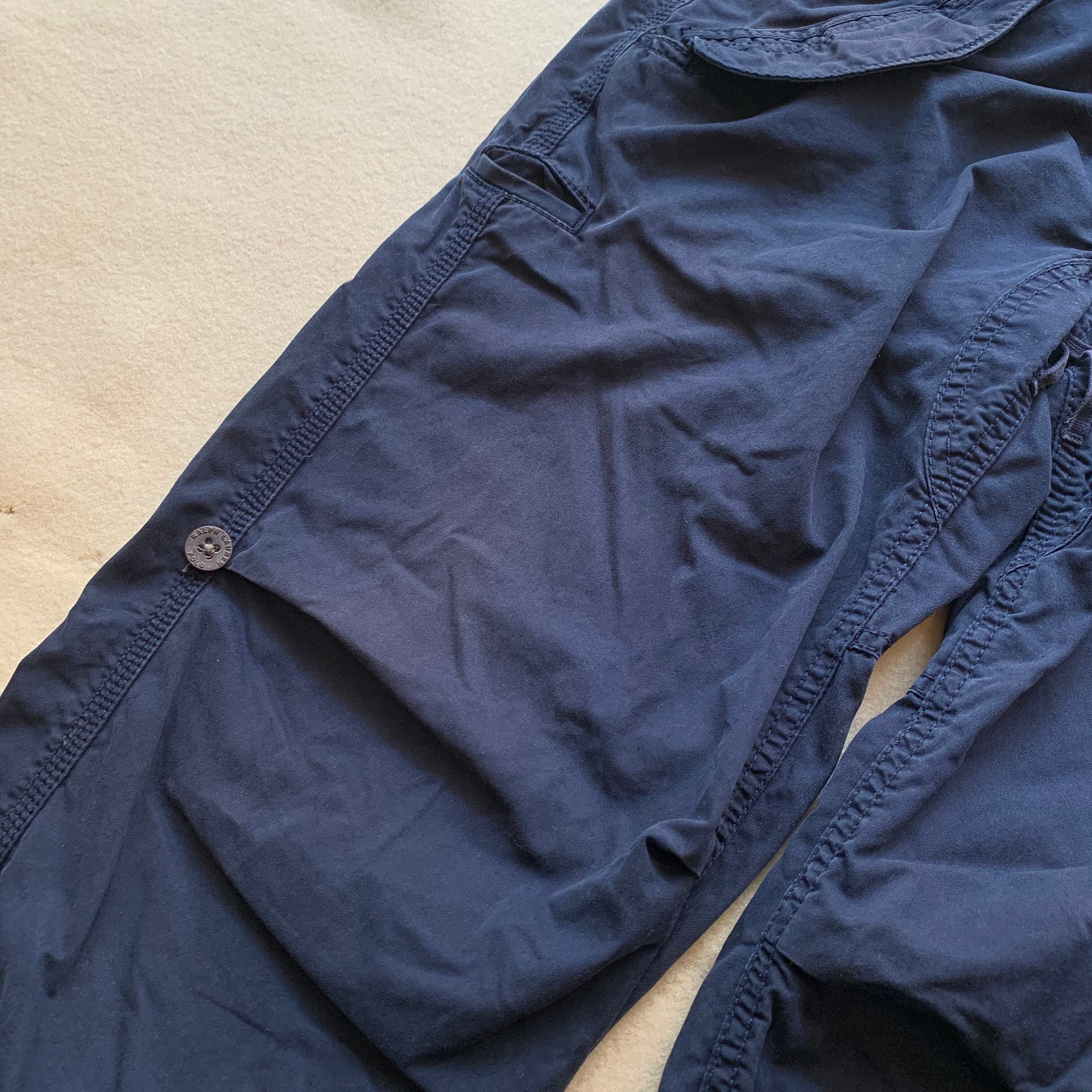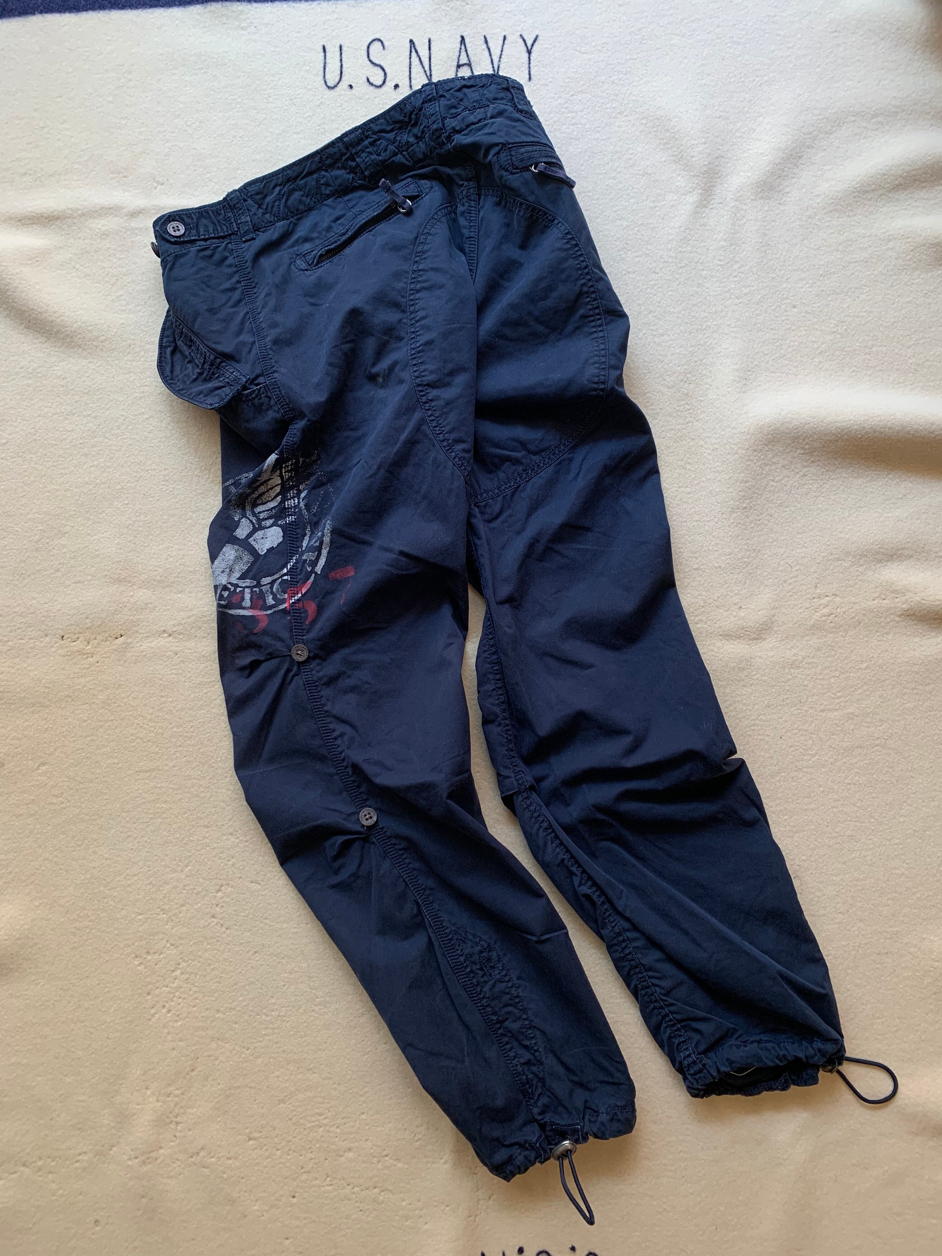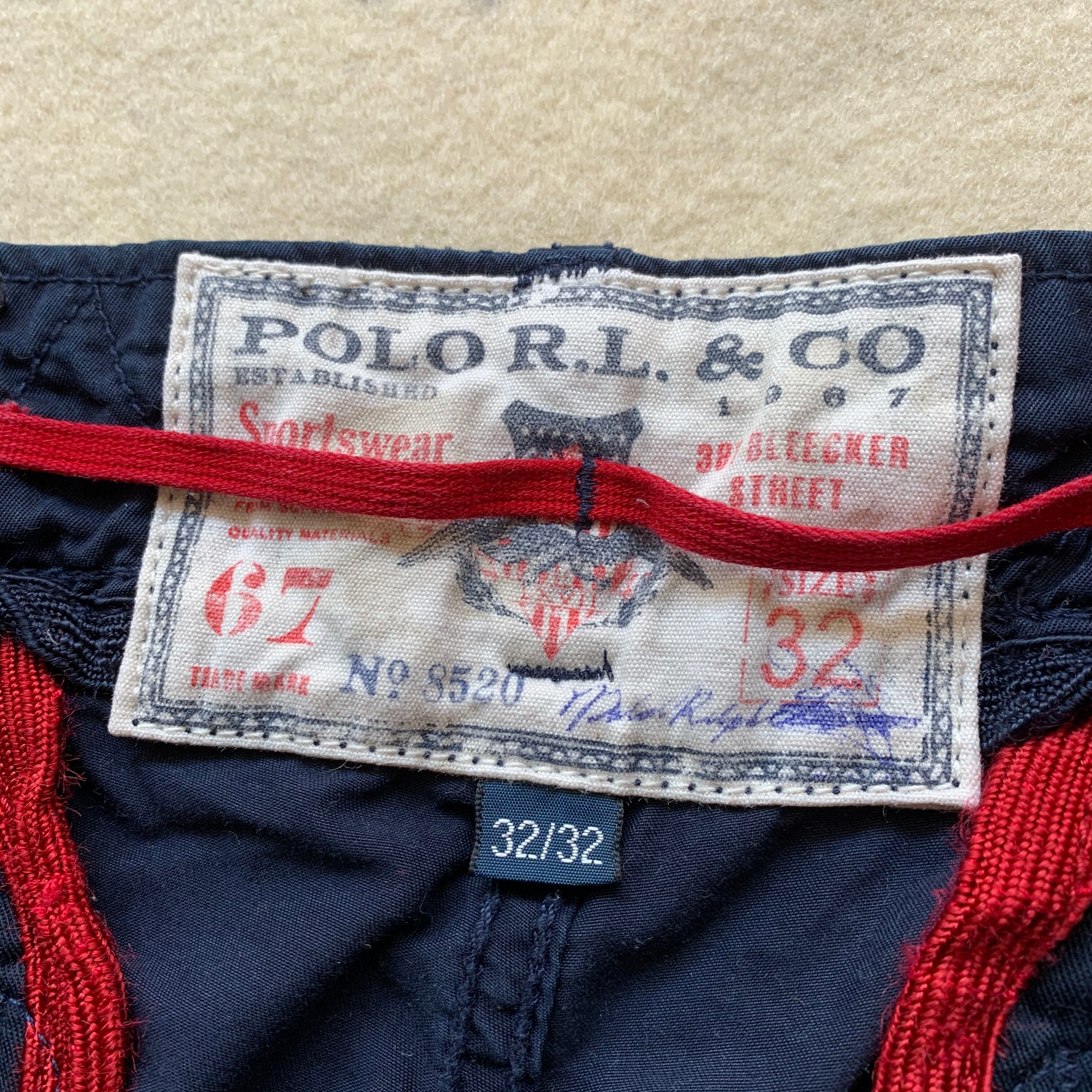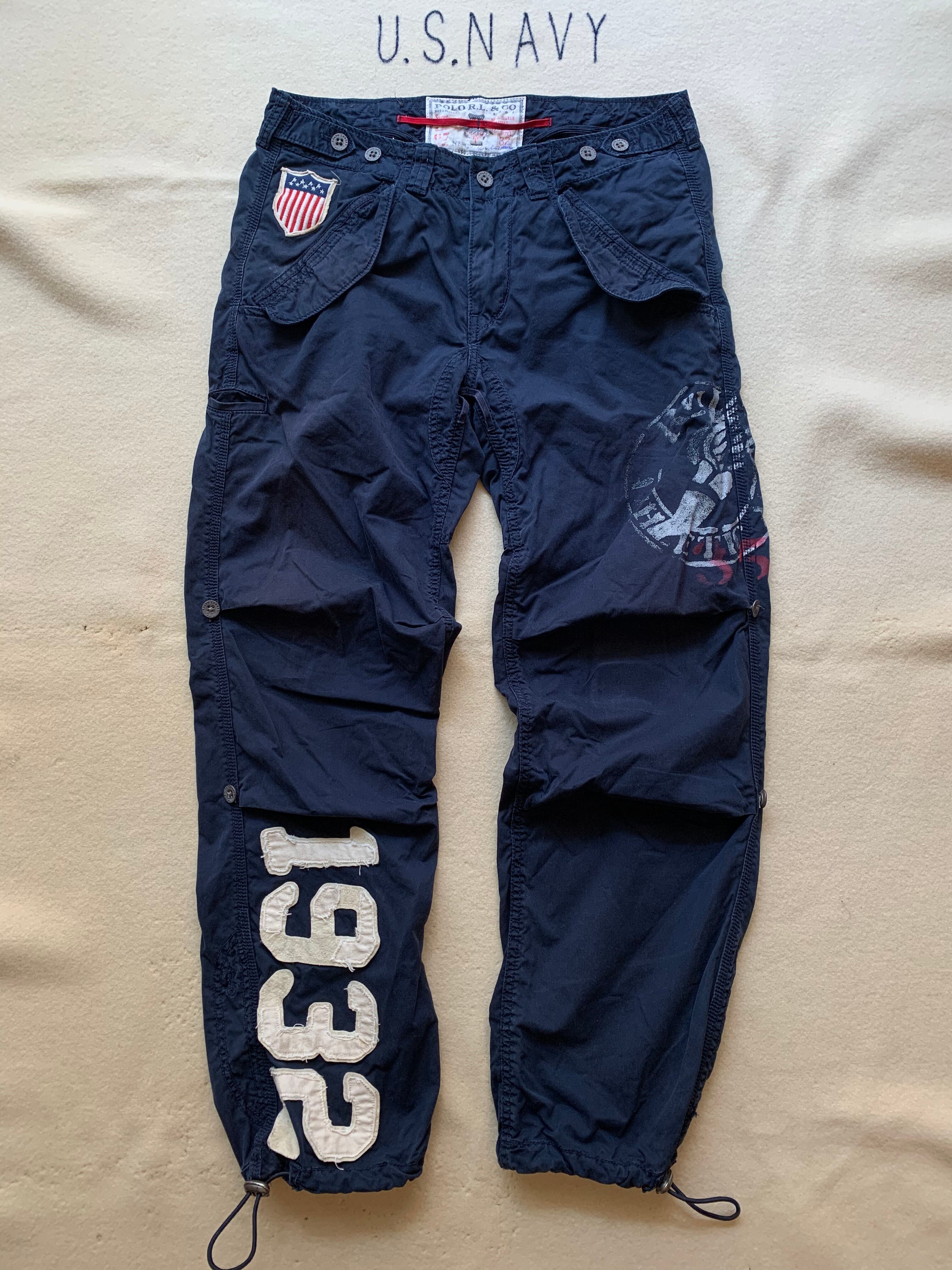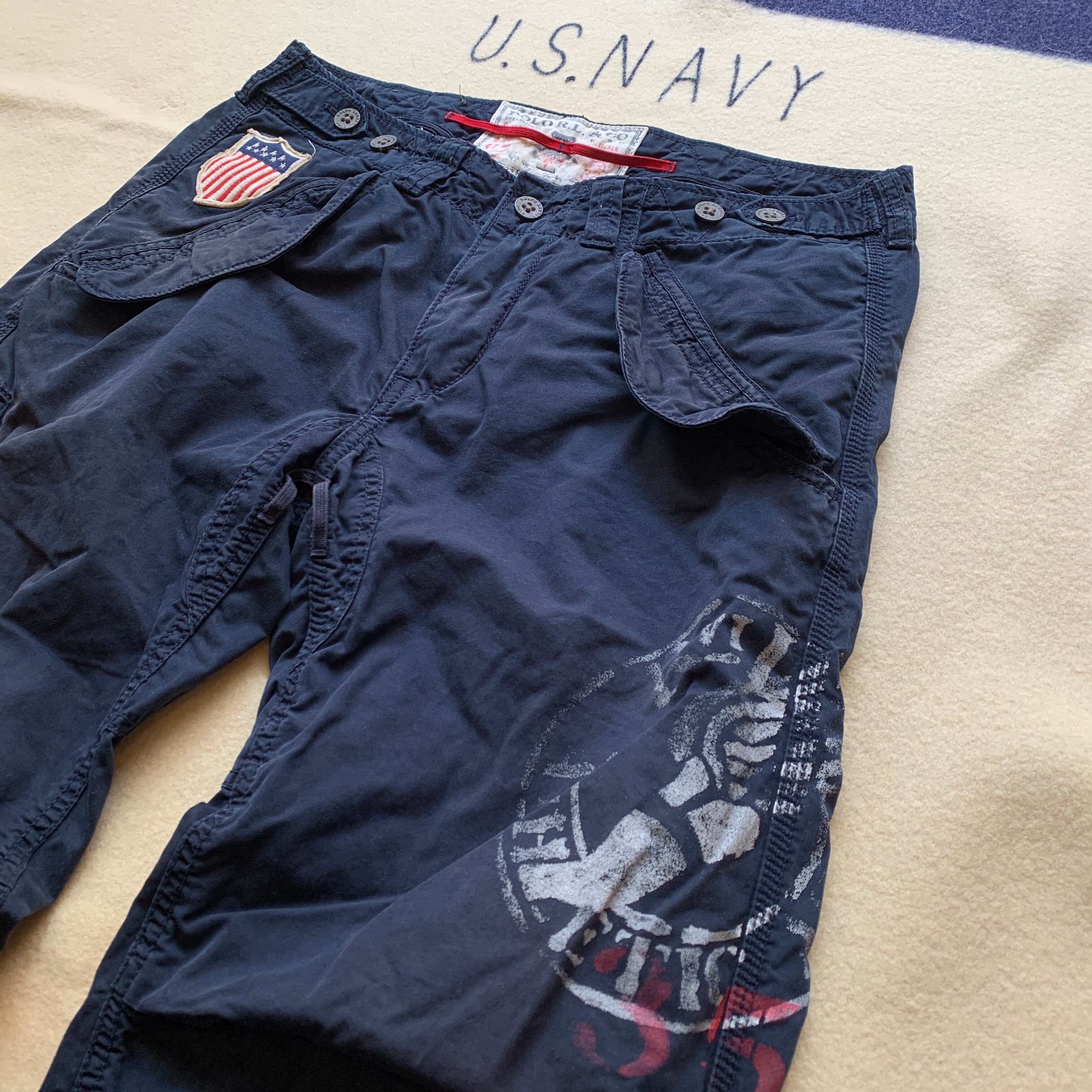 Ralph Laurenのカーゴパンツ。M-65フィールドパンツを彷彿とさせるフロントポケットのフラップやベルトループのアジャスター。生地はコットンポプリン。カラーはネイビー。裾口はゴムストラップでアジャスト可能。