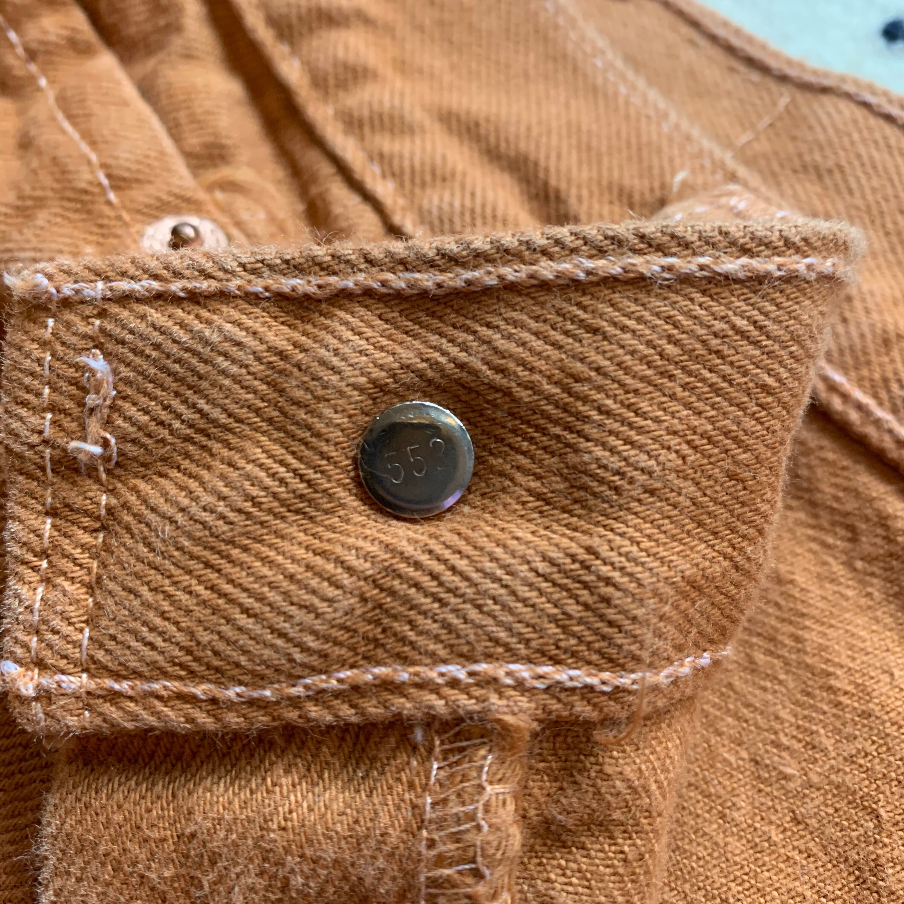 90s頃のLevi’s501。内タグ欠損ですがトップボタン裏552の刻印からUSA製で間違いないです。恐らく後染め。土色に近いオレンジのような暖色カラー。
