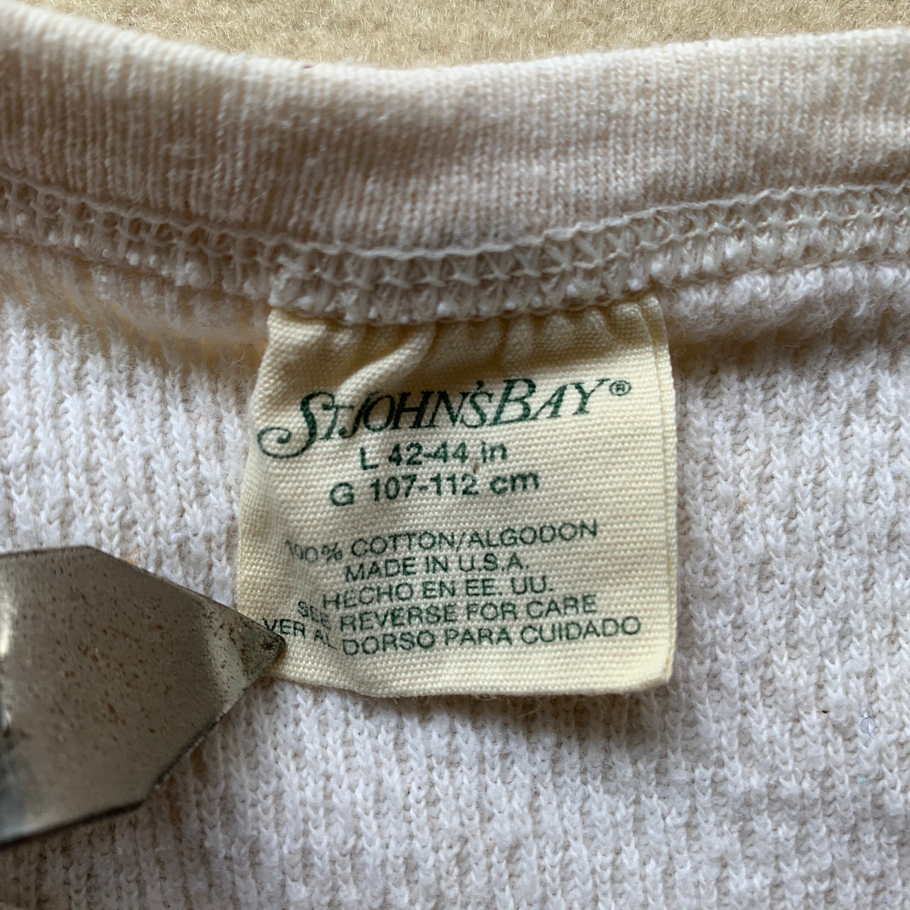 80s頃のサーマルシャツ。St Jones Bayブランド、コットン100%、ハニカム地の古いタイプです。一枚持っておくと重宝すると思います。サイズ大きめなのでインナーでもアウターでも。