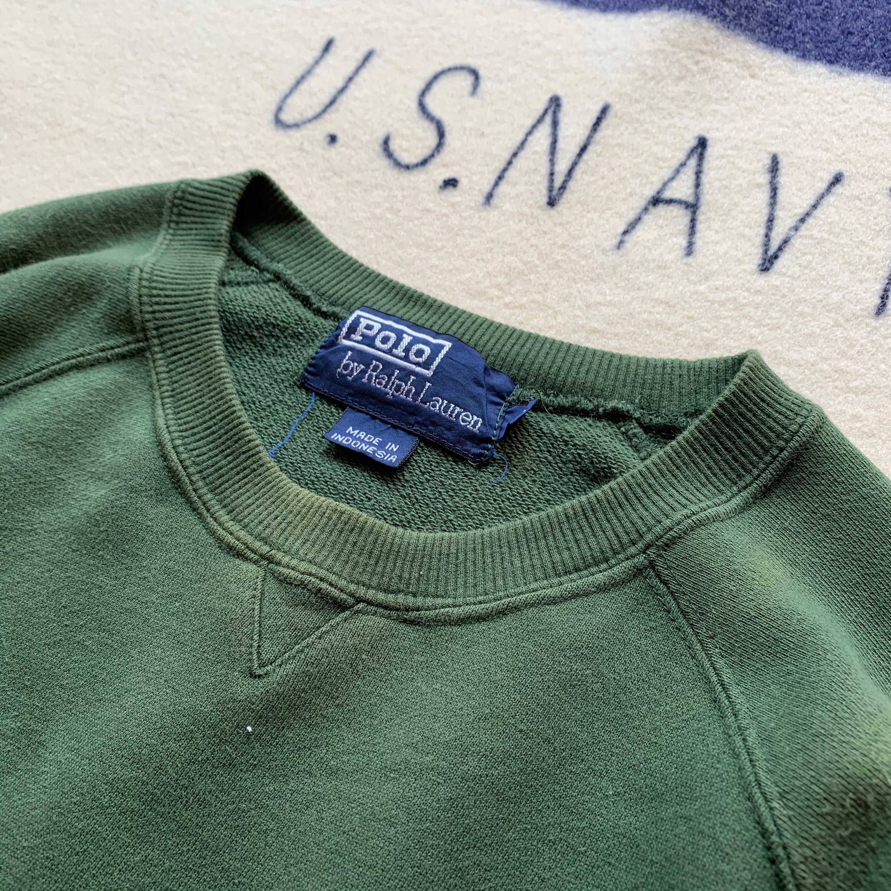90s頃のヴィンテージスウェットシャツ。ワンポイントのラルフロゴにモスグリーンの良いカラーです。