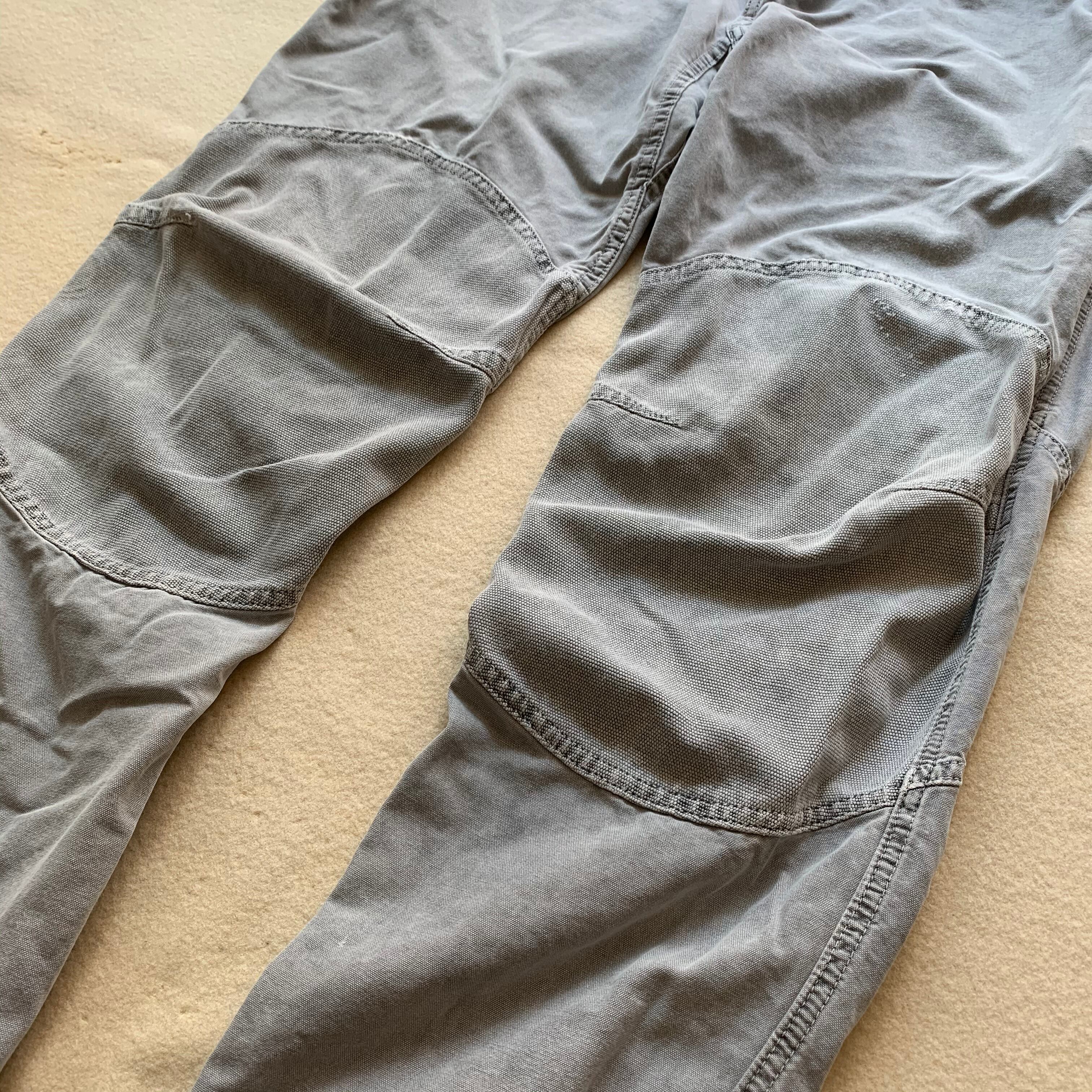 gramicciのクライミングパンツ。ダブルニー仕様になっているものはたまに見かけますがこれは初見です。楕円に補強された珍しい一着。最近みかけないmade in USA。