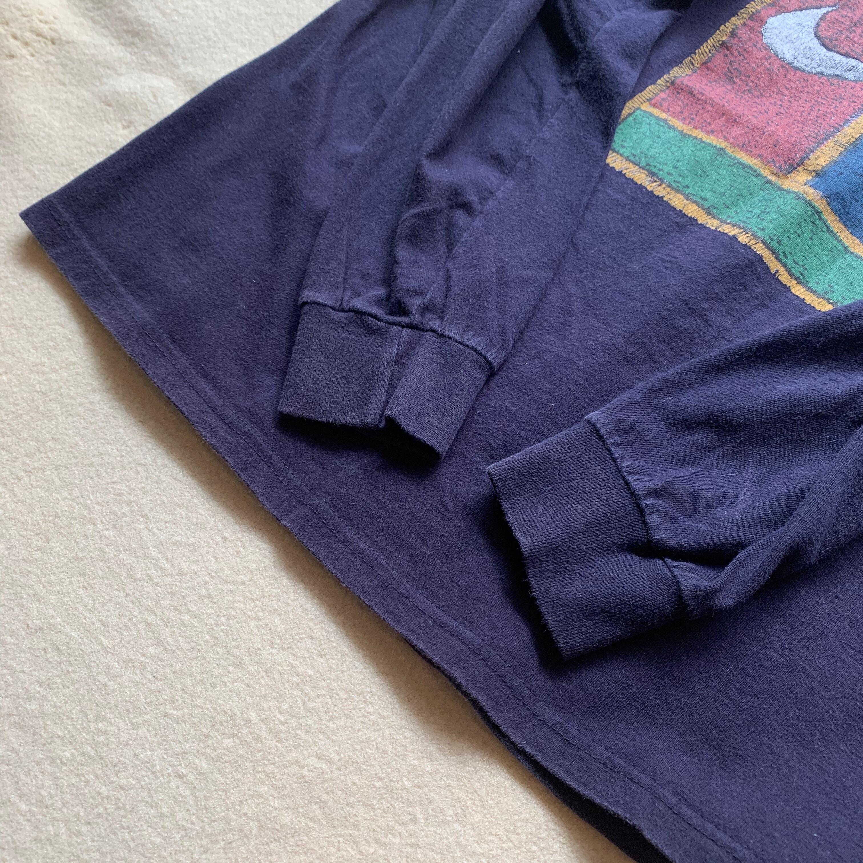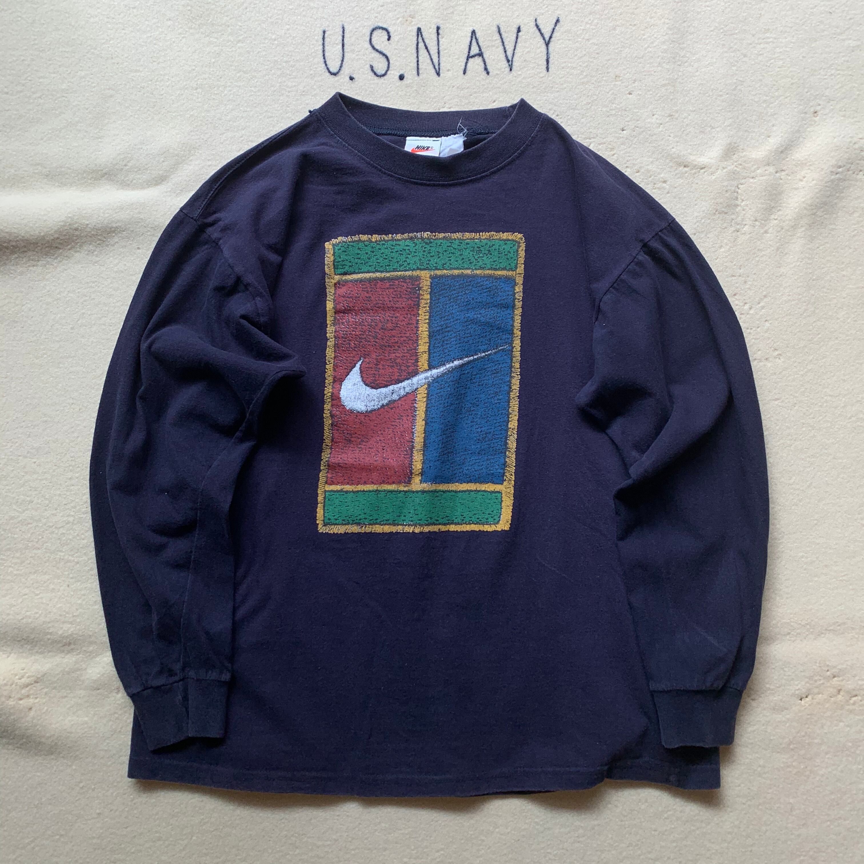 90s頃の銀タグがつくNIKE ロンT。フロントのプリントはテニスコートモチーフと思います。カラーはネイビー、大きめスウォッシュで一枚でキマる重宝する一着です。
