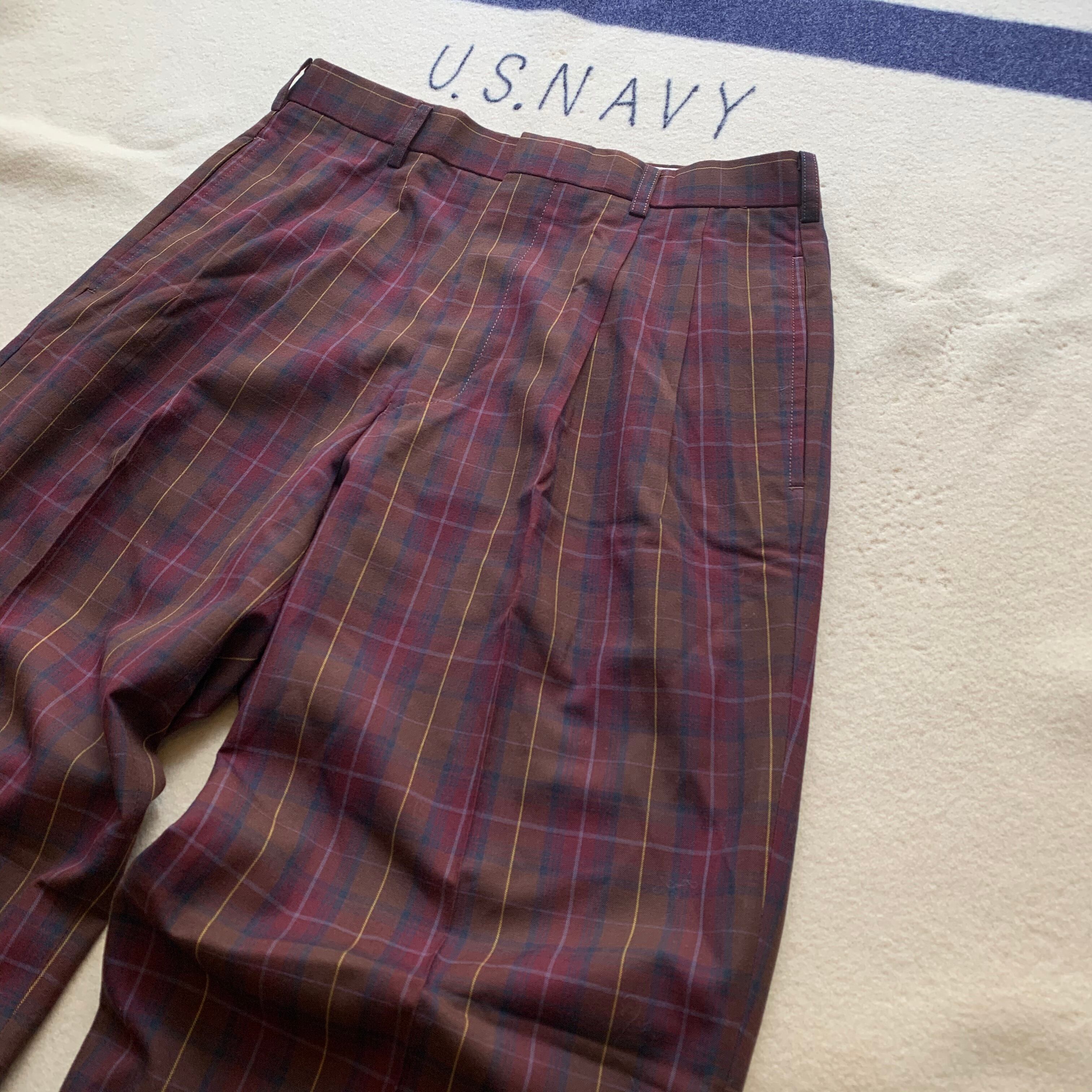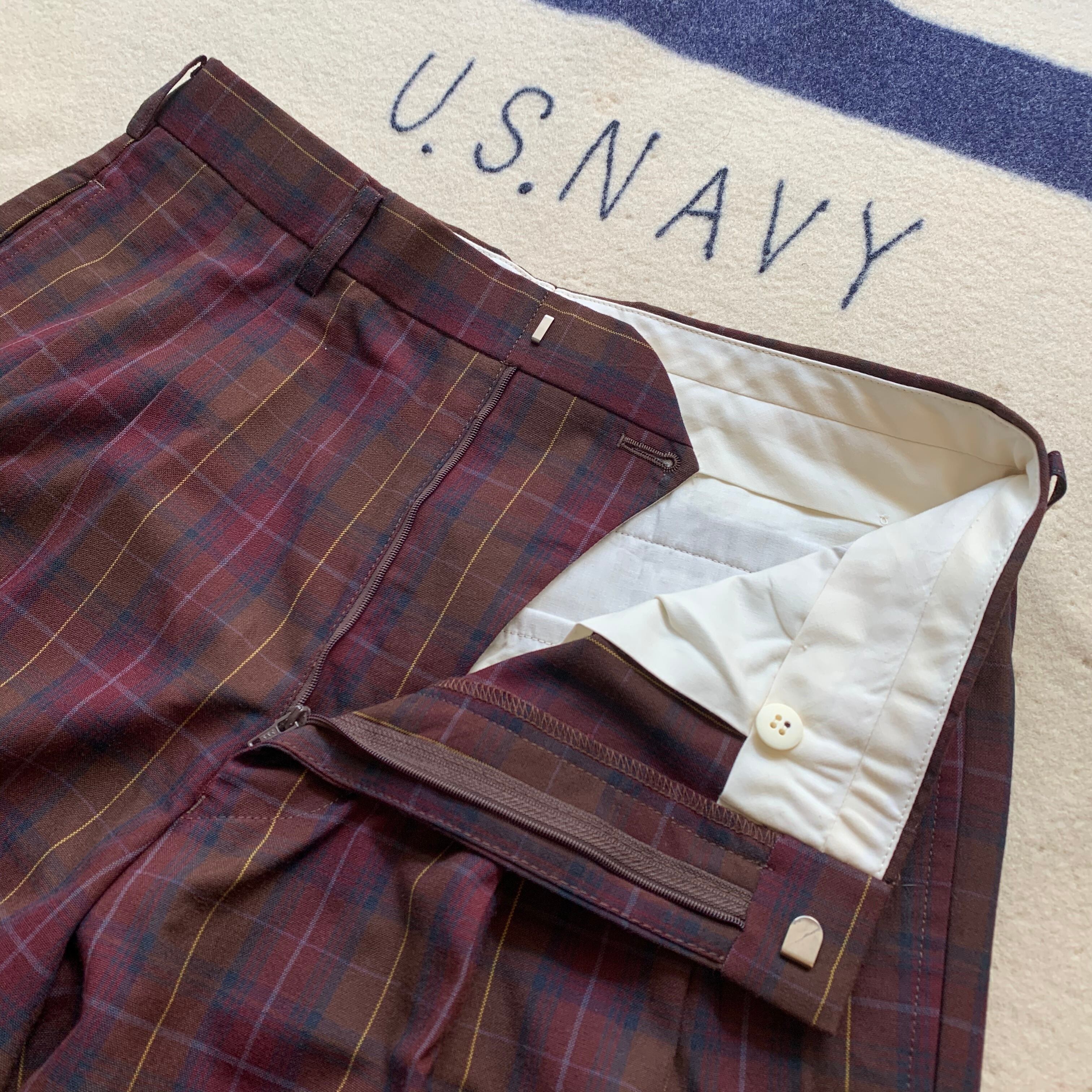 当時恐らく日本で売られていたスラックス。配色、シルエット凄く良いと思います。ポリエステル×レーヨンで薄手の柔らかい生地感。ハイウエストで絞ってもかわいいと思います。シャツインのスタイルにも是非。