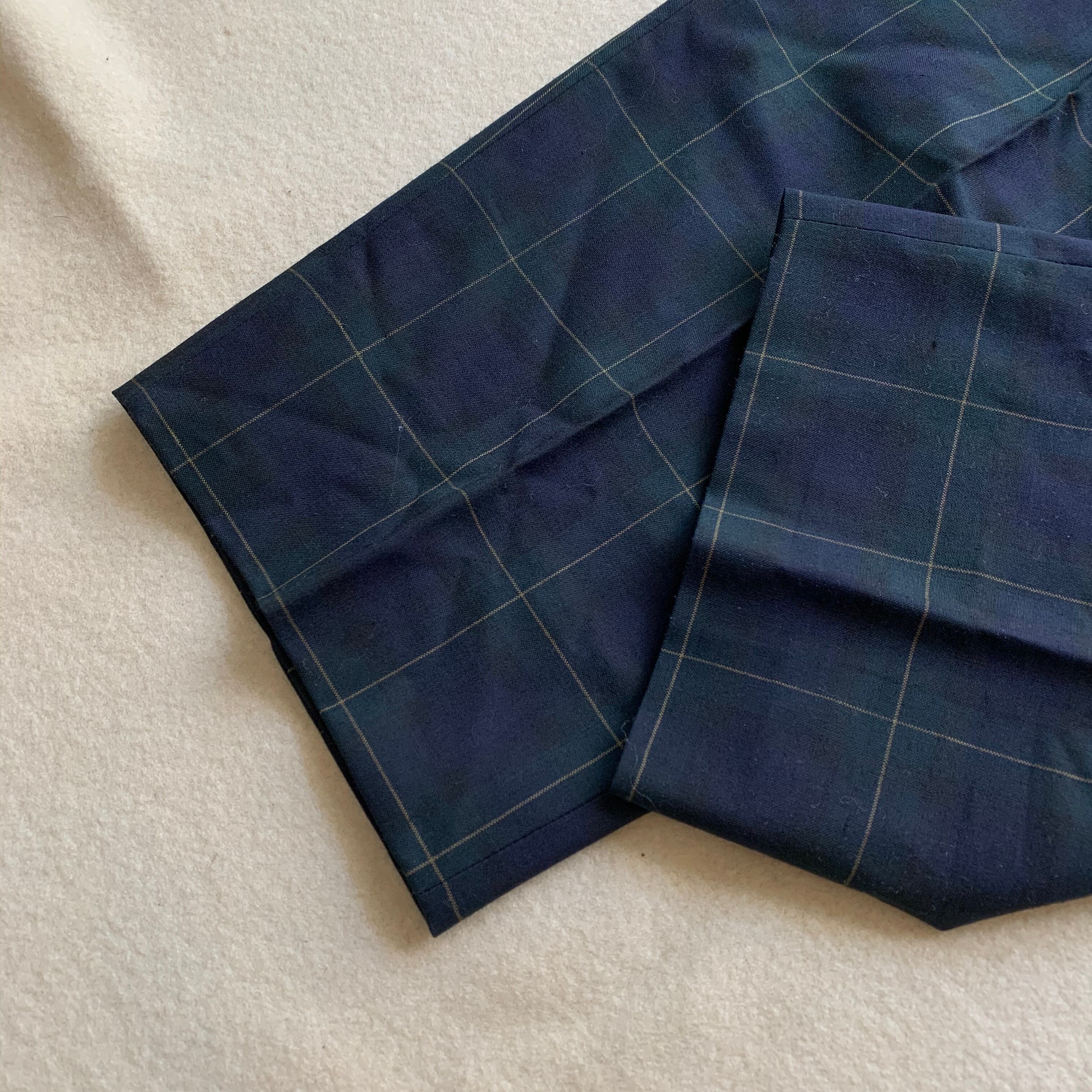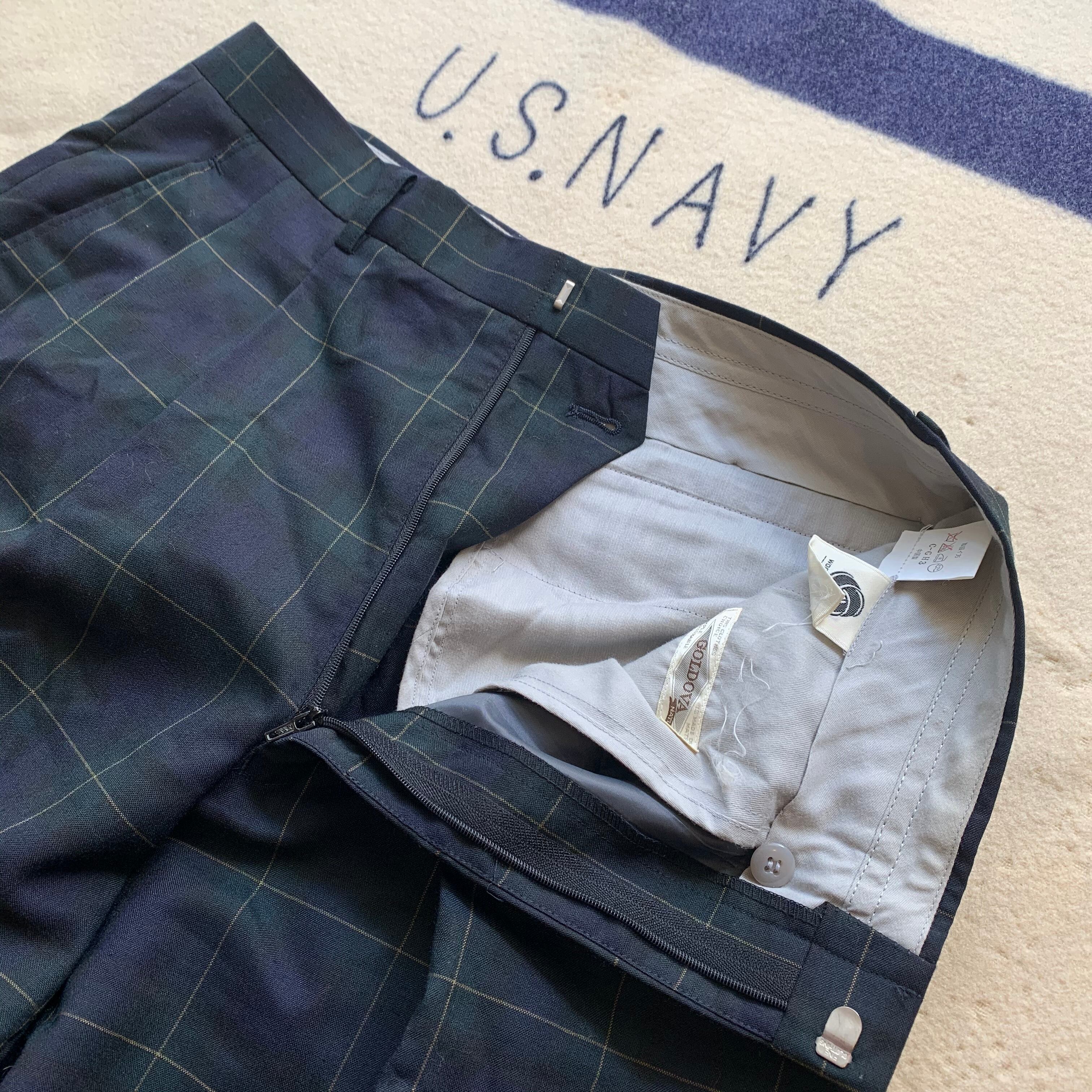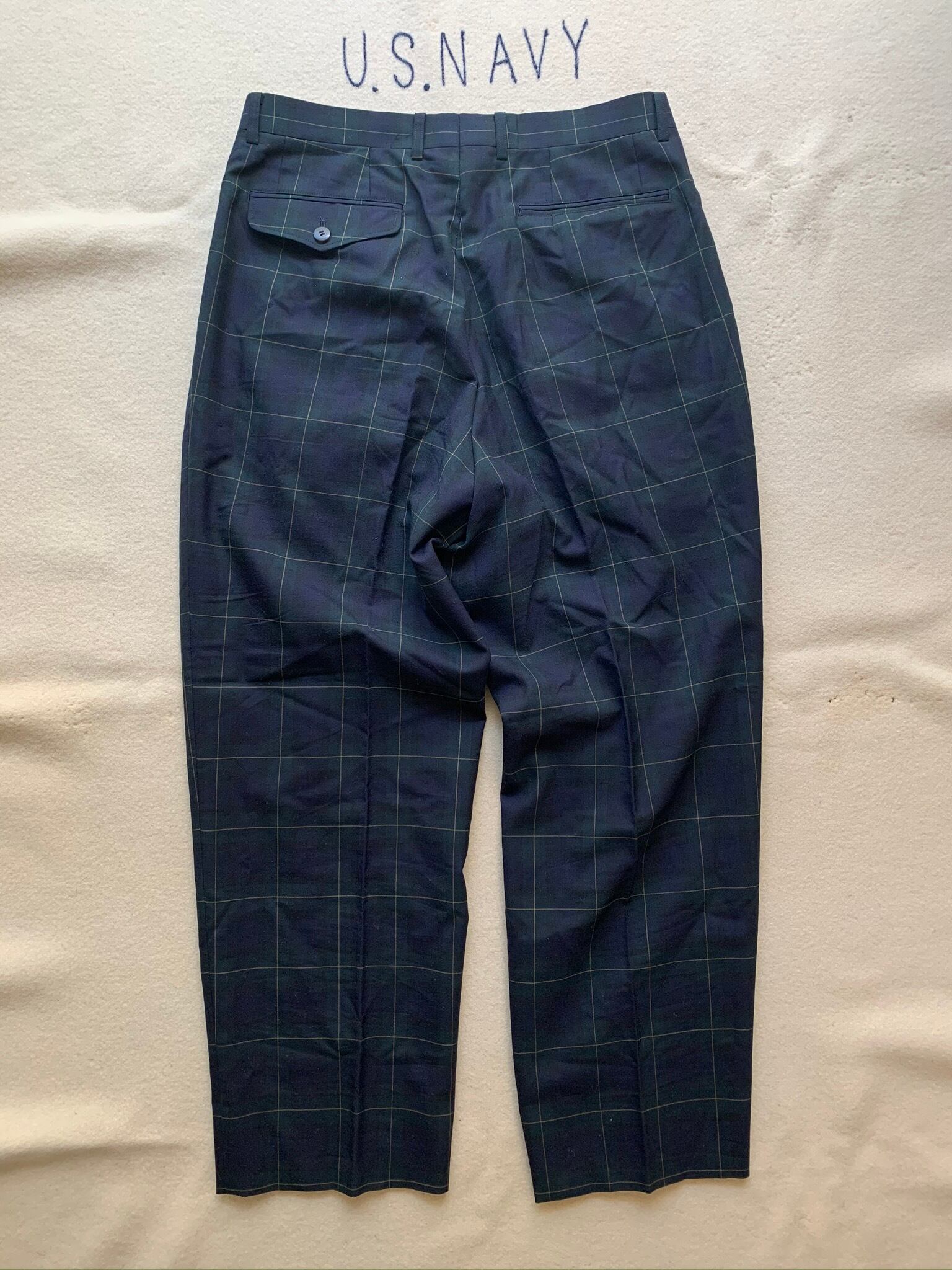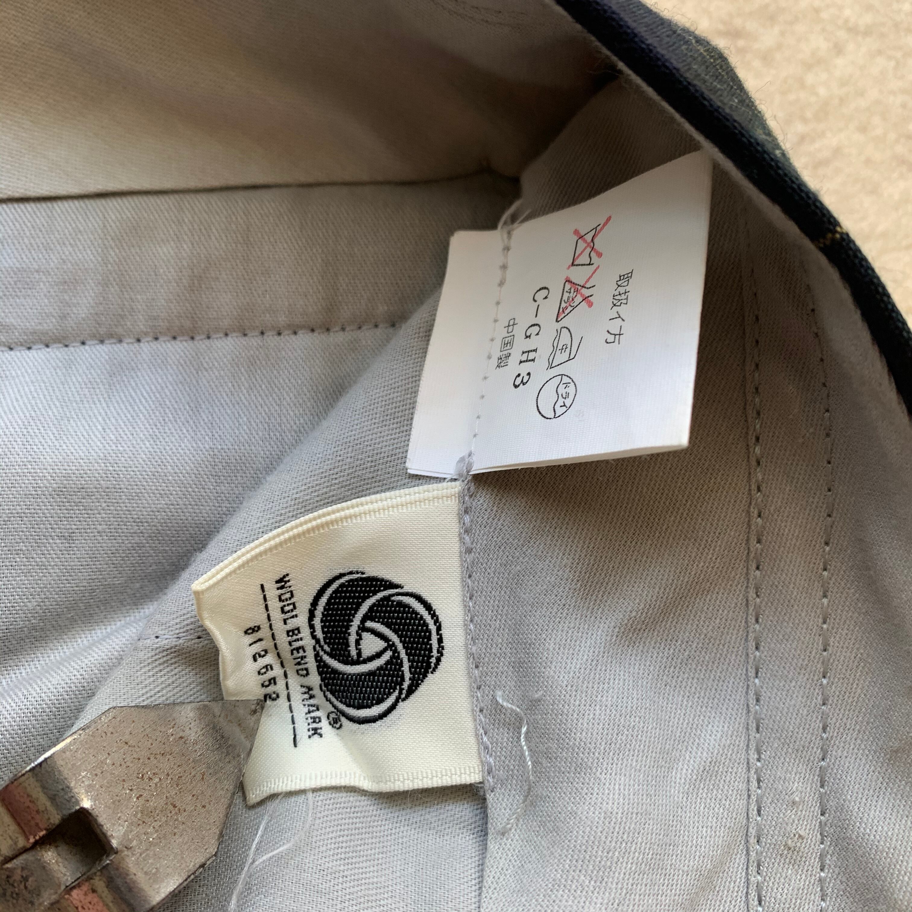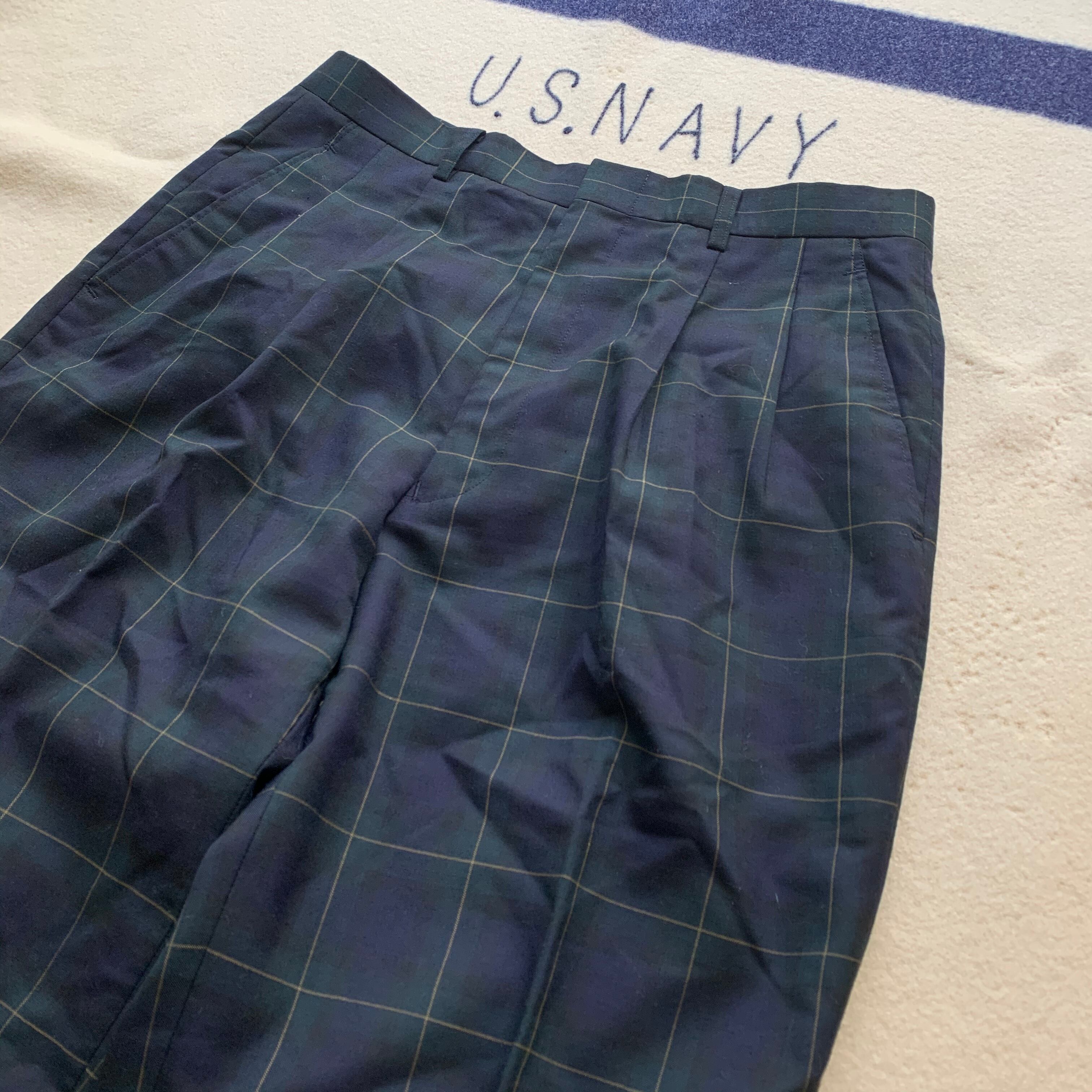 当時恐らく日本で売られていたスラックス。配色、シルエット凄く良いと思います。ウール×ポリエステルで薄手の柔らかい生地感。チクチクはしません。ブラックウォッチライクなチェックパターンです。