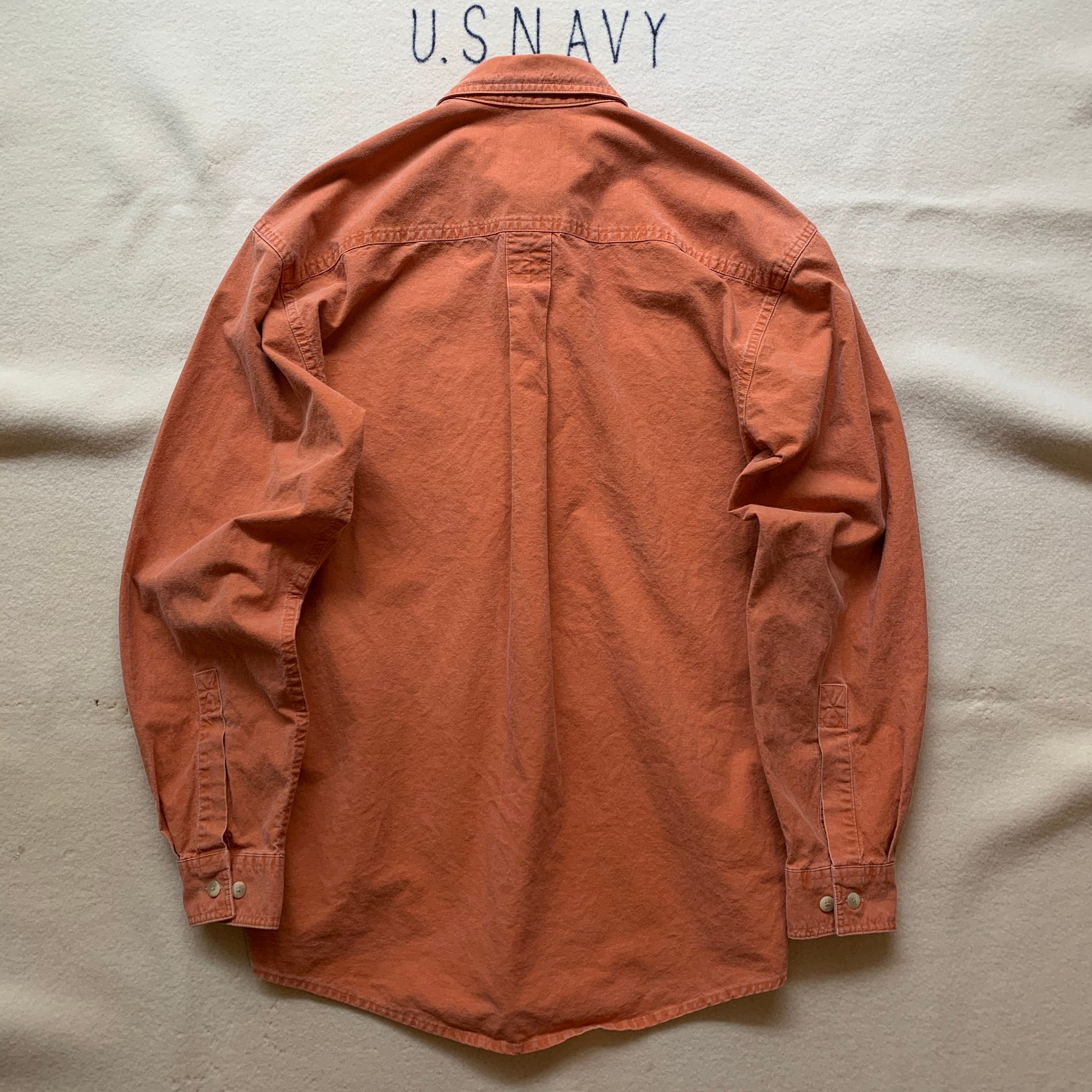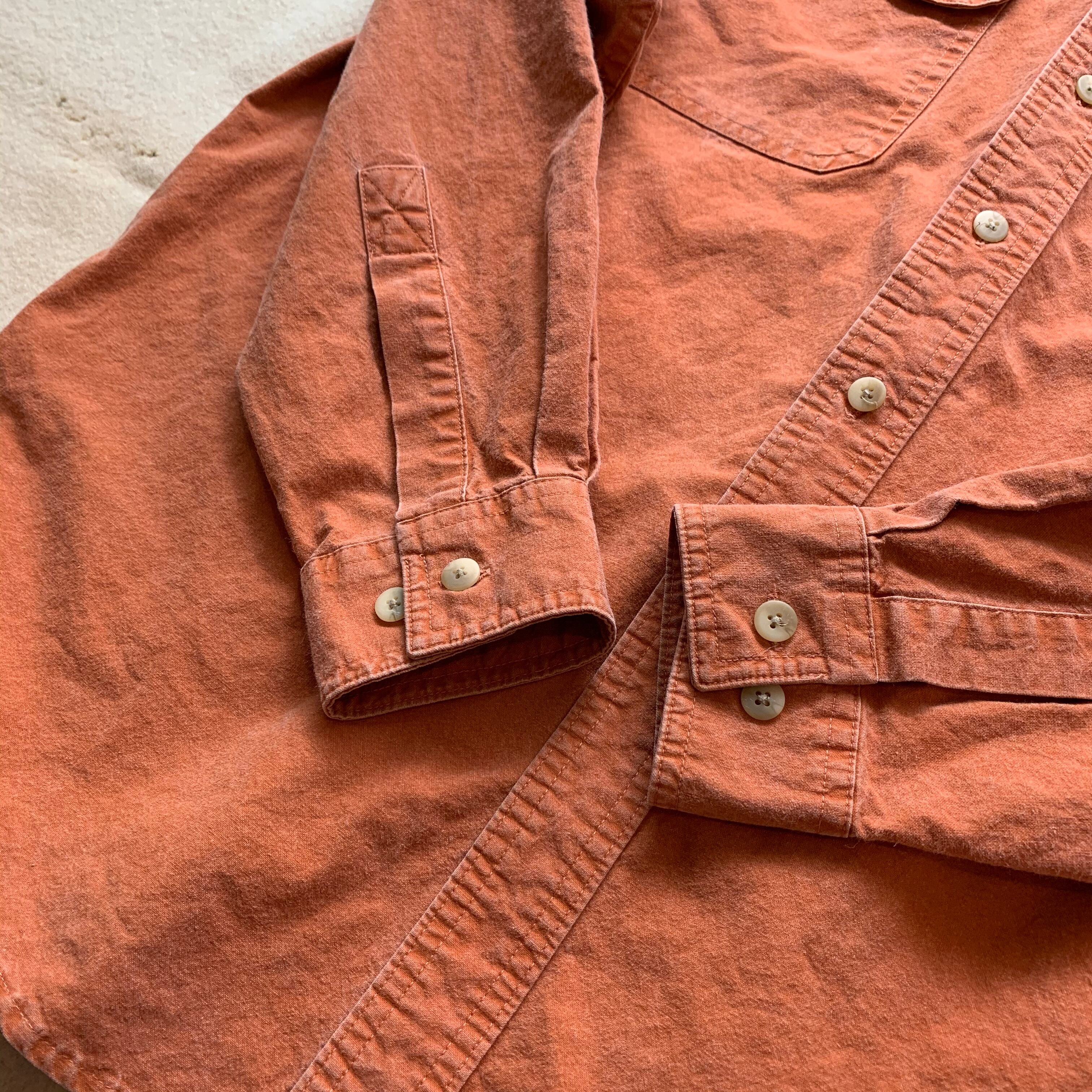 パリッとしたコットン100%でごつめ生地のワークシャツタイプ。カラーはオレンジのフェイドがかった感じ。良い色です。