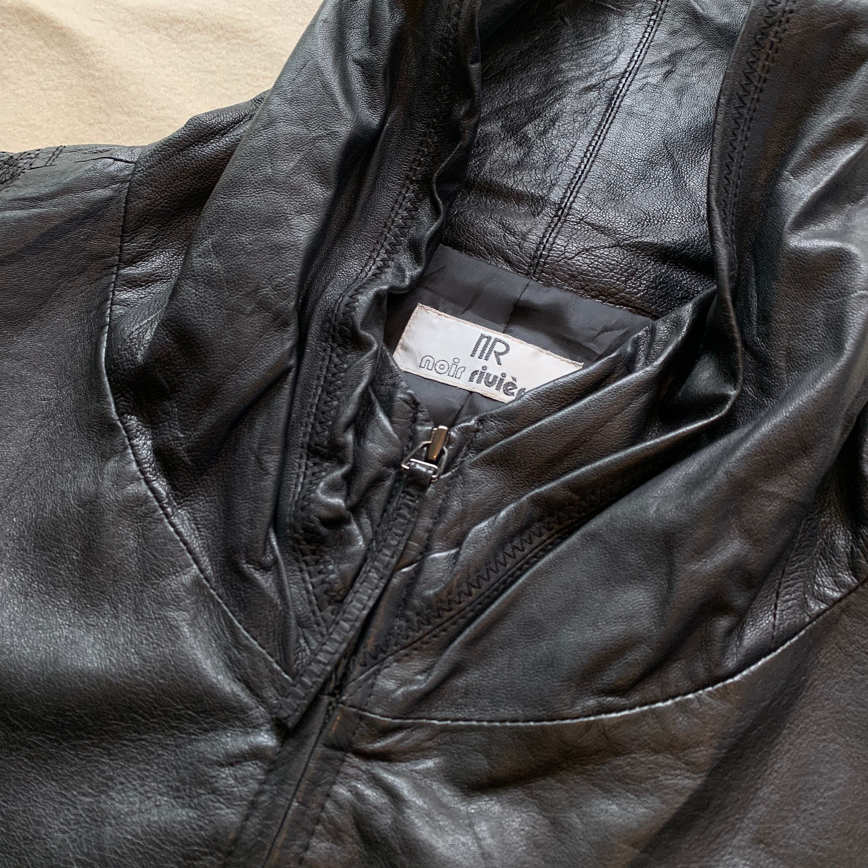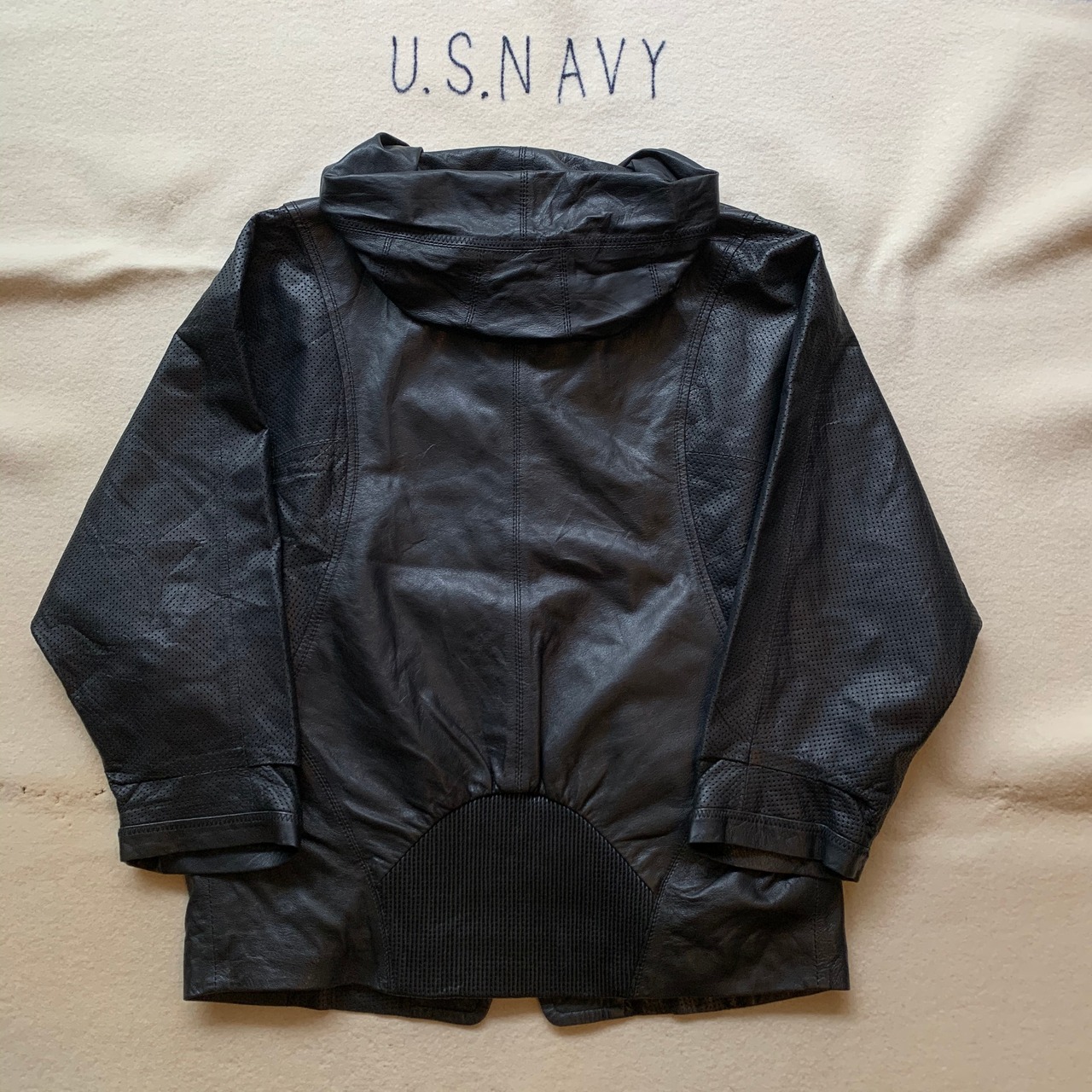 90s イタリアのレザーを使ったヴィンテージジャケット。薄手のレザーにパンチングの切り替えし等、とても手のかかっているジャケットと思います。パーカーのようにもたたんでカラーをつくって着用できます。ドルマンスリーブも良いシルエットです。