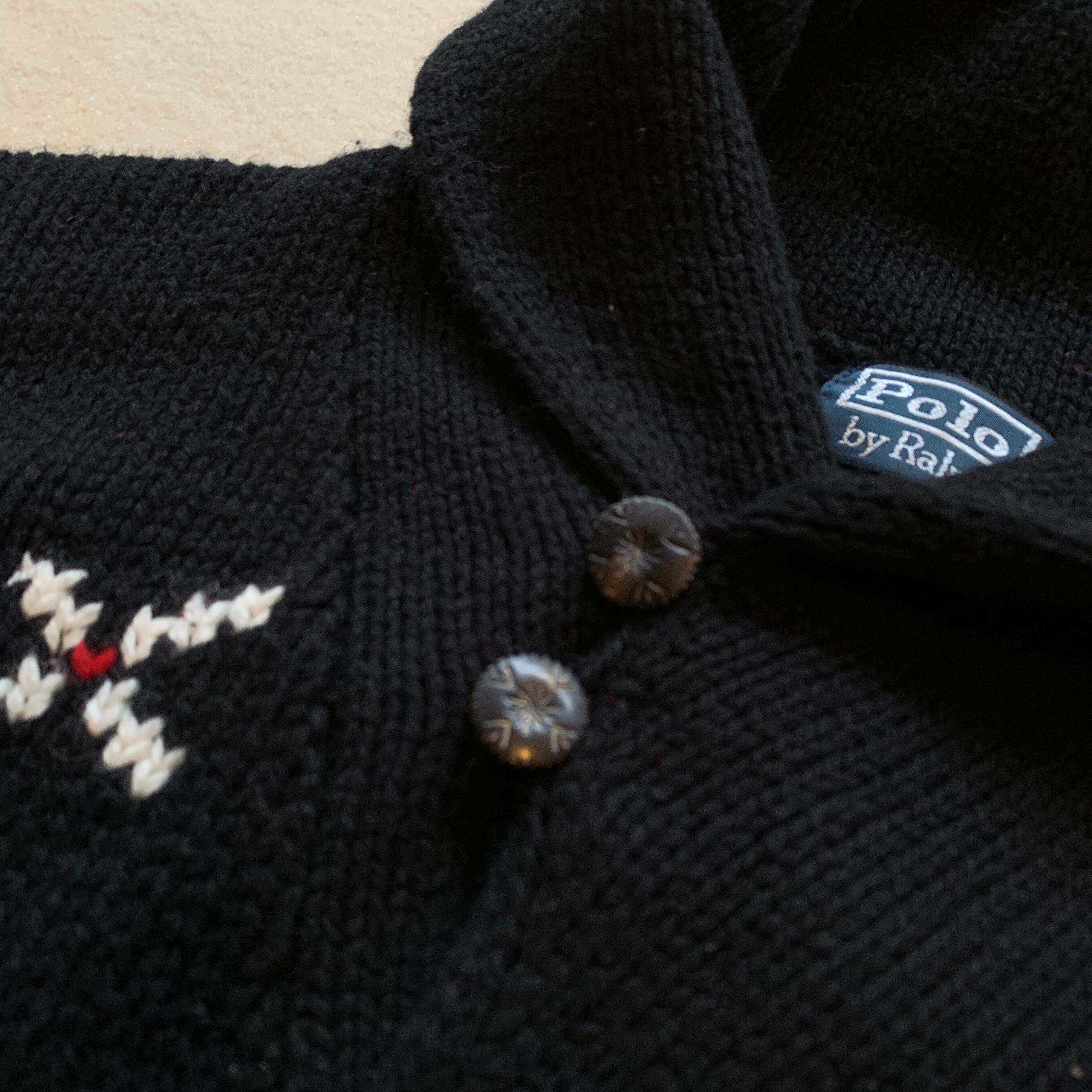 POLO by RALPH LAURENのショールカラーセーター。ブラックボディにノルディックパターン。胸元のボタンに入るデザインやコットン×カシミヤの素材感、カラーリング等ただかっこいい一枚です。ラルフらしい仕事の細かい一着。