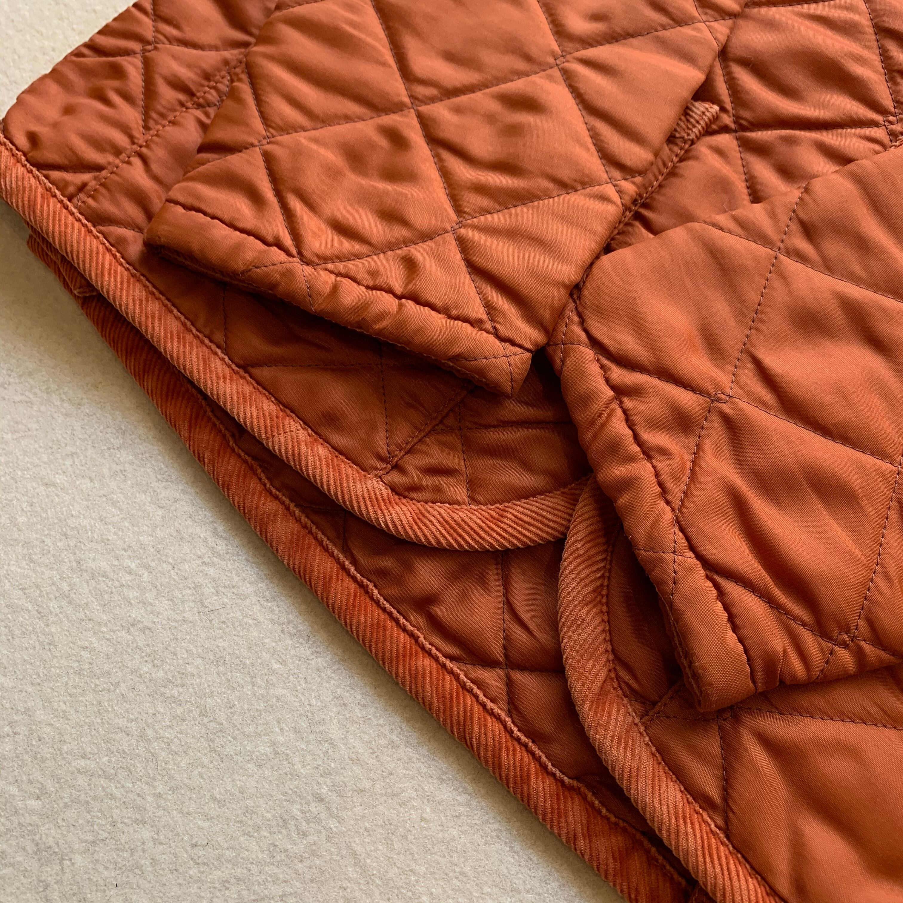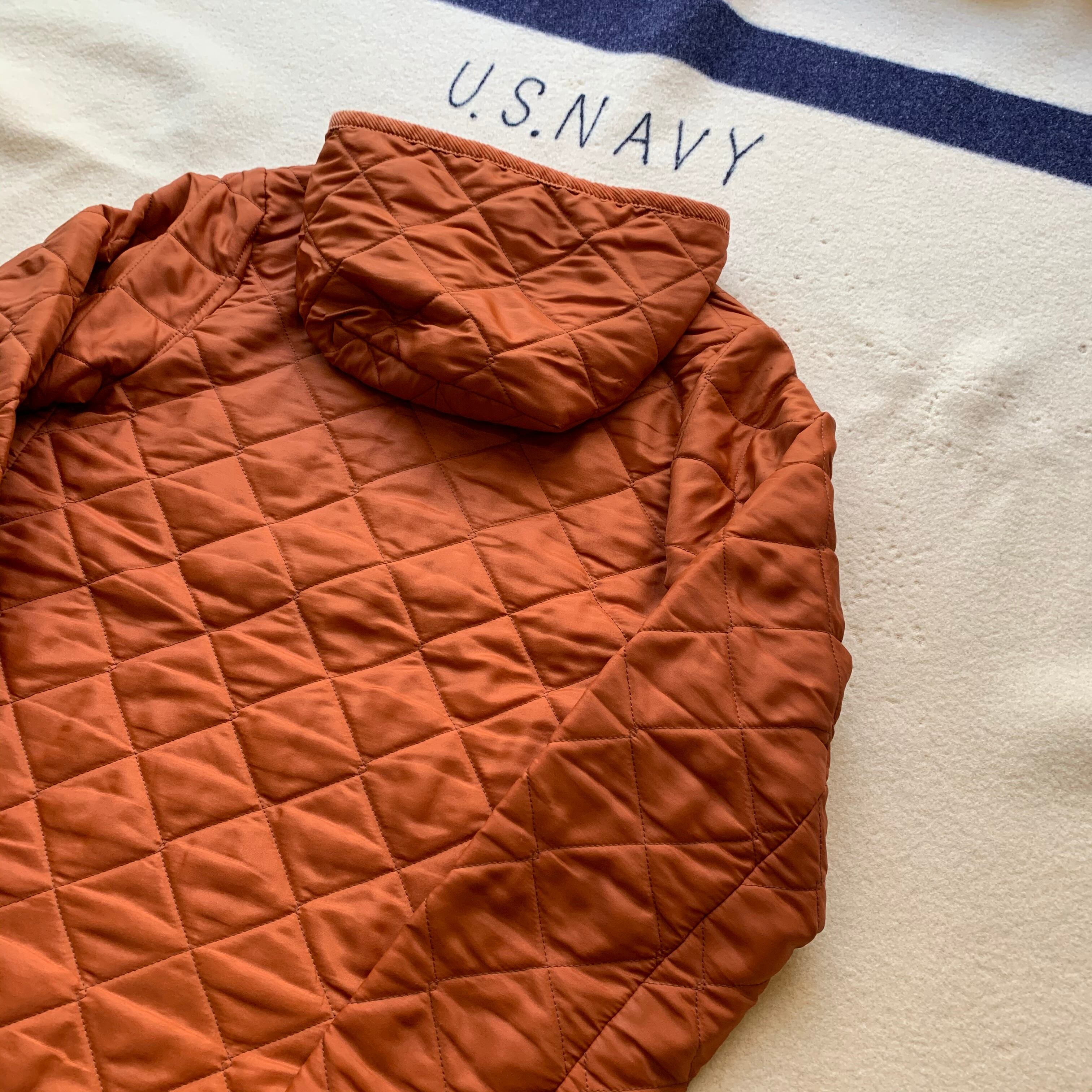 LAVENHAMの定番キルティングジャケット。フード一体型のタイプ。カラーはオレンジ。一枚でコーディネートが決まるので持っておくと重宝するアイテムです。