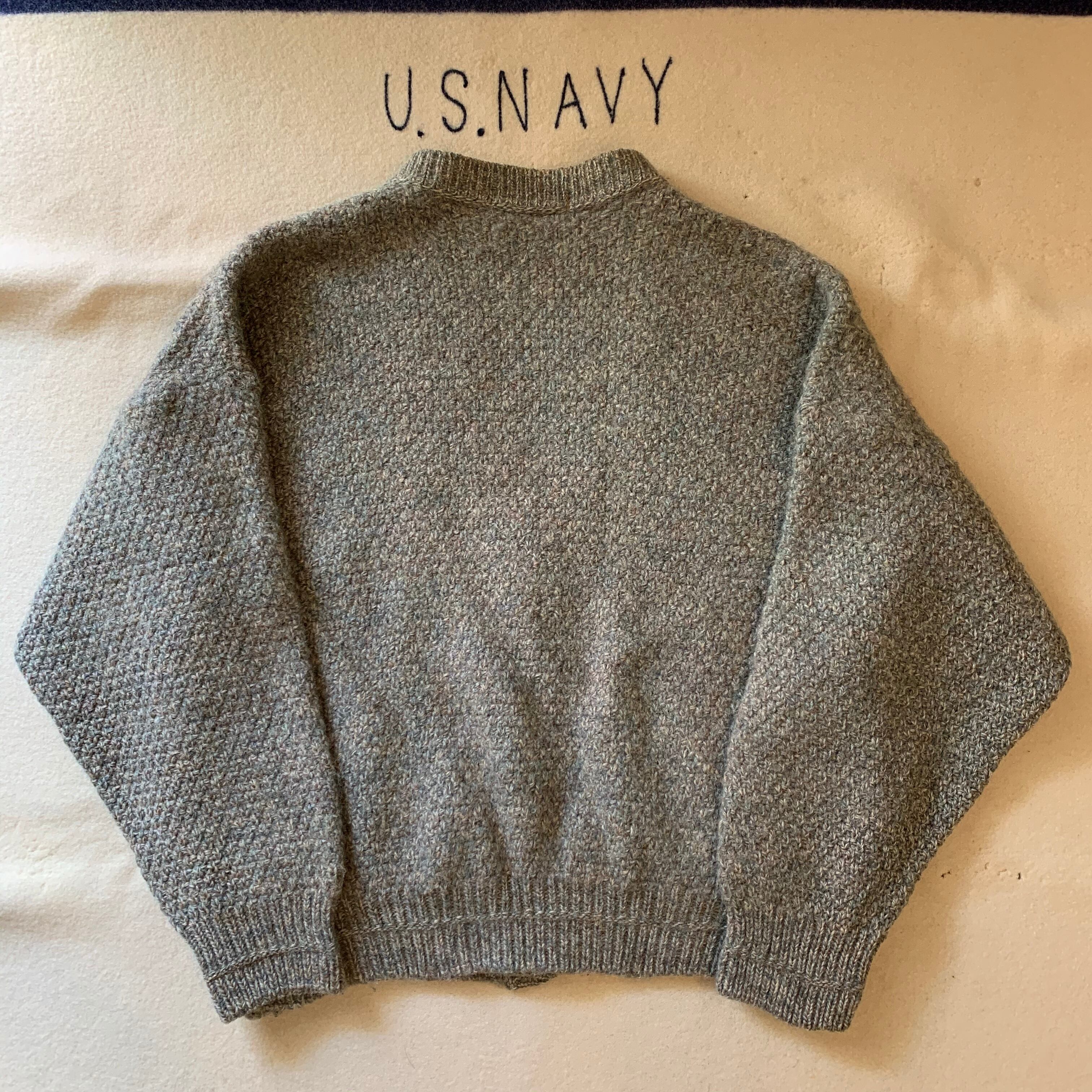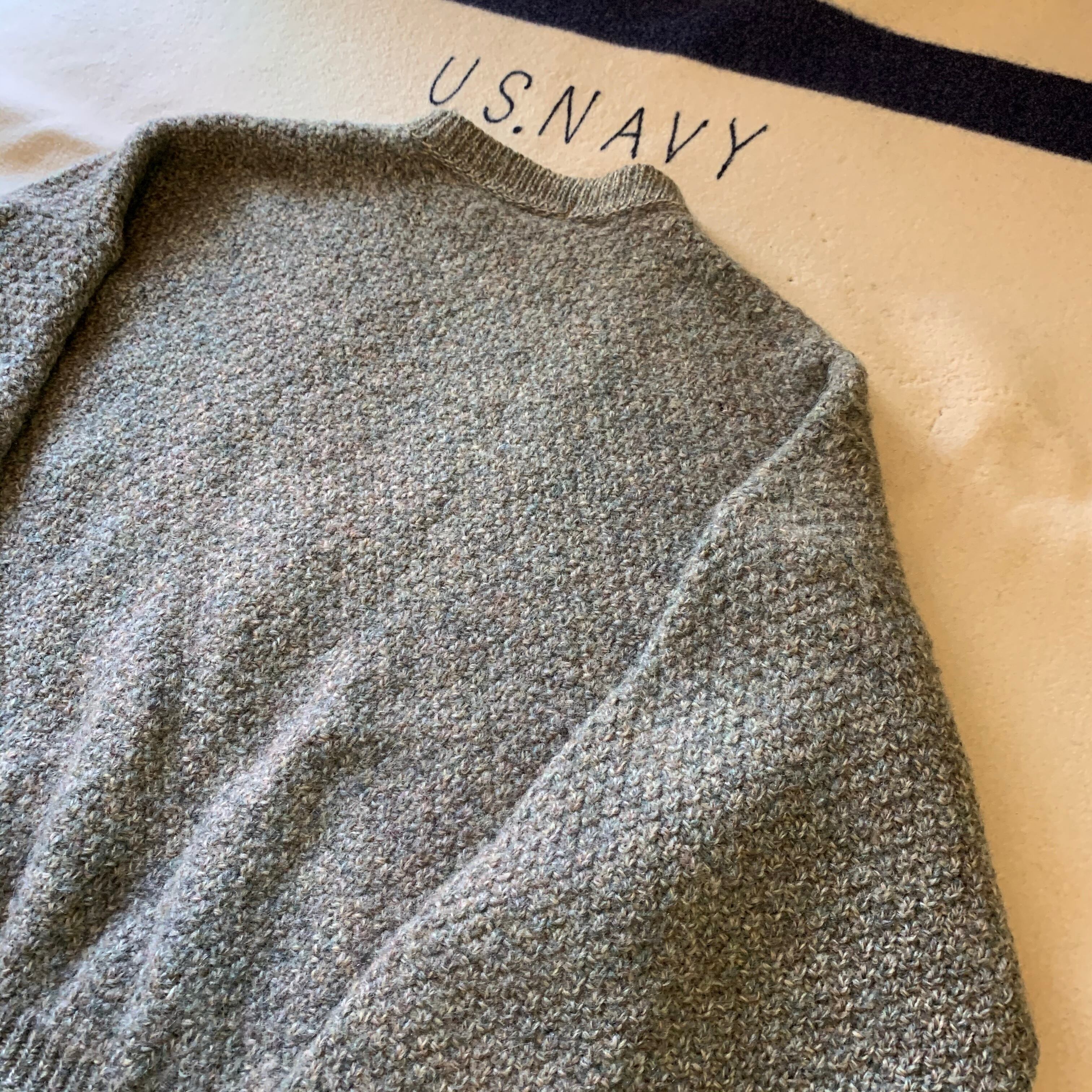 ANTARTEXというブランドのカーディガン。ケーブルニットセーターをカーディガンにしたタイプ。肉厚ウールです。made in ENGLAND。薄いグリーン系の色味にネップが飛んでヴィンテージらしい良いカーディガンです。