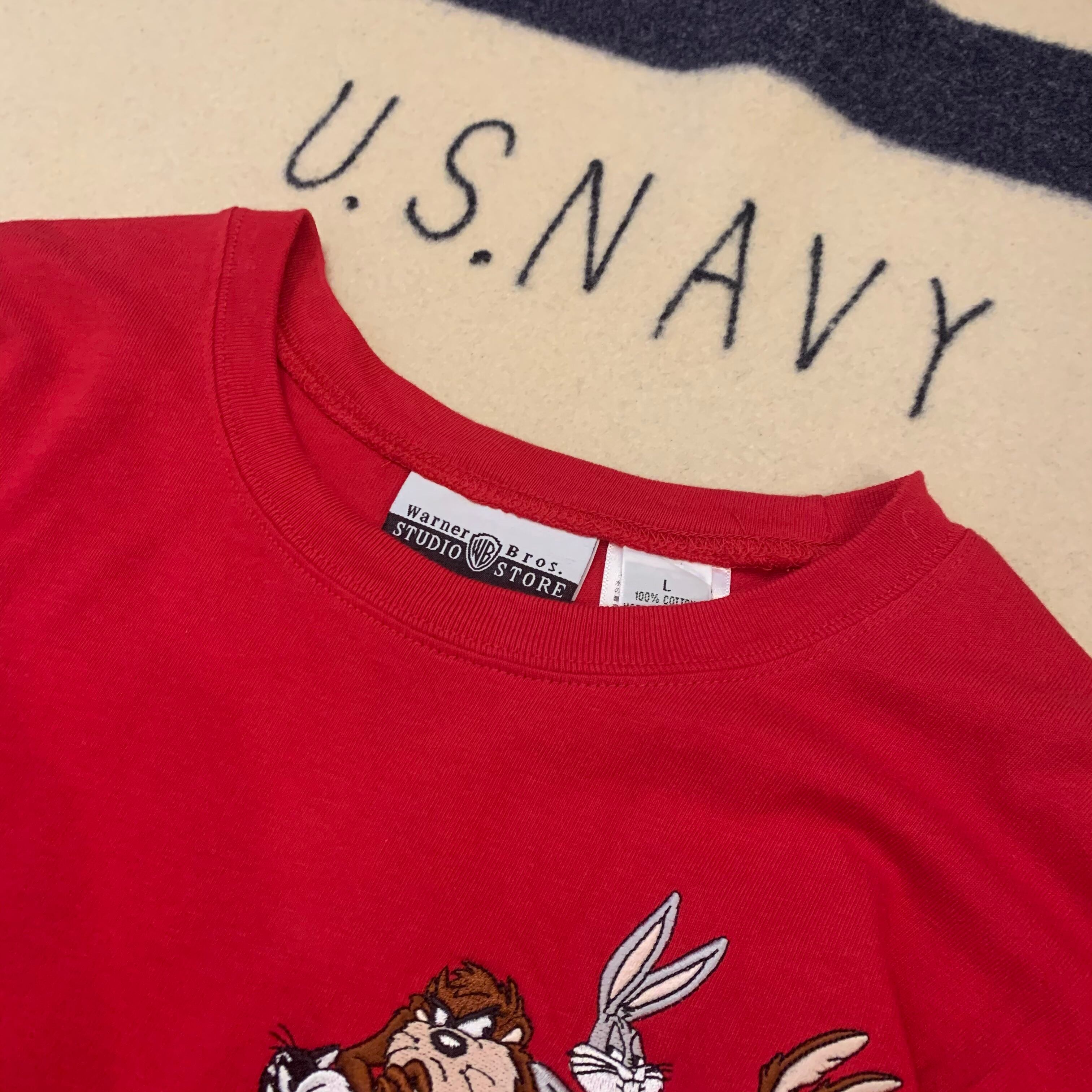 90s頃のWARNER BROSのヴィンテージポケT。バックスバニーらLOONY TUNESのメンバー勢揃いです。ビッグサイズ、カラーは明るめのレッド。使用感殆ど見られないですがフロントに若干の汚れあり。
