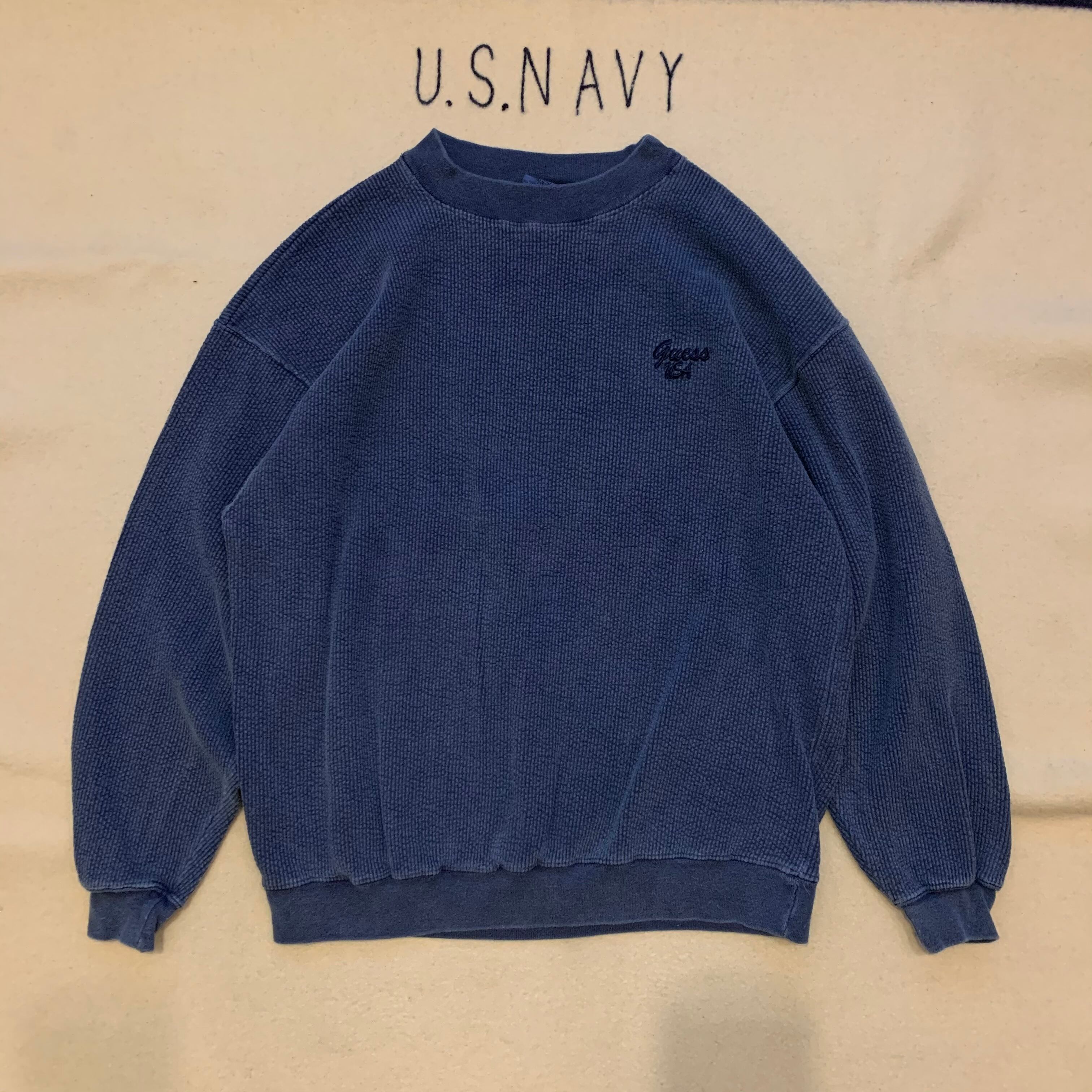 90s頃のGUESS。ワッフル系の凹凸ボディ、インディゴ染めのグッドレギュラー。古着特有の使用感が若干ありますが汚れや破れなく年代を考慮しても状態良好です。