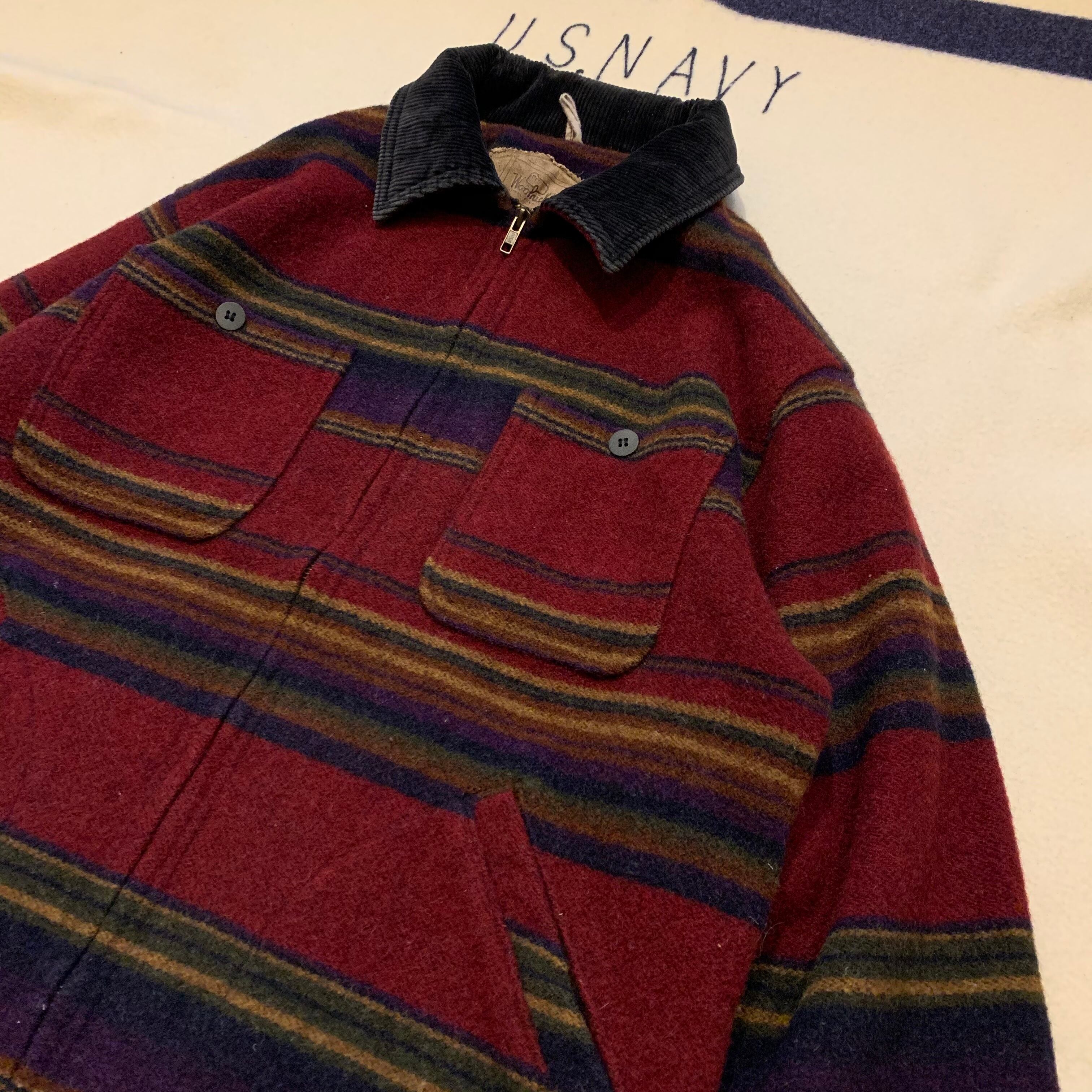 80s頃のwoolrich。ネイティブライクなウールブランケットボディのジップアップジャケット。襟のコーデュロイの切り替えしにセンスを感じます。