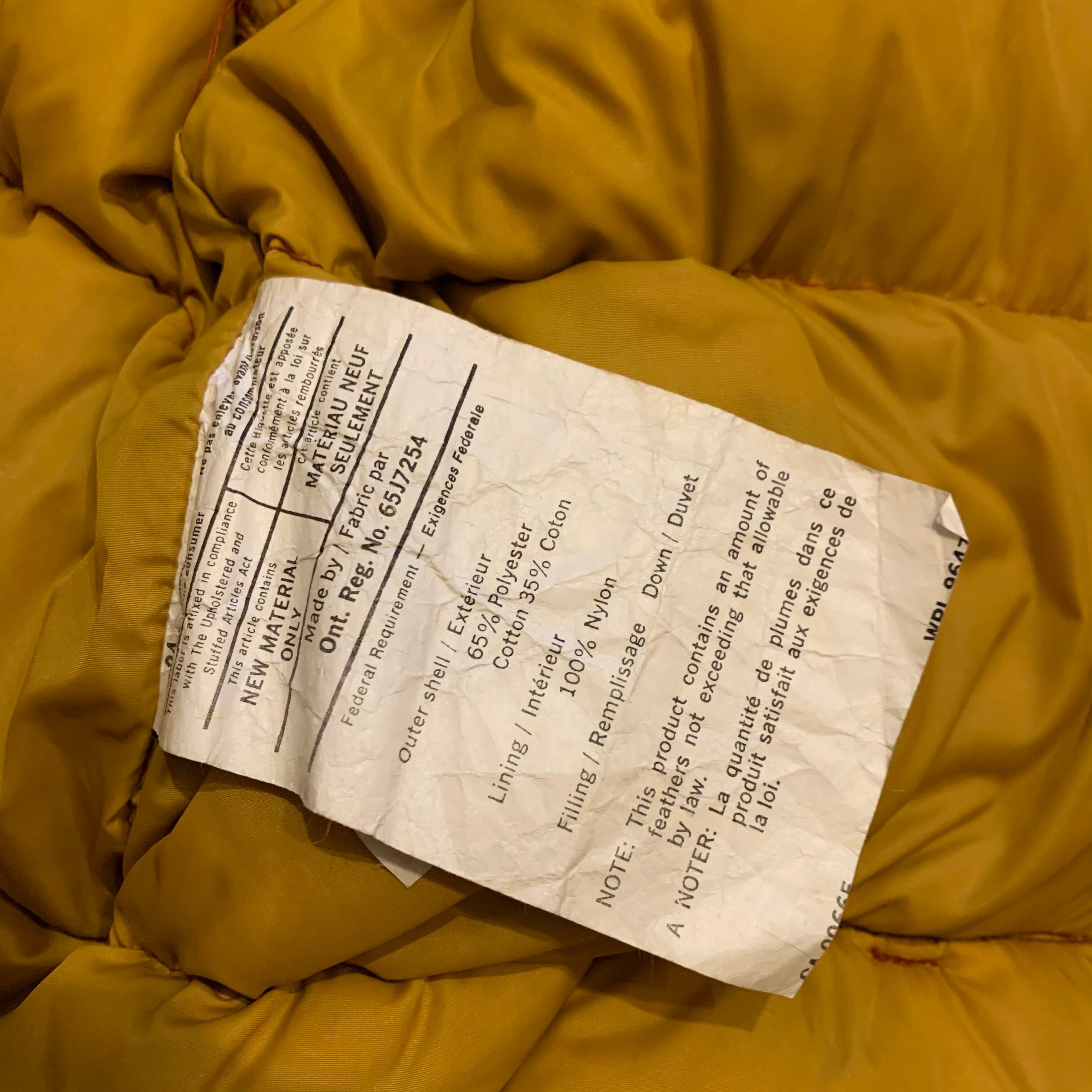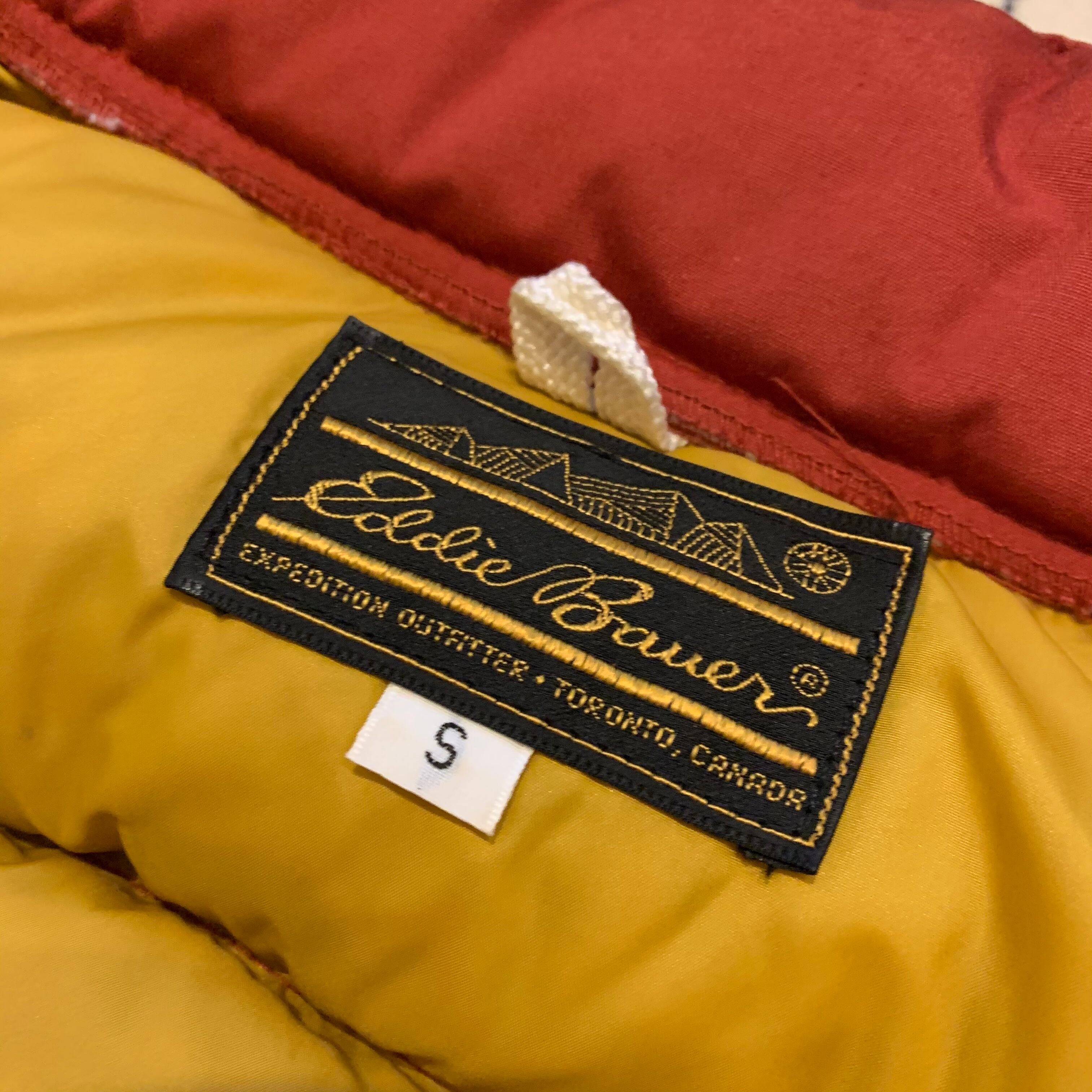 70s-80s頃のEddie Bauerダウンジャケット。ヴィンテージアウトドアらしいレンガ色のシェル、ライナーのテキーラゴールドがたまりません。ジップはダブルジップになっており70sの洋服によく見られるTalonジップがついています。