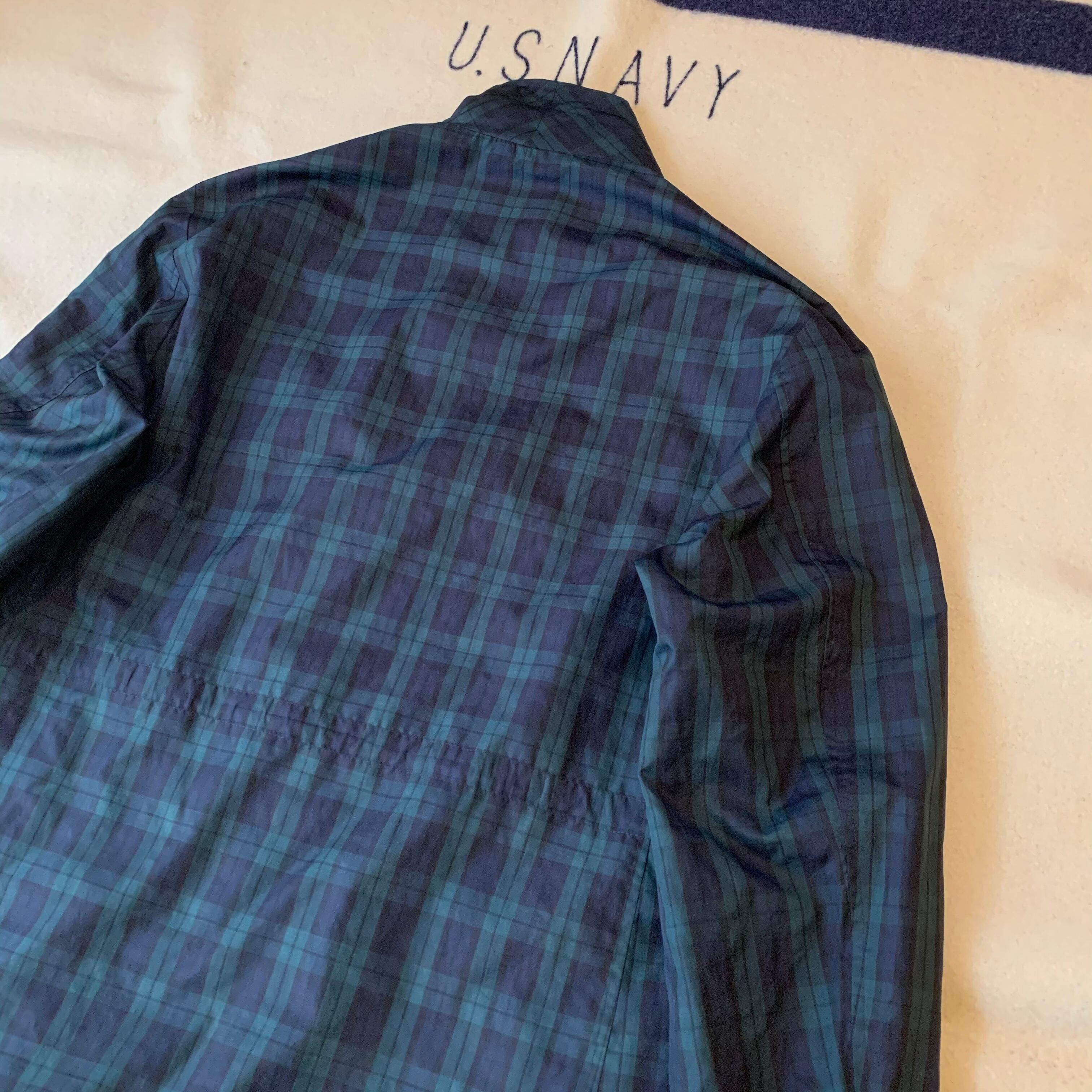 ブラックウォッチパターンのナイロンジャケット。たて襟にチンスト、フロントのフラップポケットにジップアップのポケットと細かい部分に洋服好きがぐっとくる要素満載です。