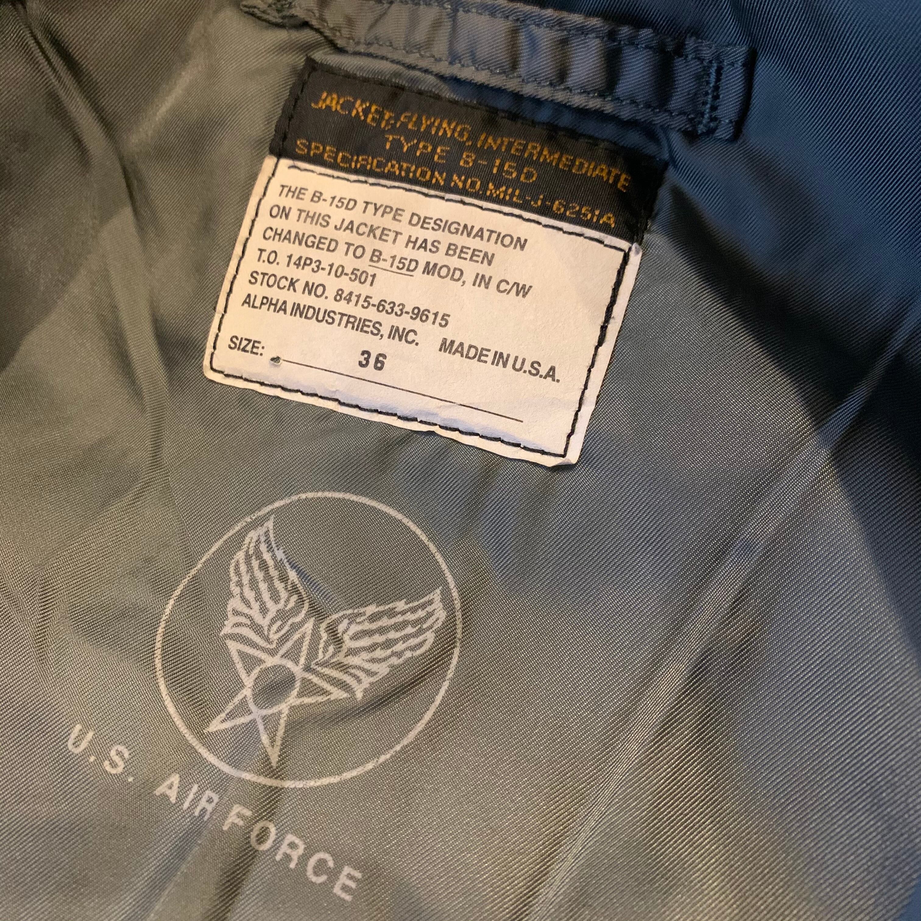 80sの後期から90sあたりにalpha社から復刻されたB-15D MODモデル。もともと襟にファーがあったモデルを一度回収しリブ襟にかえたいわゆるModifiedモデル。有名なやつです。MA-1の原型になったモデルです。