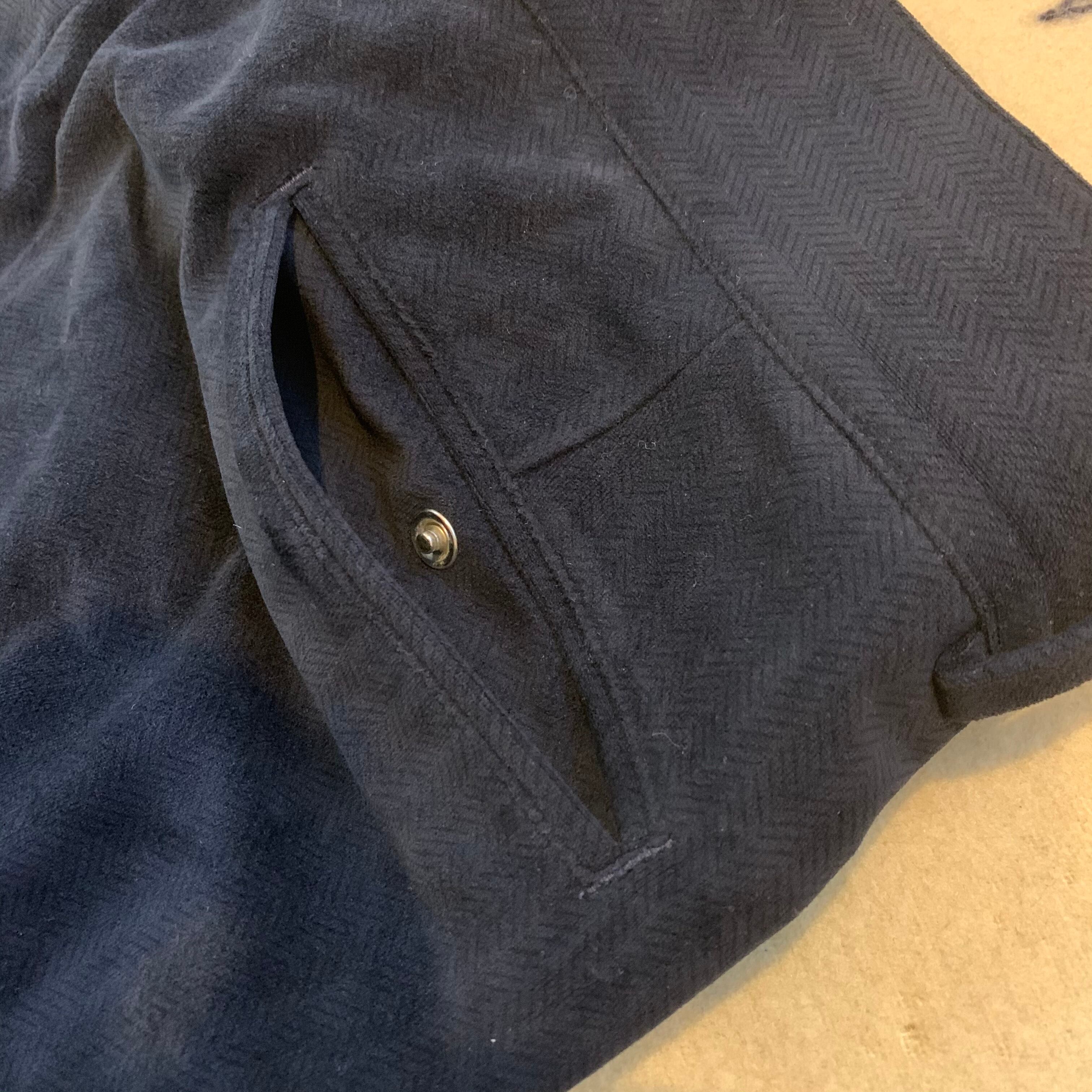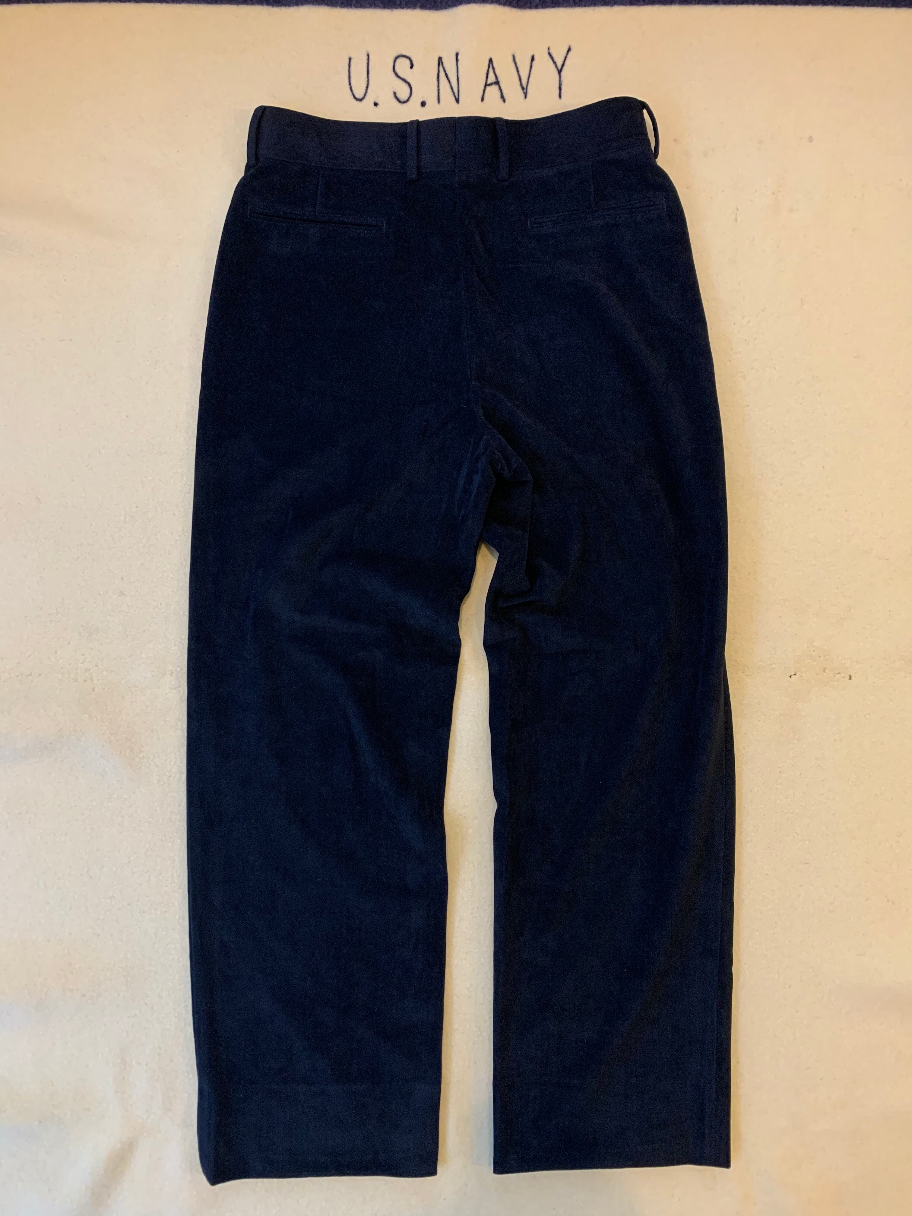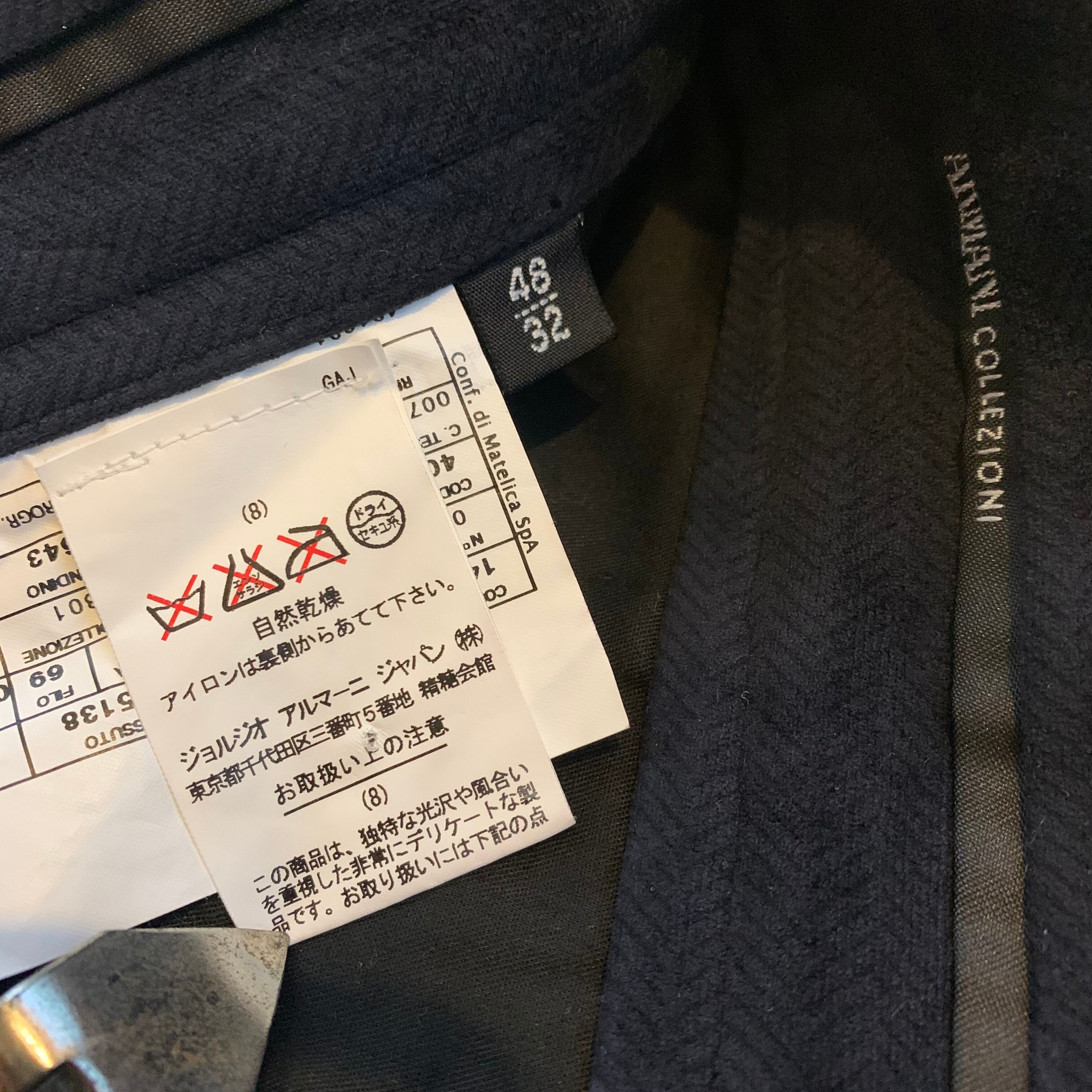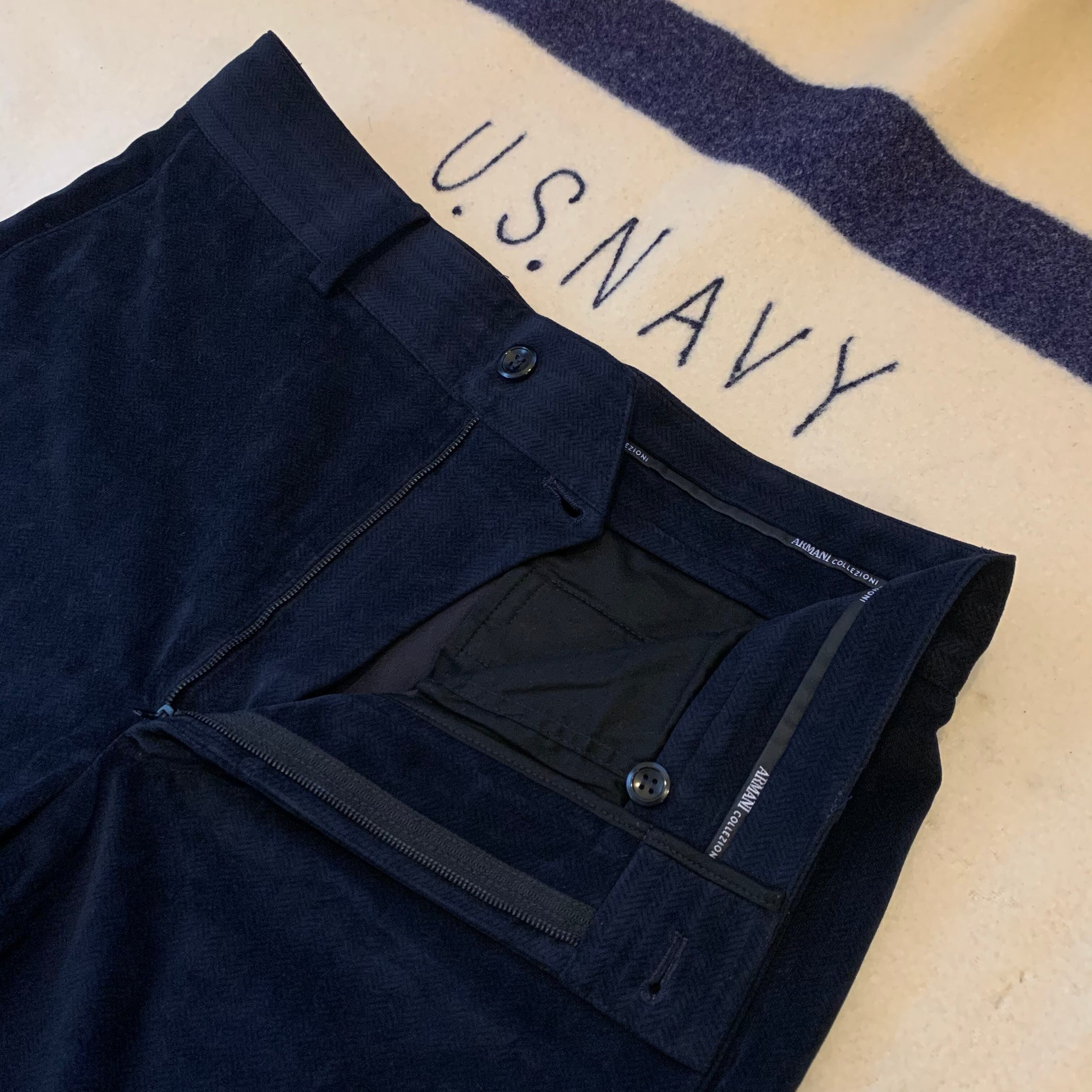 80s-90s頃のARMANI COLLEZIONIラインのベロアパンツ。ノータックで太めの綺麗なシルエットです。ベロアになることで高級感増します。カラーは濃いネイビー。