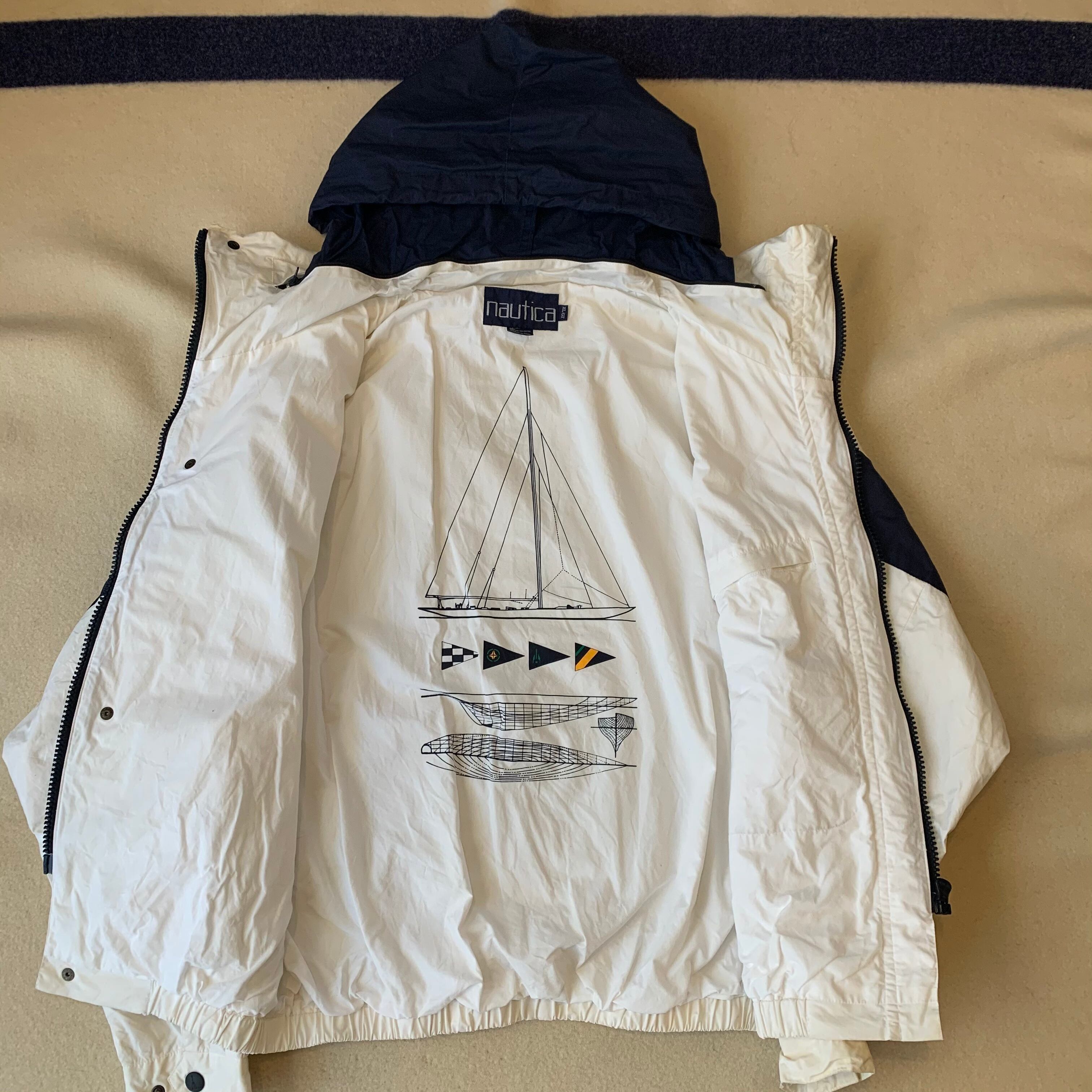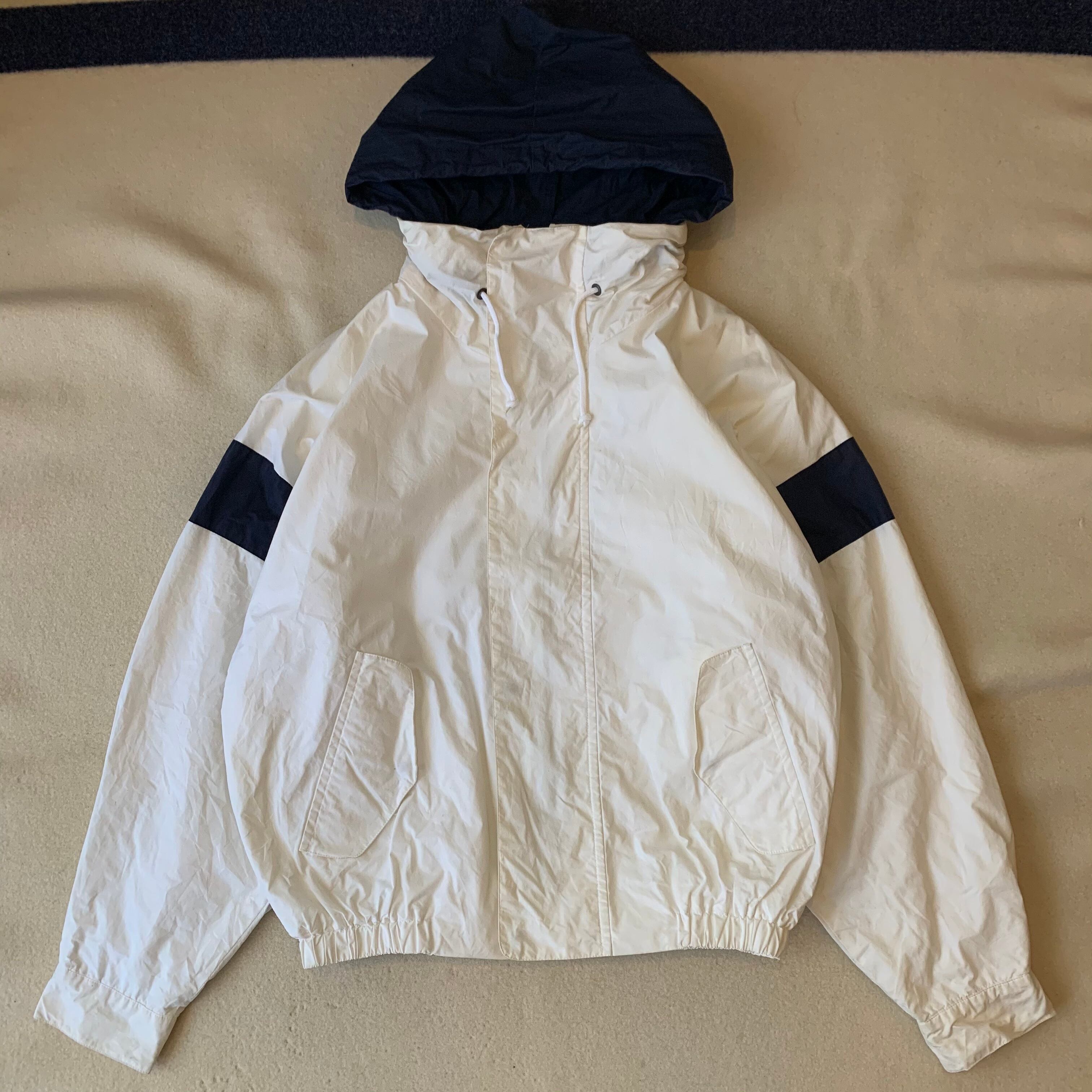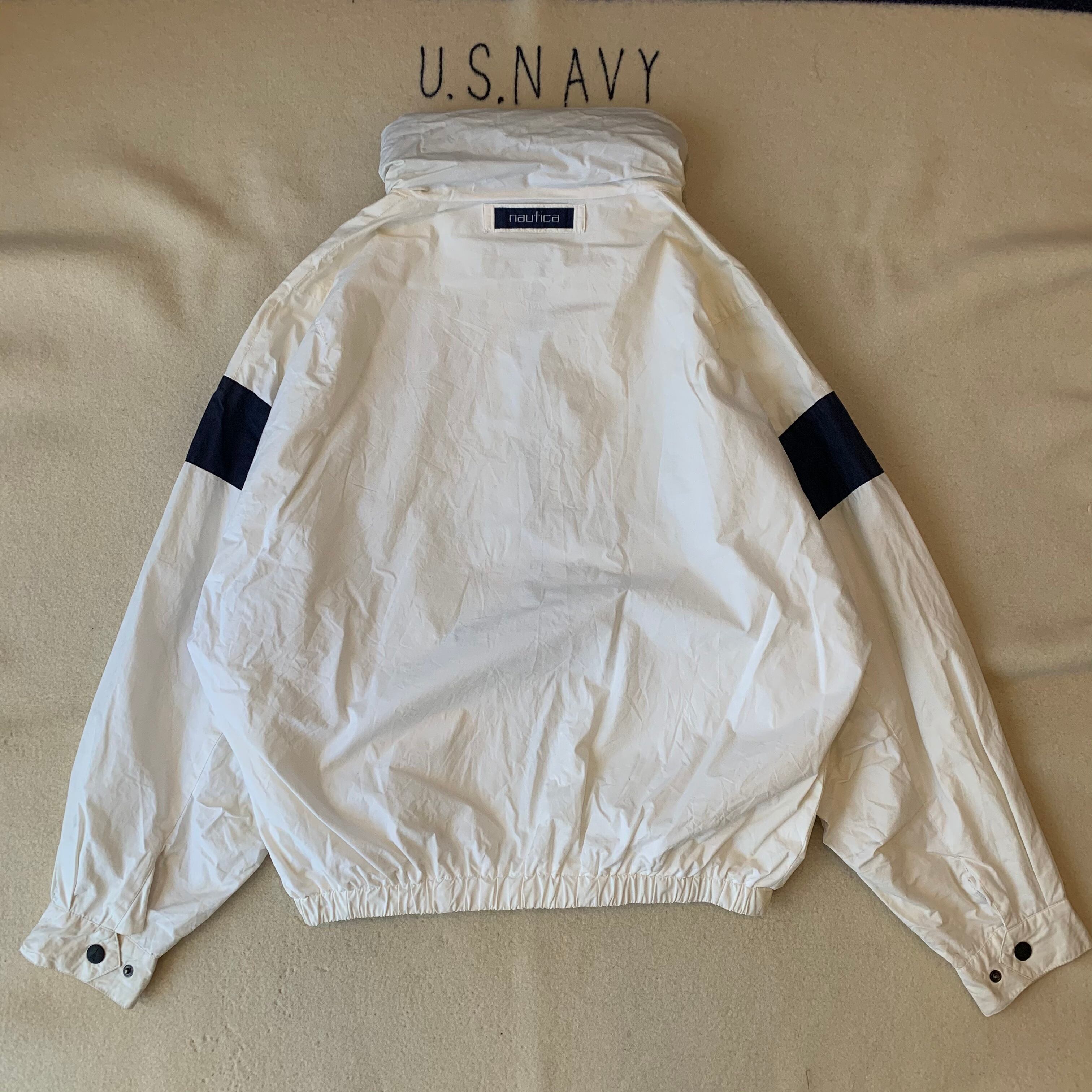 90s頃のNAUTICAのセーリングジャケット。ホワイトベースのコットン100%ボディ。両腕にネイビーの切り替えし、襟口に収納可能なフードが付いています。シンプルで良い感じです。