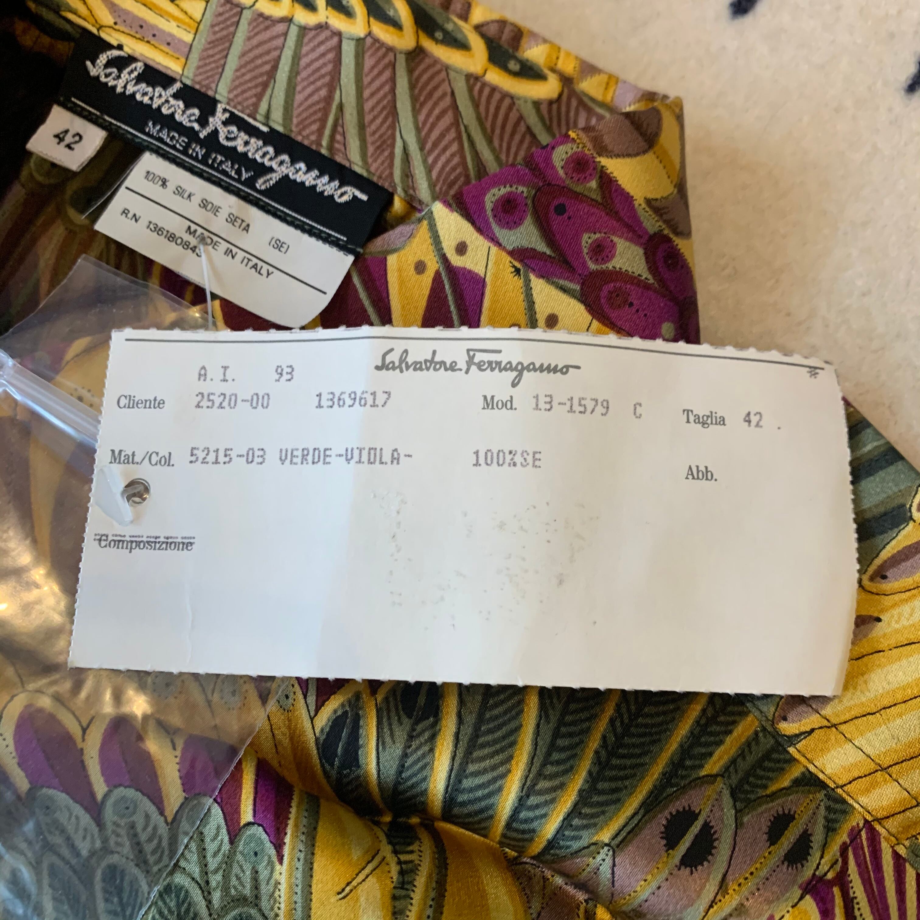 80s頃のSalvatore Ferragamo。当時のフラッシャー付き、デッドストックです。シルク100%、総柄のデザインは孔雀モチーフと思います。40年前とは思えないセンスです。