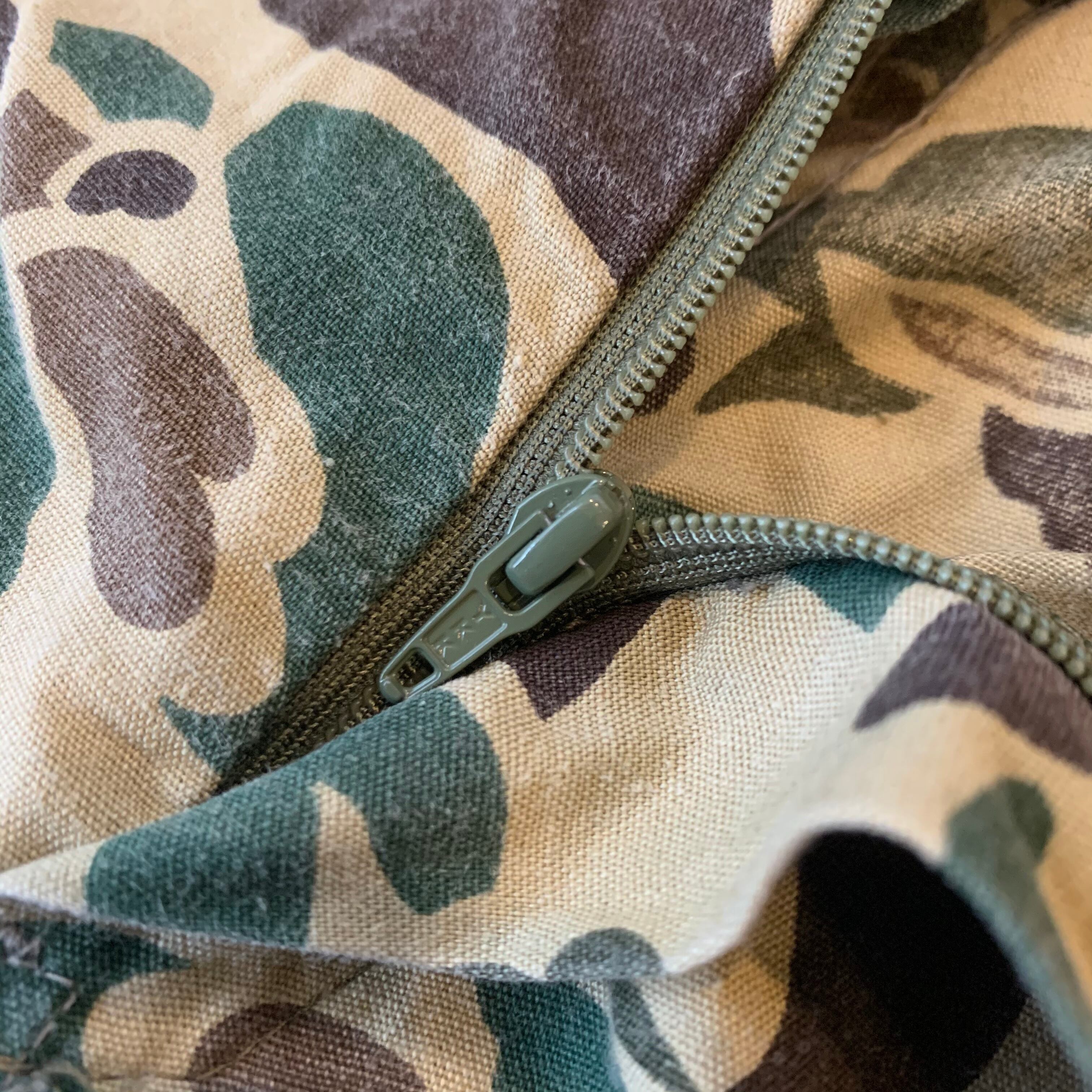 薄手のコットン地のハンティングパンツ。ダックハンターカモ、フロッグスキンにグッときます。太めのシルエット。ロールアップしてもかわいいと思います。