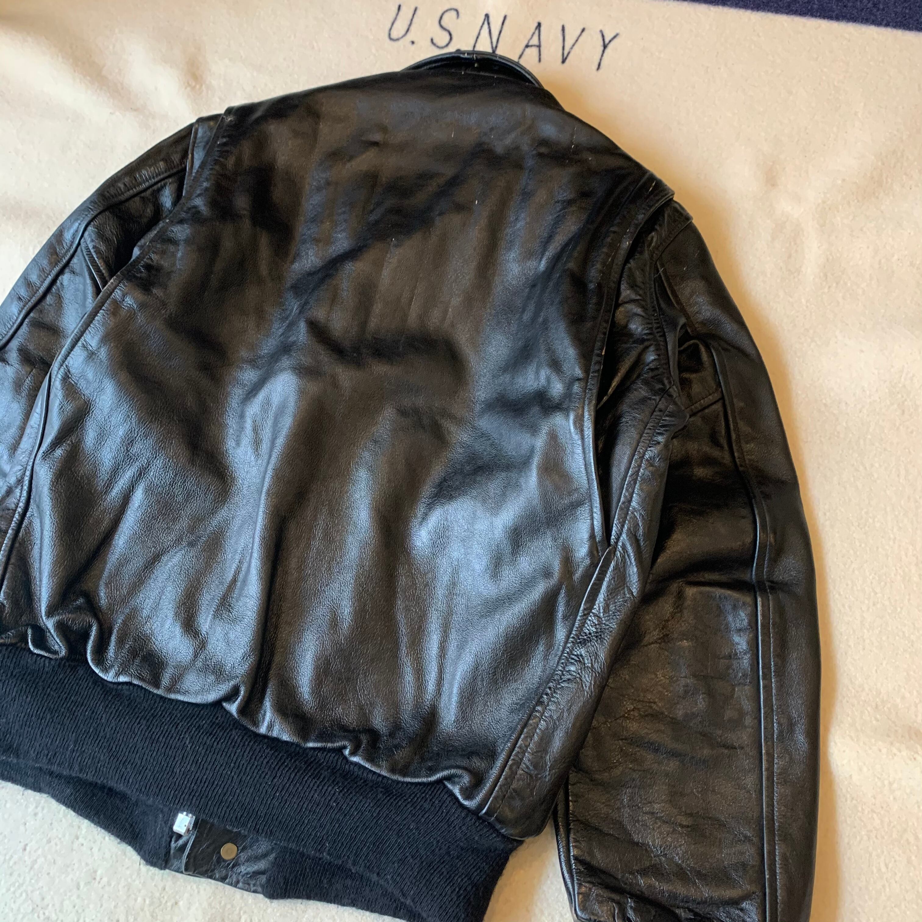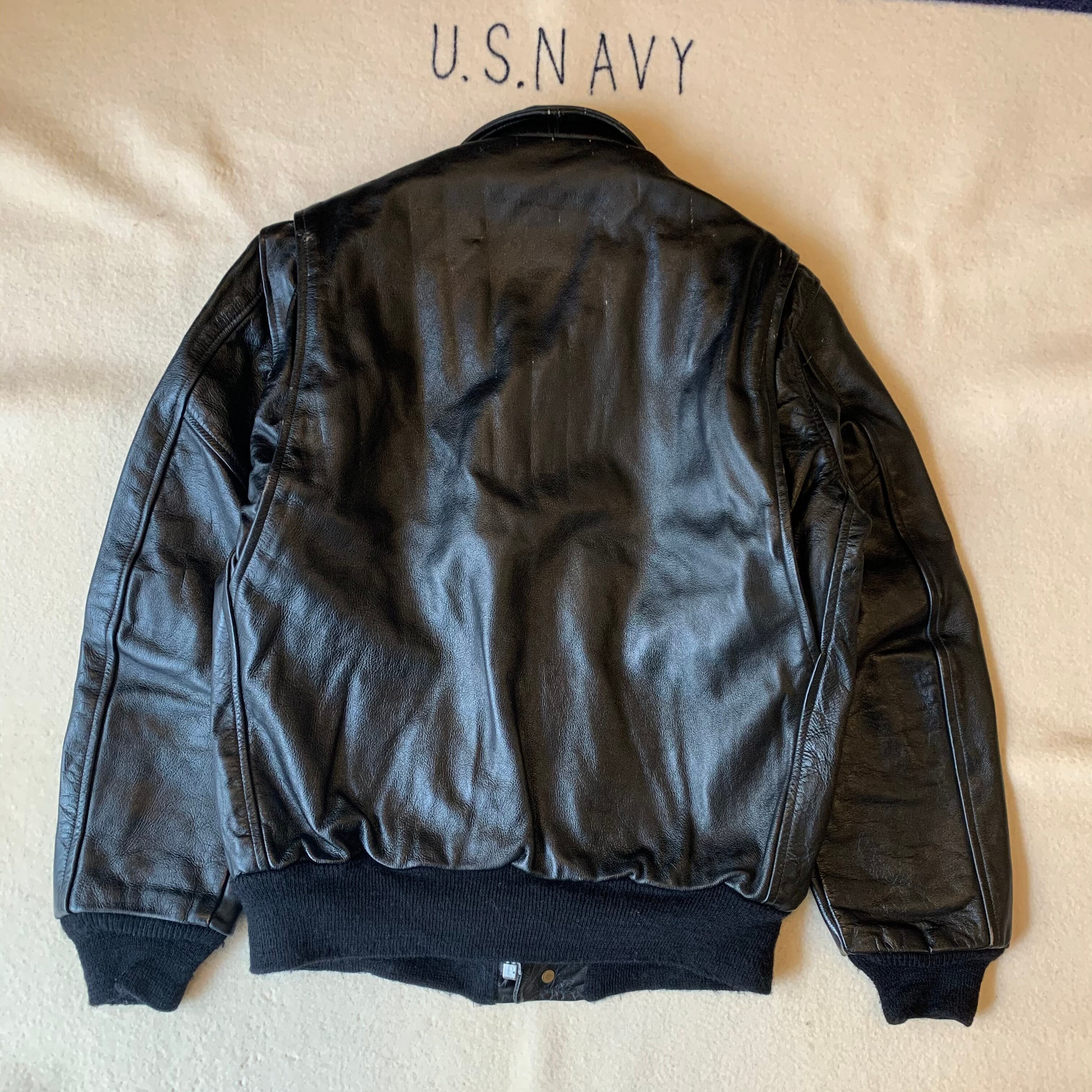 今のシルエットだとA2に近いです。カラーはブラック、肉厚レザーです。リブに破れやボディに汚れなく年代を考慮しても状態良好と思います。オイルいれてます。
