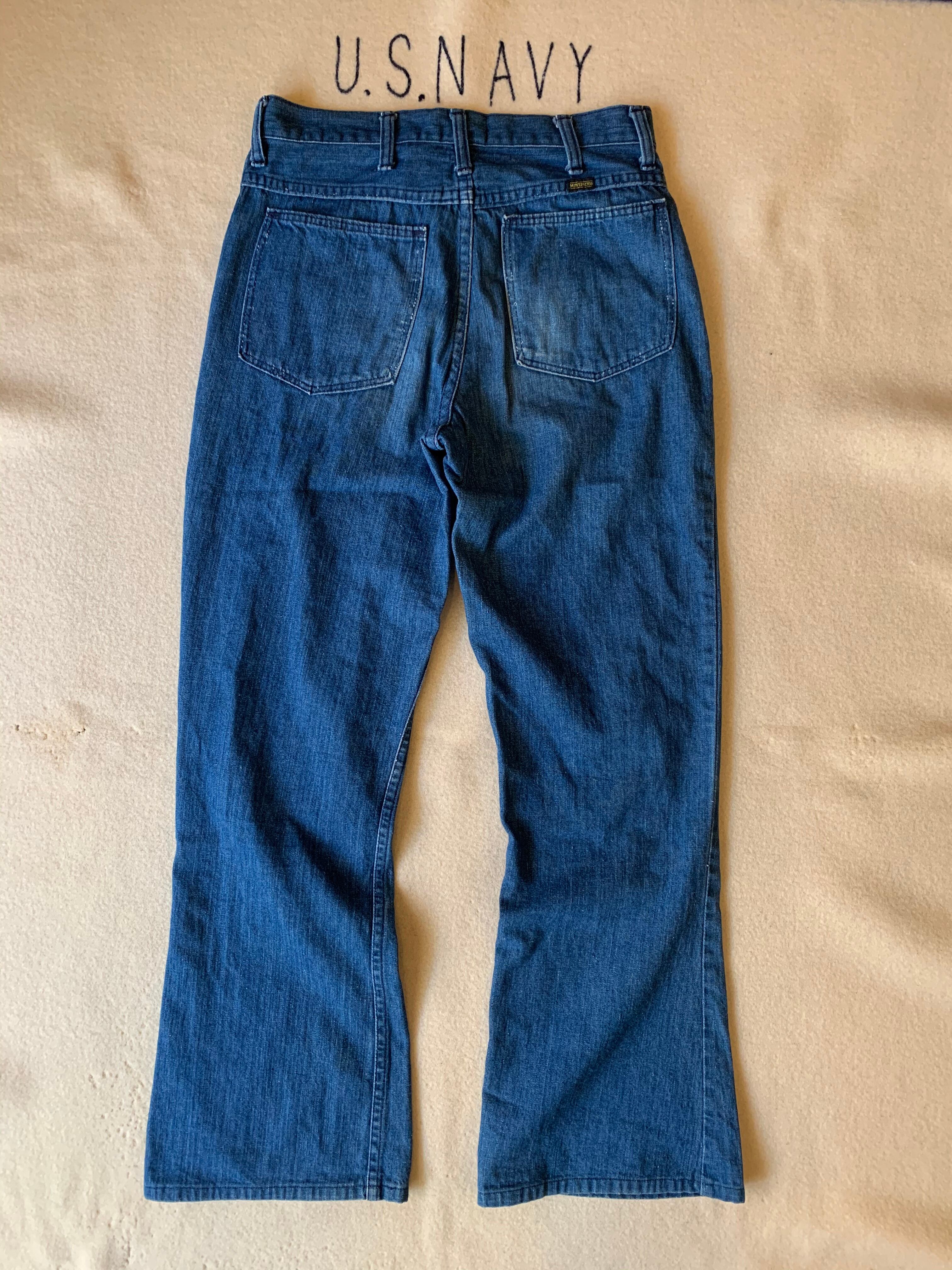 フロントのポケットのつき方はUS NAVYのデッキパンツのそれです。オンスの感じも似ていると思います。フレアの感じはリーバイスの646くらいのフレア感。これからいい色落ちすると思います。