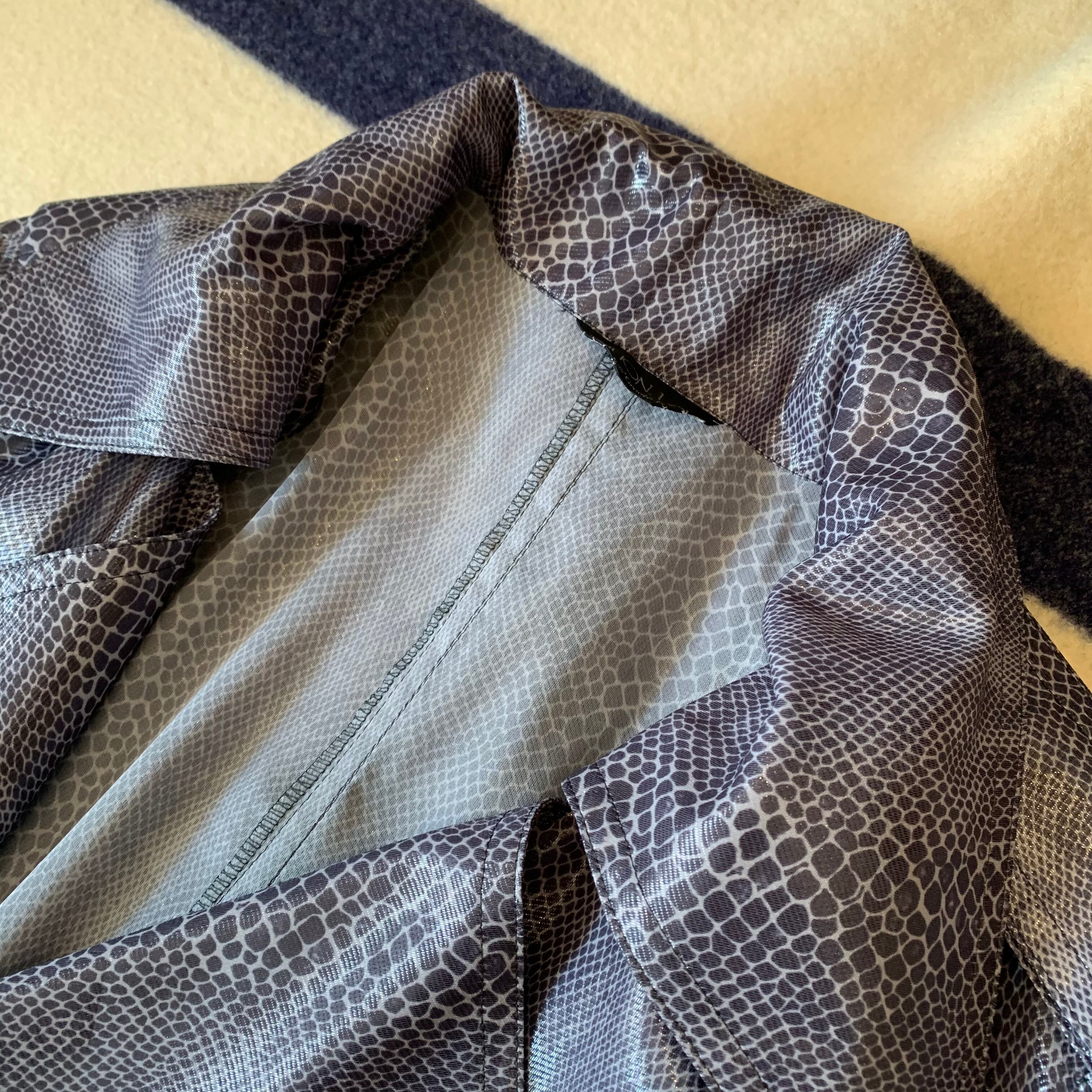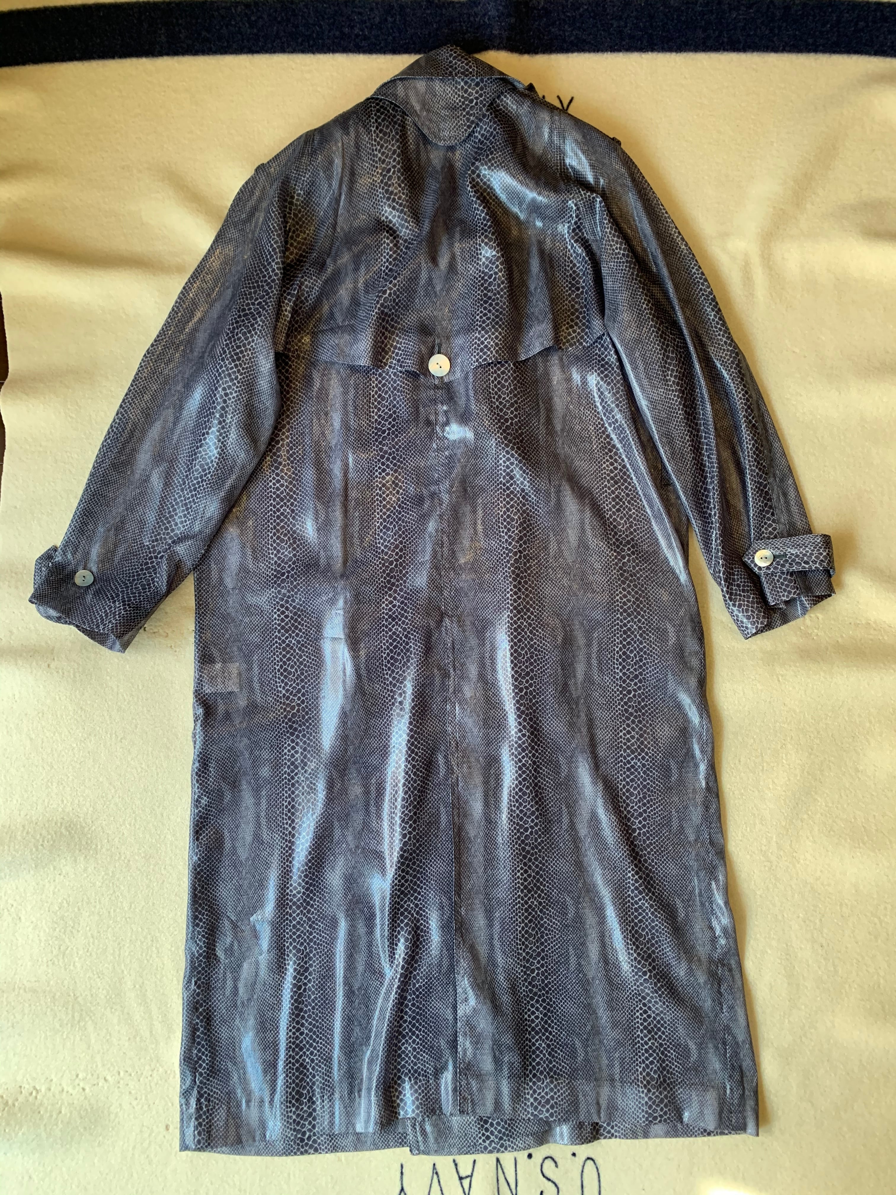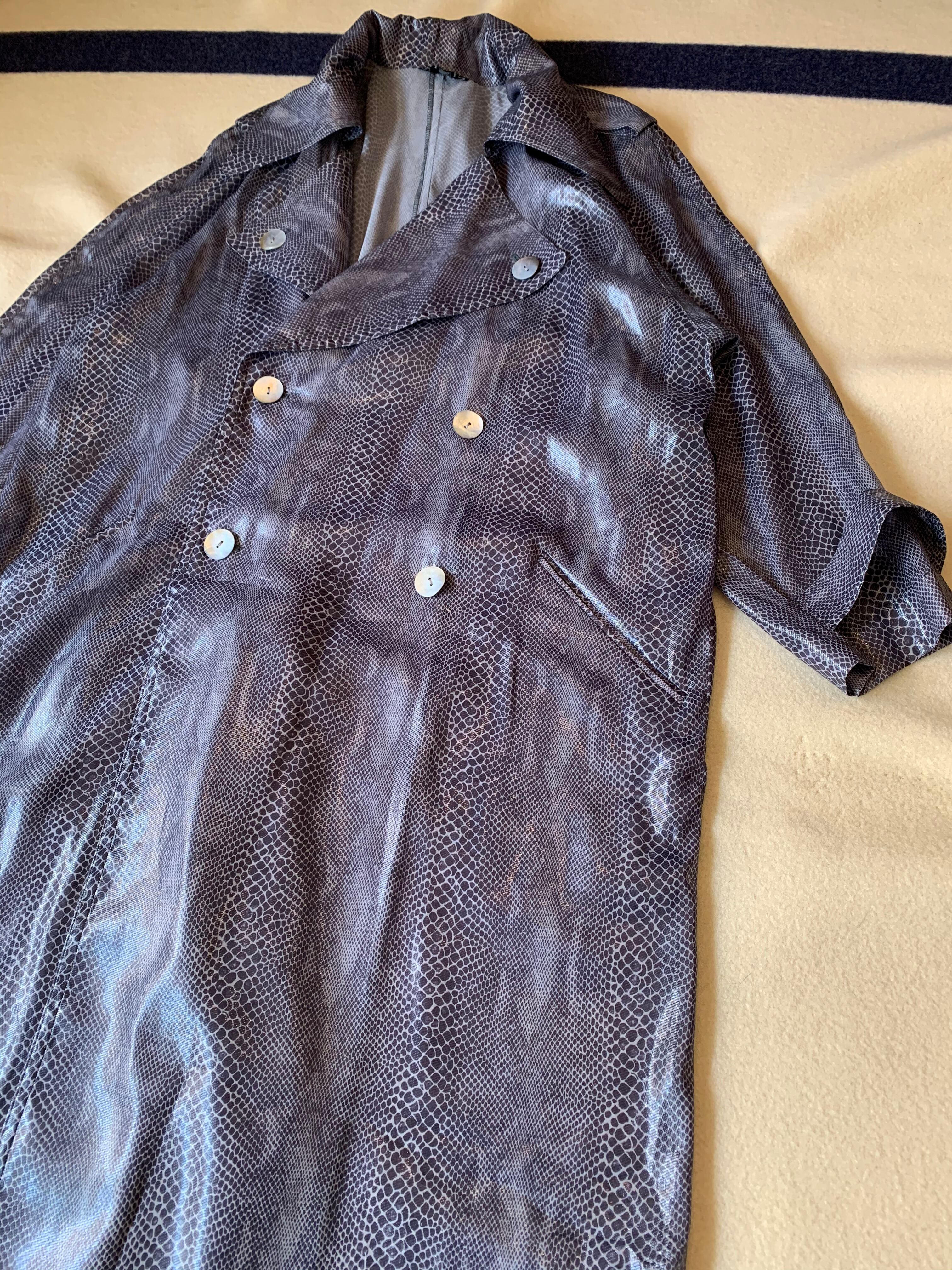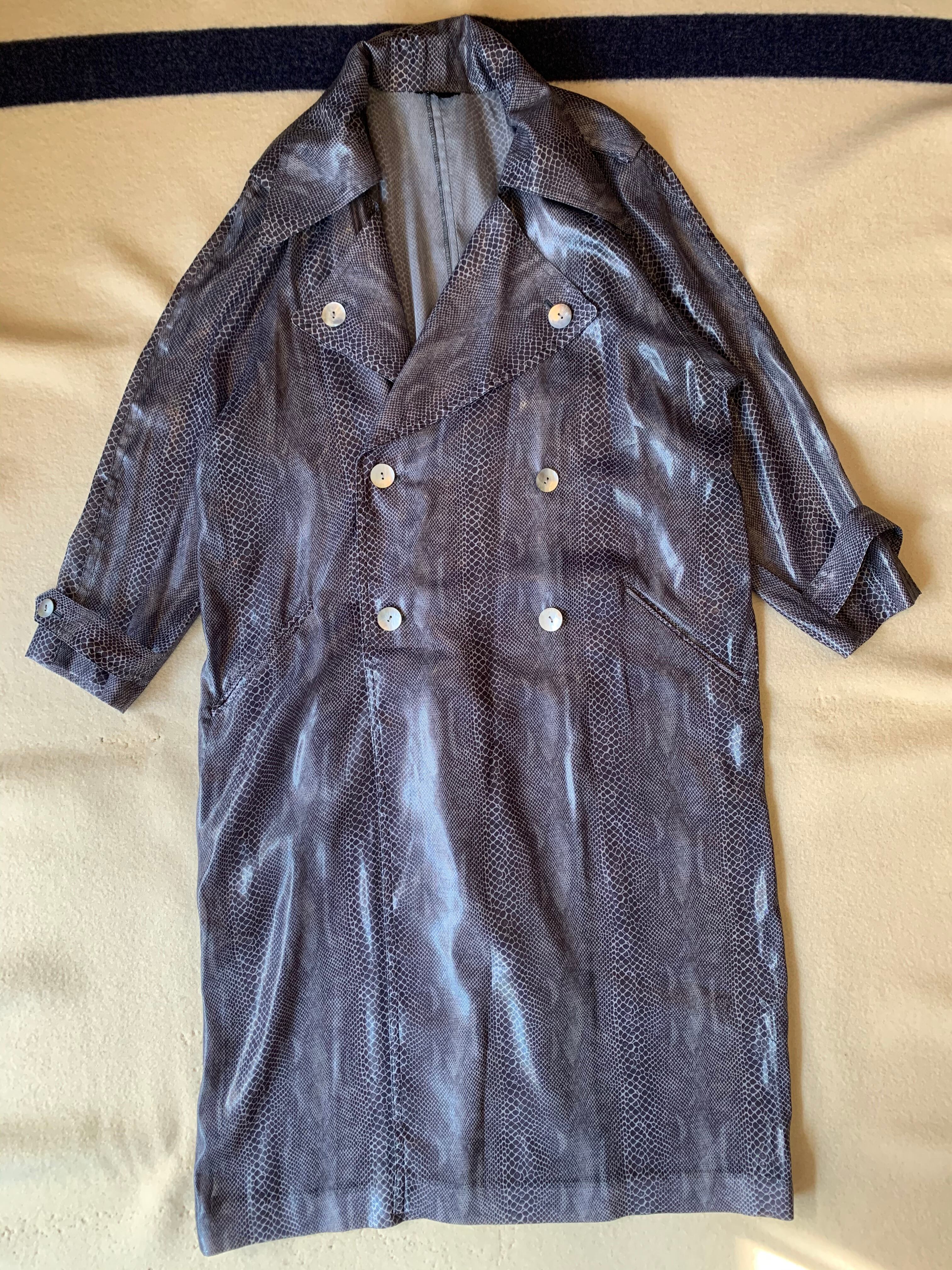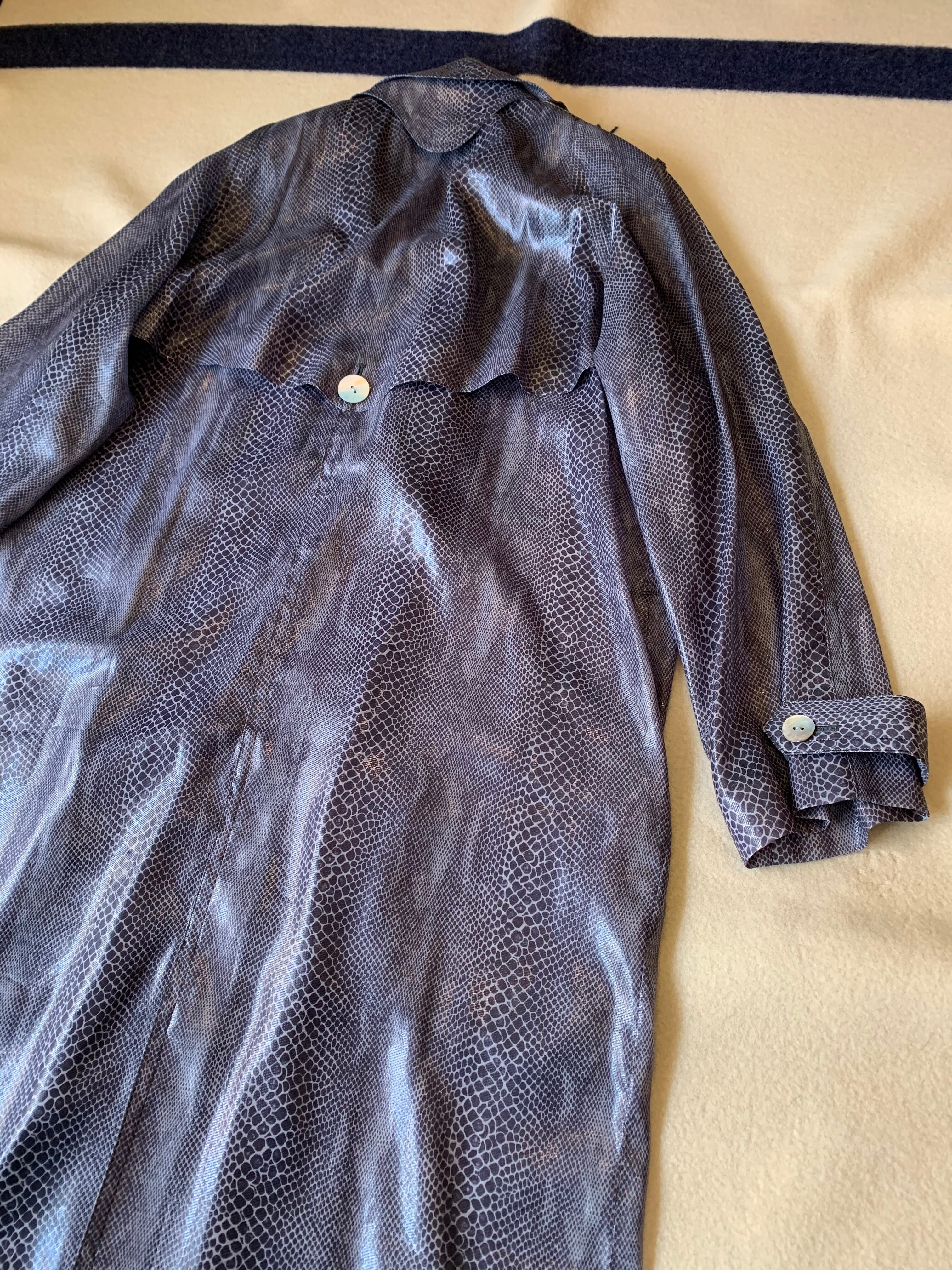 秀逸なデザインです。薄手の艶やかなポリエステル地にヘビ柄がプリントされたトレンチコート。80s-90s頃のものと思います。