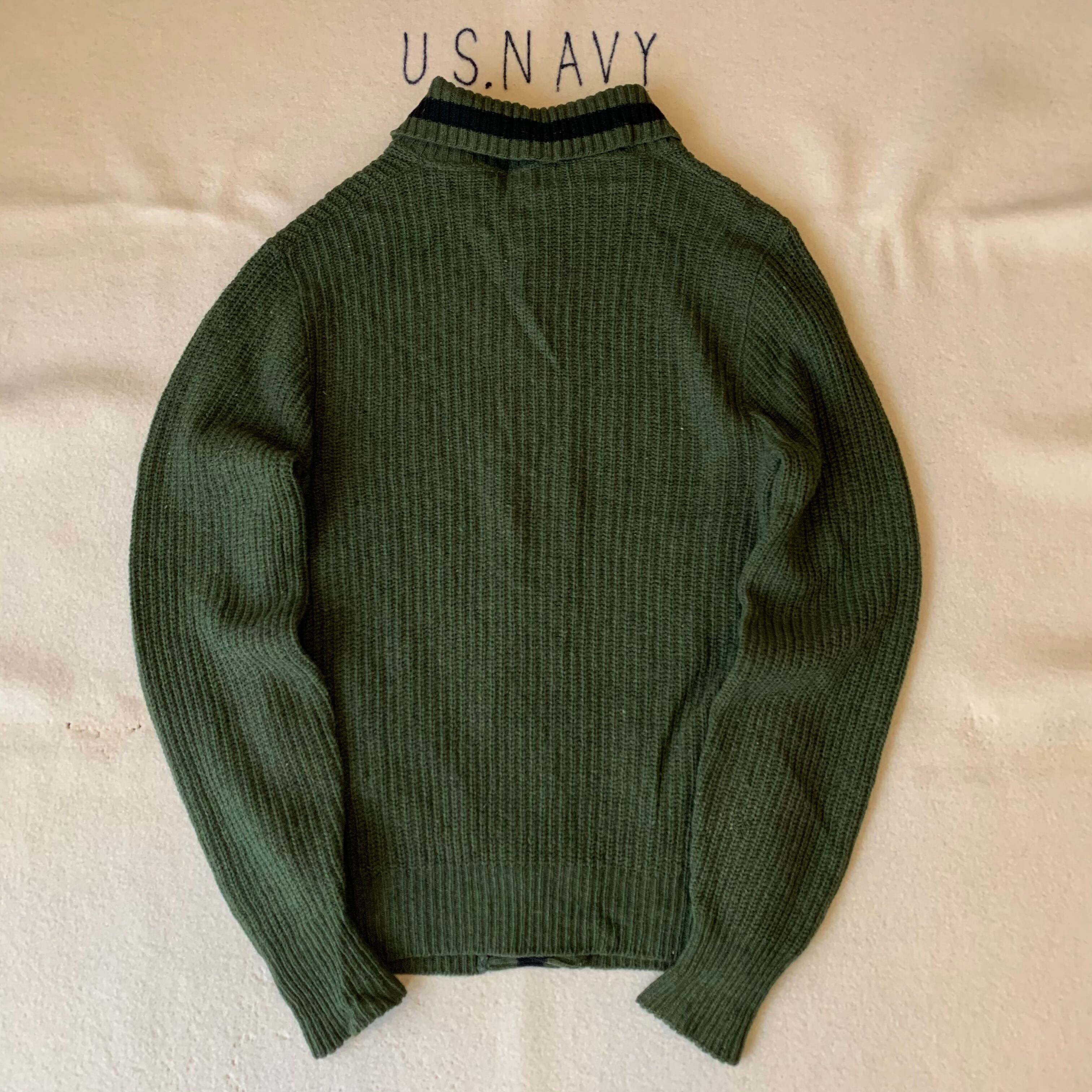 60s後期-70sあたりのヴィンテージカーディガン。モスグリーンベースにブラックのパイピングがいい感じです。