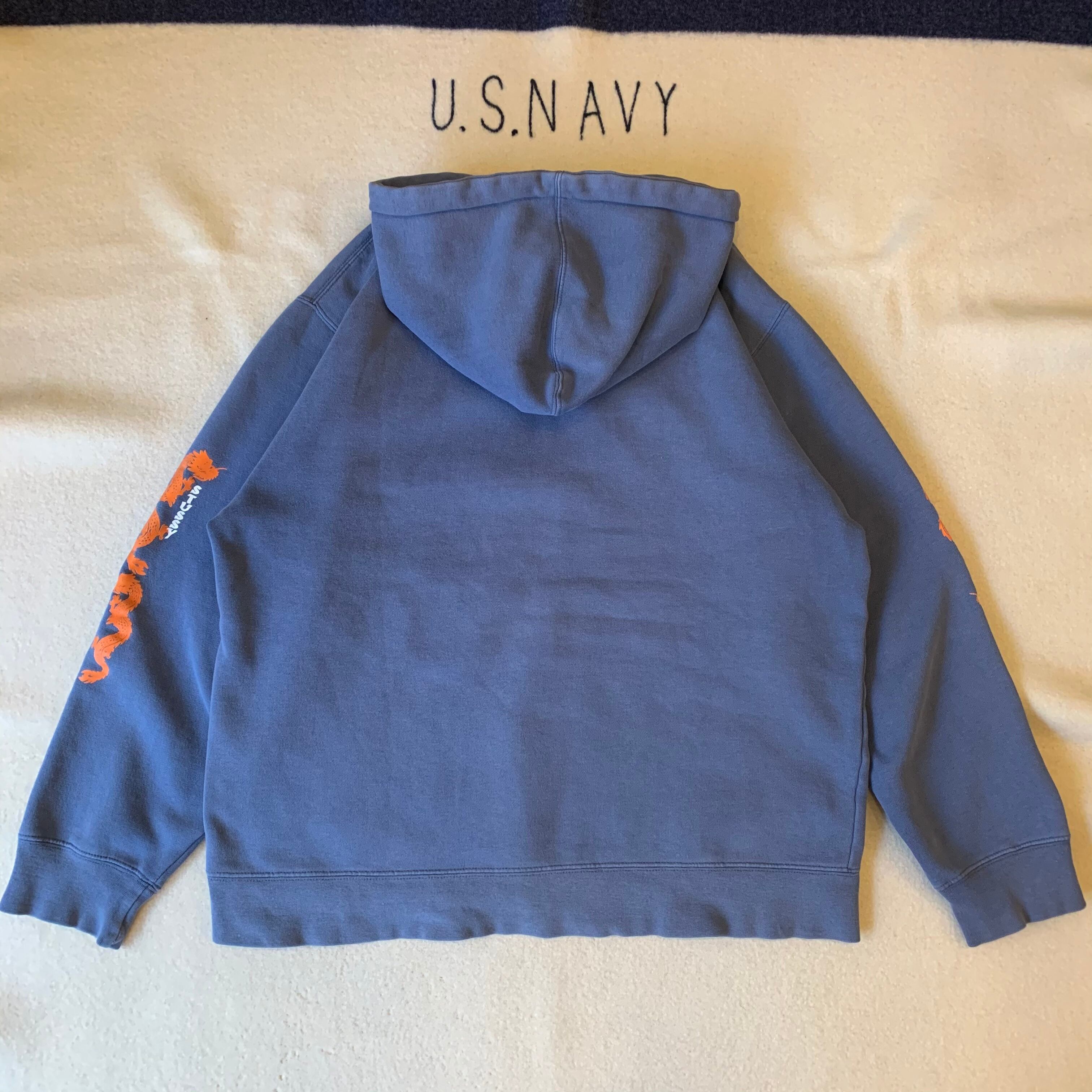 90s後期-00sあたりのOLD stussy。stussyでも名作と呼ばれるドラゴンモチーフ。サイドの上り龍がcoolです。カラーは薄めのブルー。この手のヴィンテージでは珍しく汚れ破れ無く状態良好の一着です。