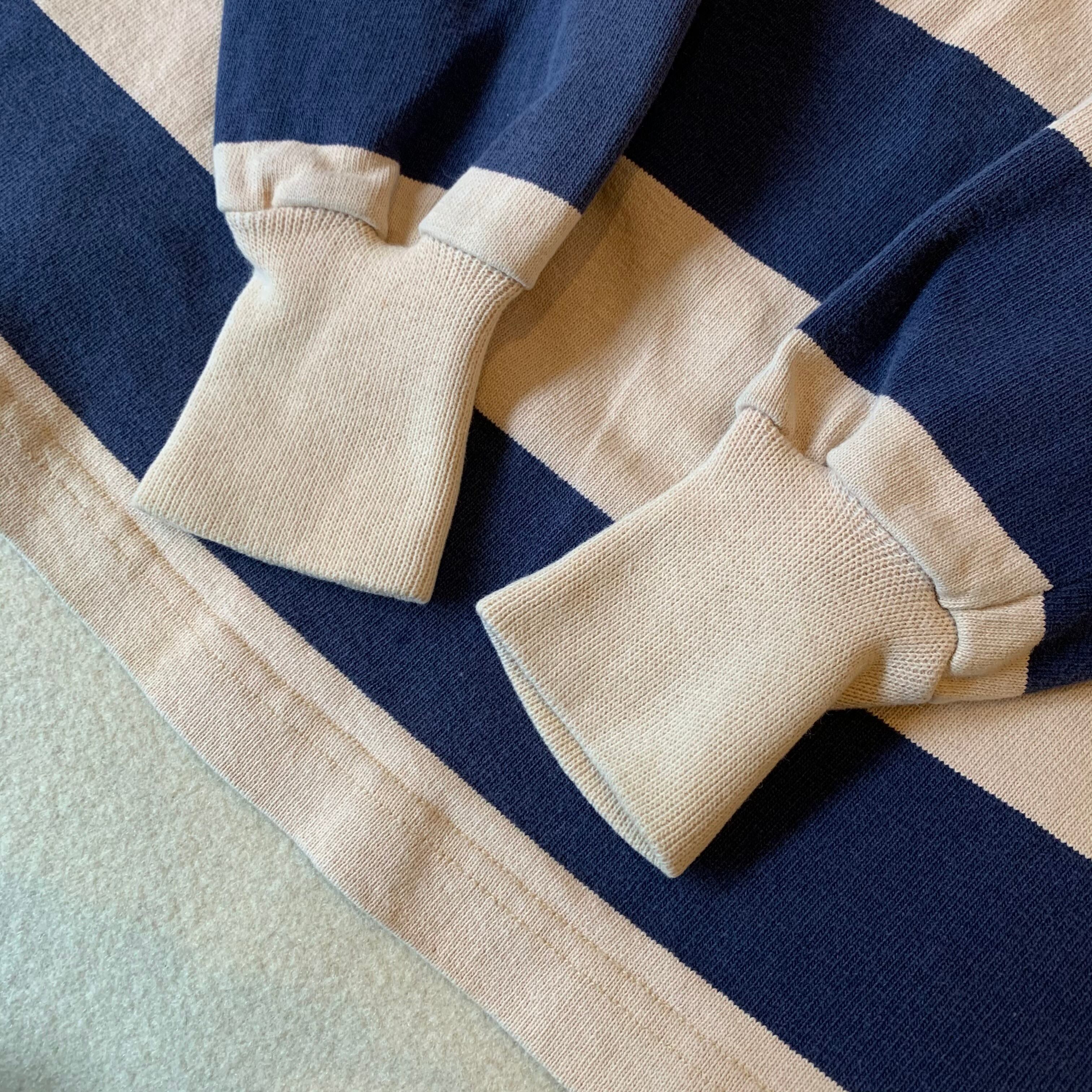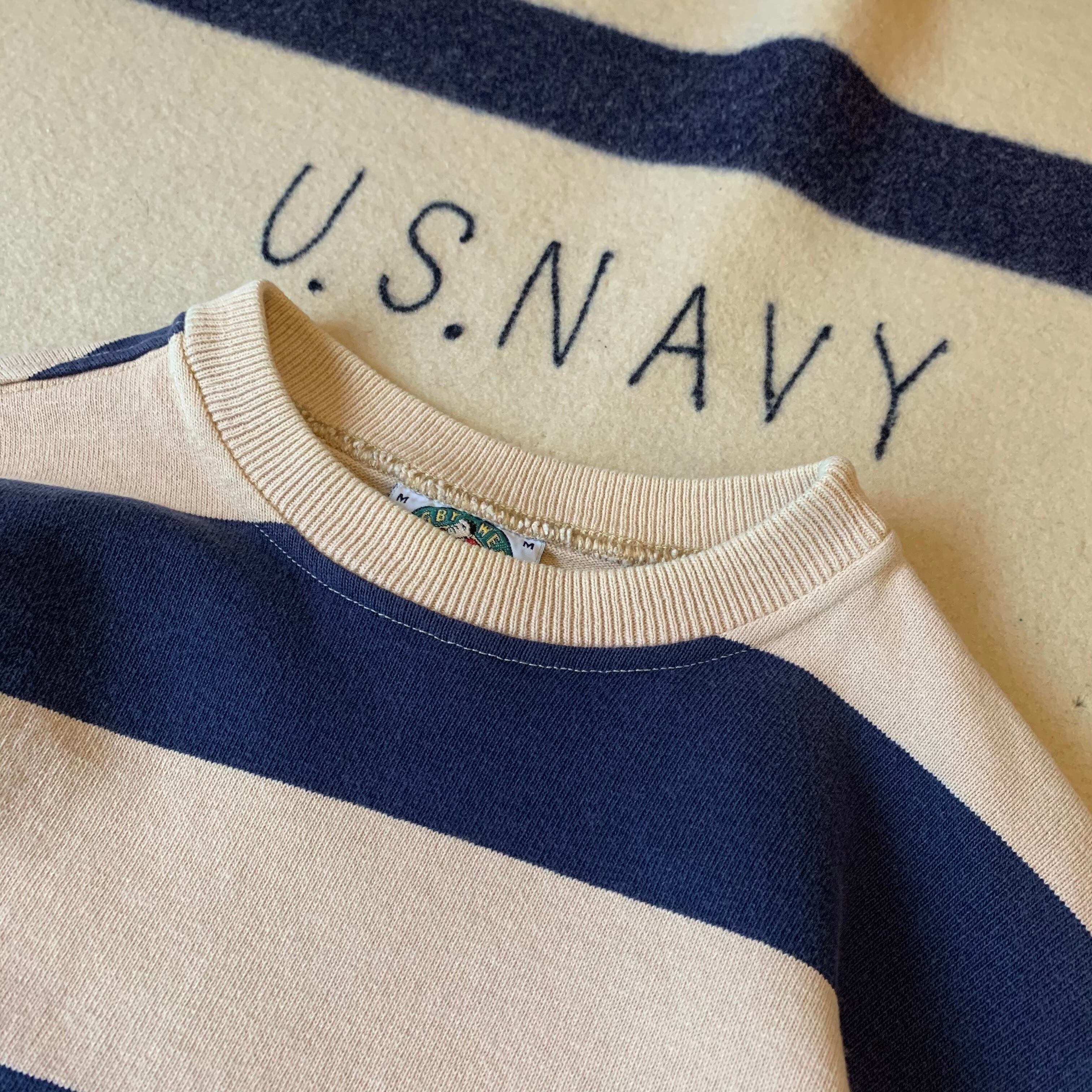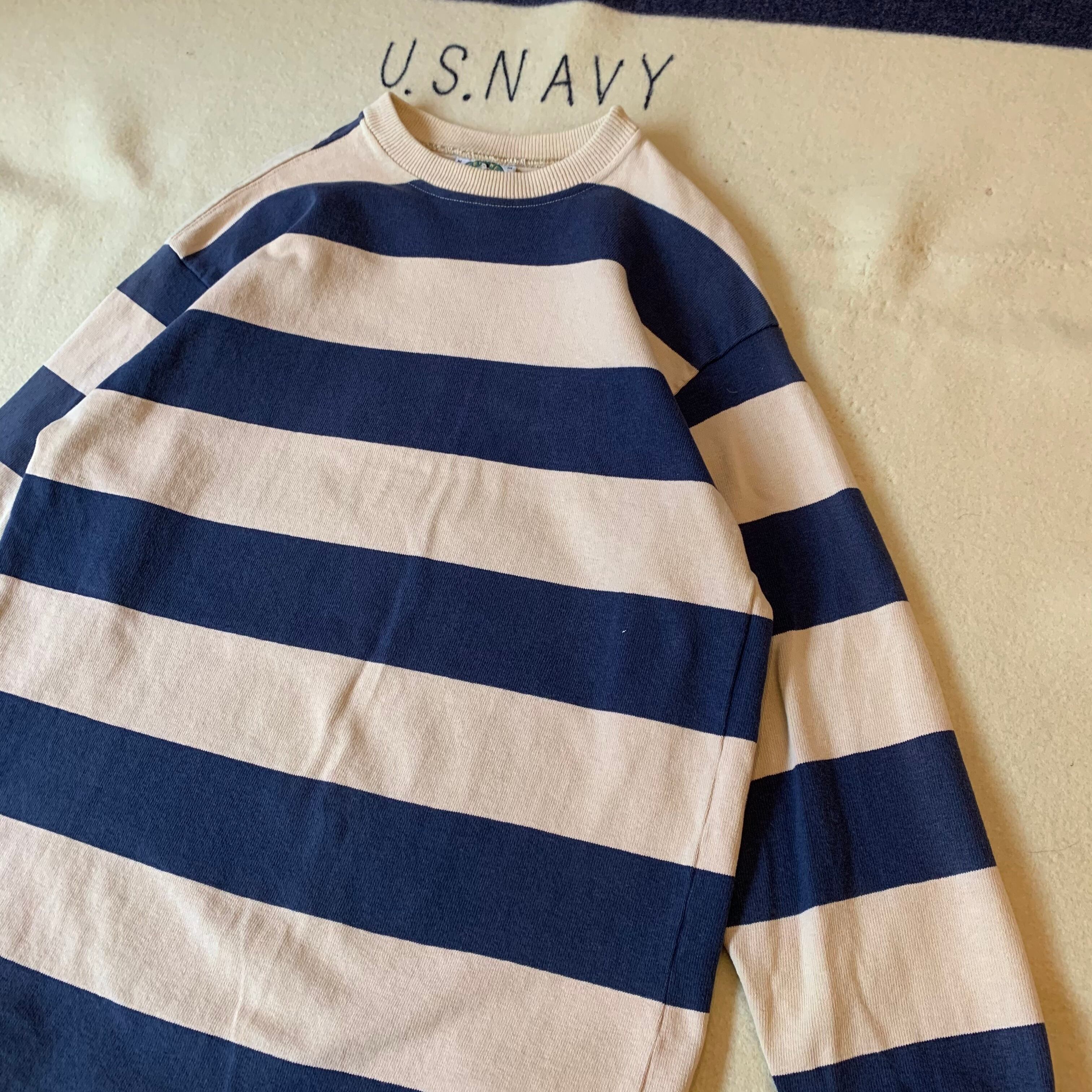 正直こっちの方が着回し効くと思います。ガシッとしたコットン地で着心地もgood。カラーはクリーム系×ネイビーのボーダーパターン。